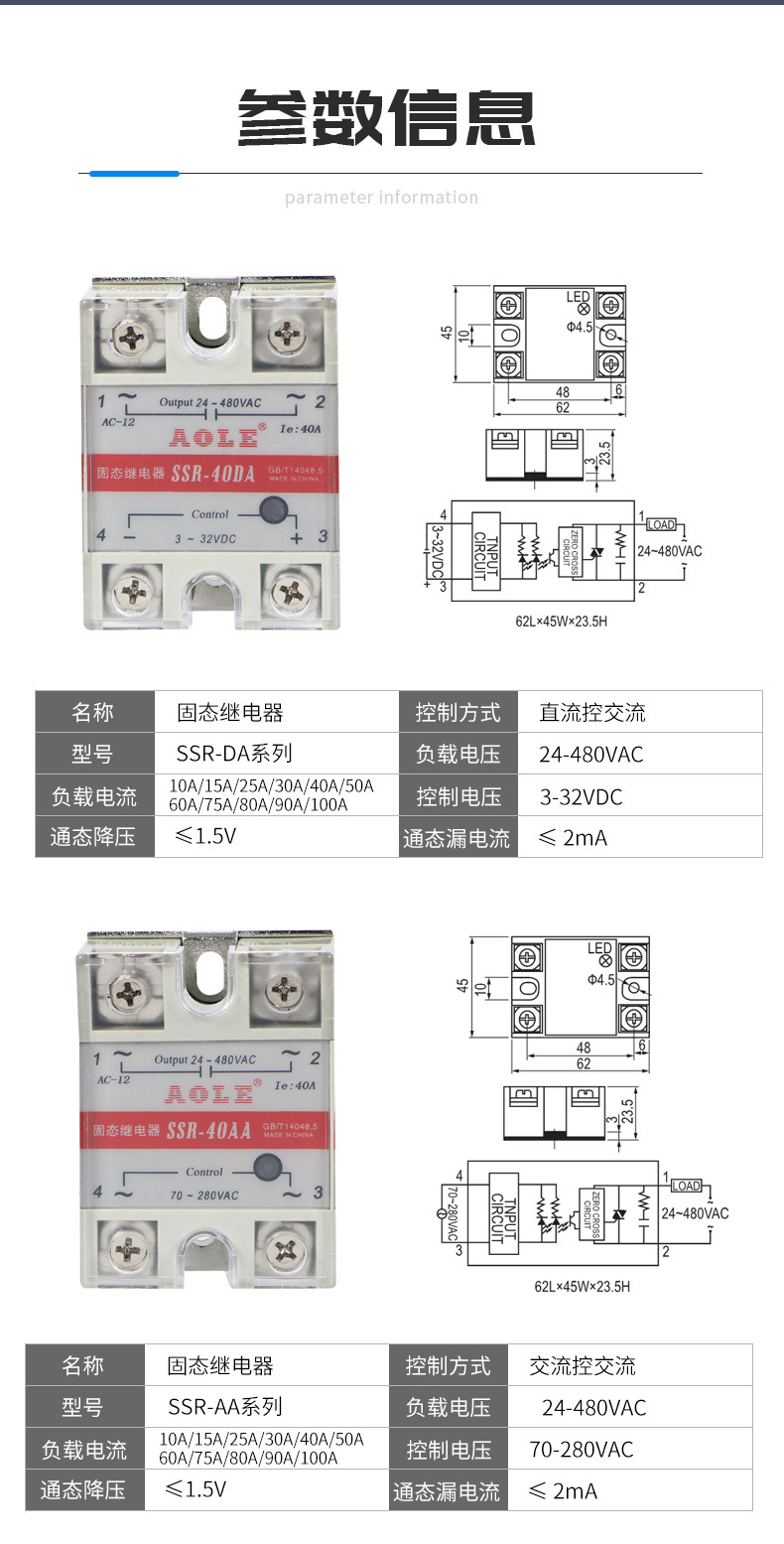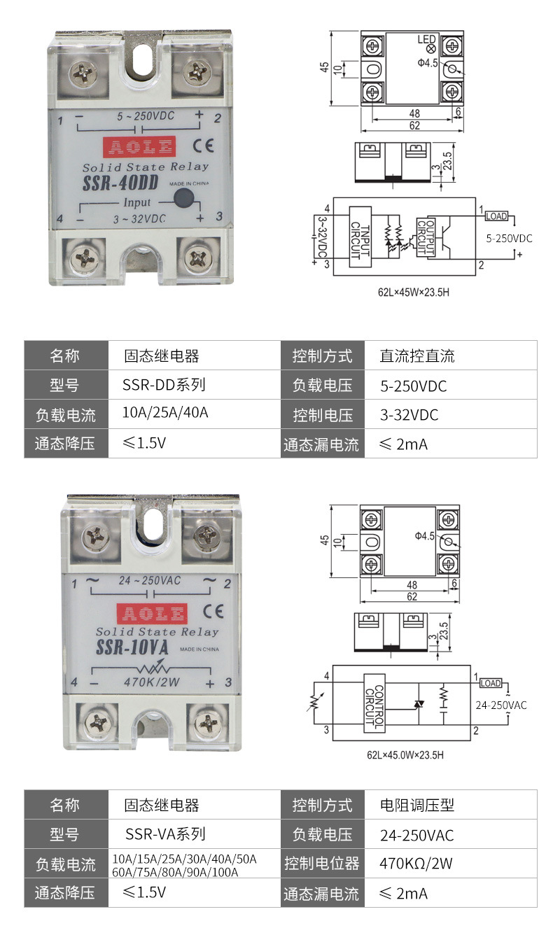 Управление постоянным током переменного тока 10 А (SSR-10DA); Управление постоянным током переменного тока 20 А (SSR-20DA); Управление постоянным током переменного тока 25 А (SSR-25DA); Управление постоянным током переменного тока 40 А (SSR-40DA); Управление постоянным током переменного тока 50 А (SSR-50DA); Управление постоянным током переменного тока 60 А (SSR-60DA); Управление постоянным током переменного тока 80 А (SSR-80DA); Управление постоянным током 100 А (SSR-100DA); Управление переменным током 10 А (SSR-10AA); Управление переменным током 25 А (SSR-25AA); Управление переменным током 40 А (SSR-40AA); Управление переменным током 60 А (SSR-60AA); Управление переменным током 80А (SSR-80AA); Управление переменным током 100 А (SSR-100AA); Контролируемый постоянным током DC 10A (SSR-10DD); Контролируемый постоянным током, 25 А (SSR-25DD); Управление постоянным током постоянного тока 40 А (SSR-40DD); Твердотельный стабилизатор напряжения сопротивления 10А (SSR-10ВА); Твердотельный стабилизатор напряжения сопротивления 25А (SSR-25ВА)