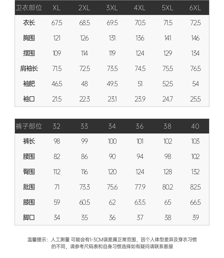 XL; 2XL; 3XL; 4XL; 5XL; 6XL