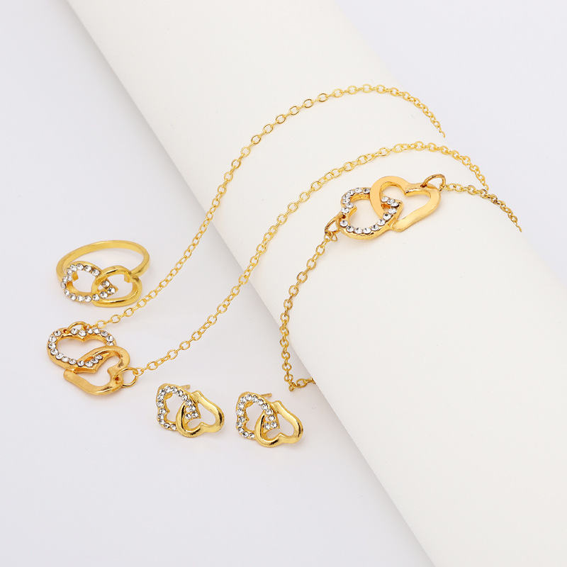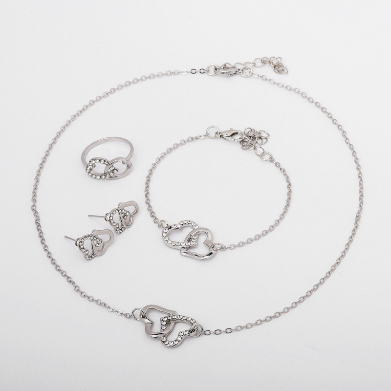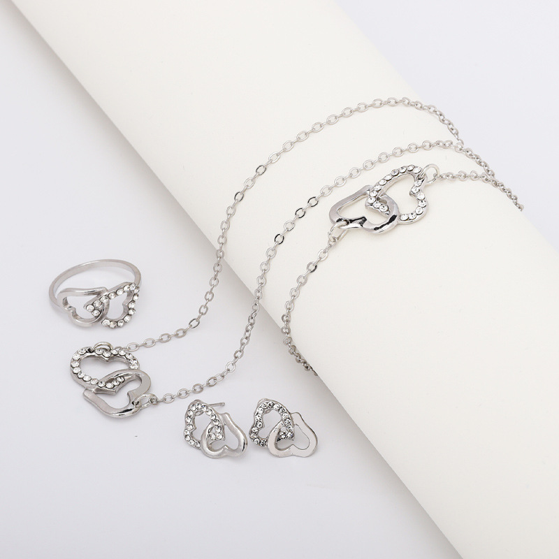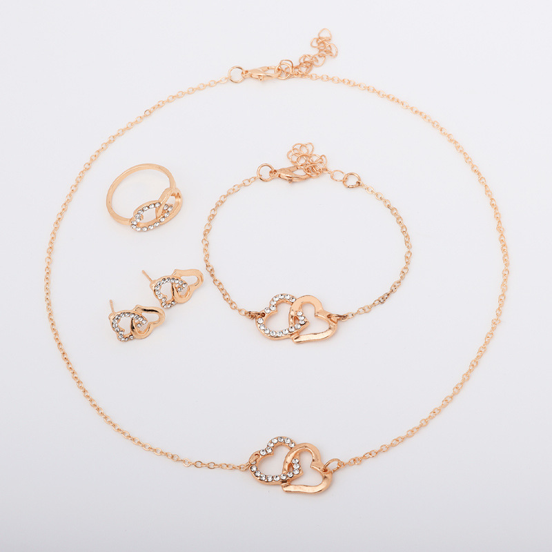 Набор из четырех украшений в европейском и американском стиле: простое женское универсальное украшение с двойным сердцем — колье, браслет, серьги, кулон.