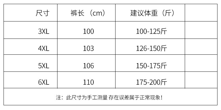 3XL【 50-65kg 】; 4XL【 65-77.5kg 】; 5XL【 77.5-90kg 】; 6XL[180-200]