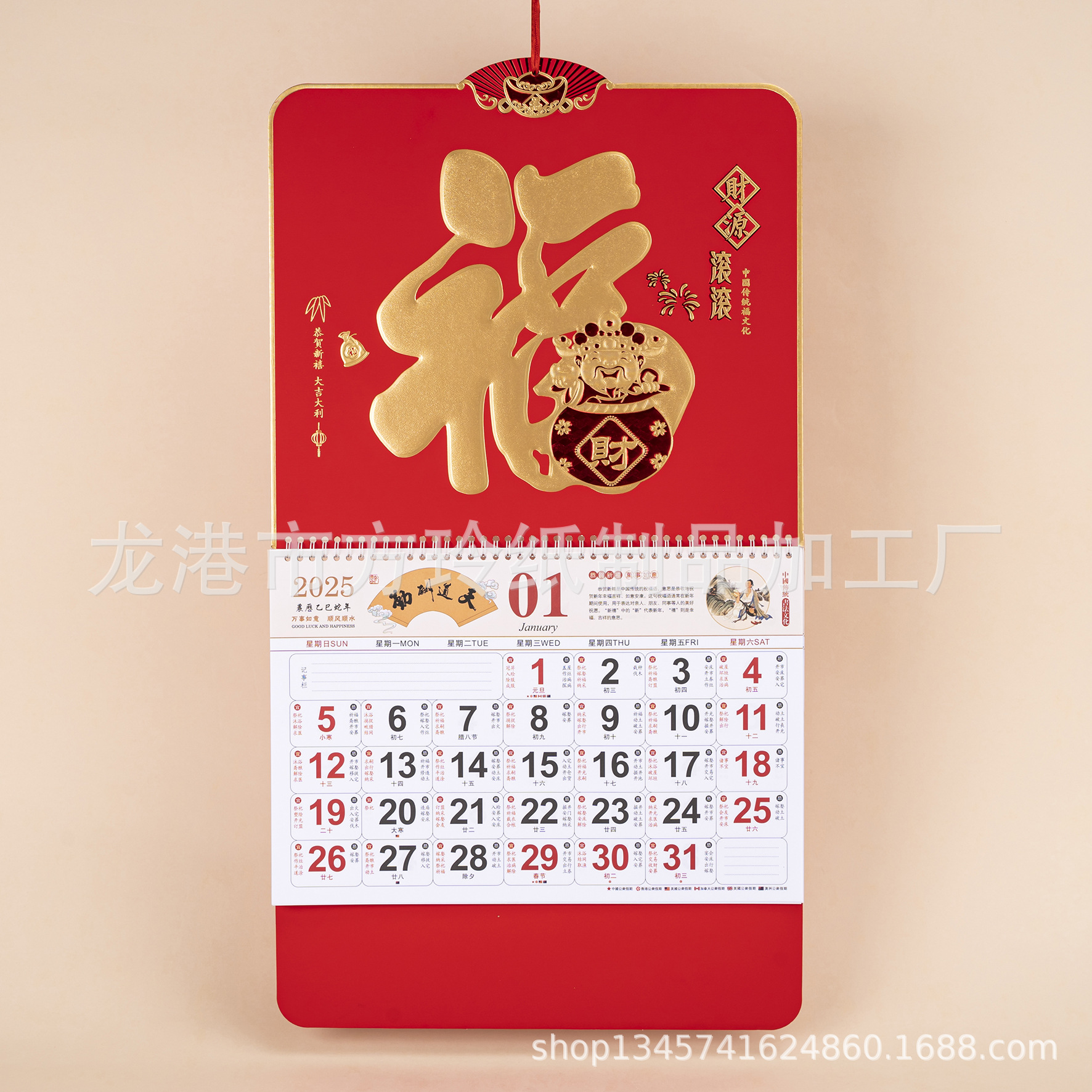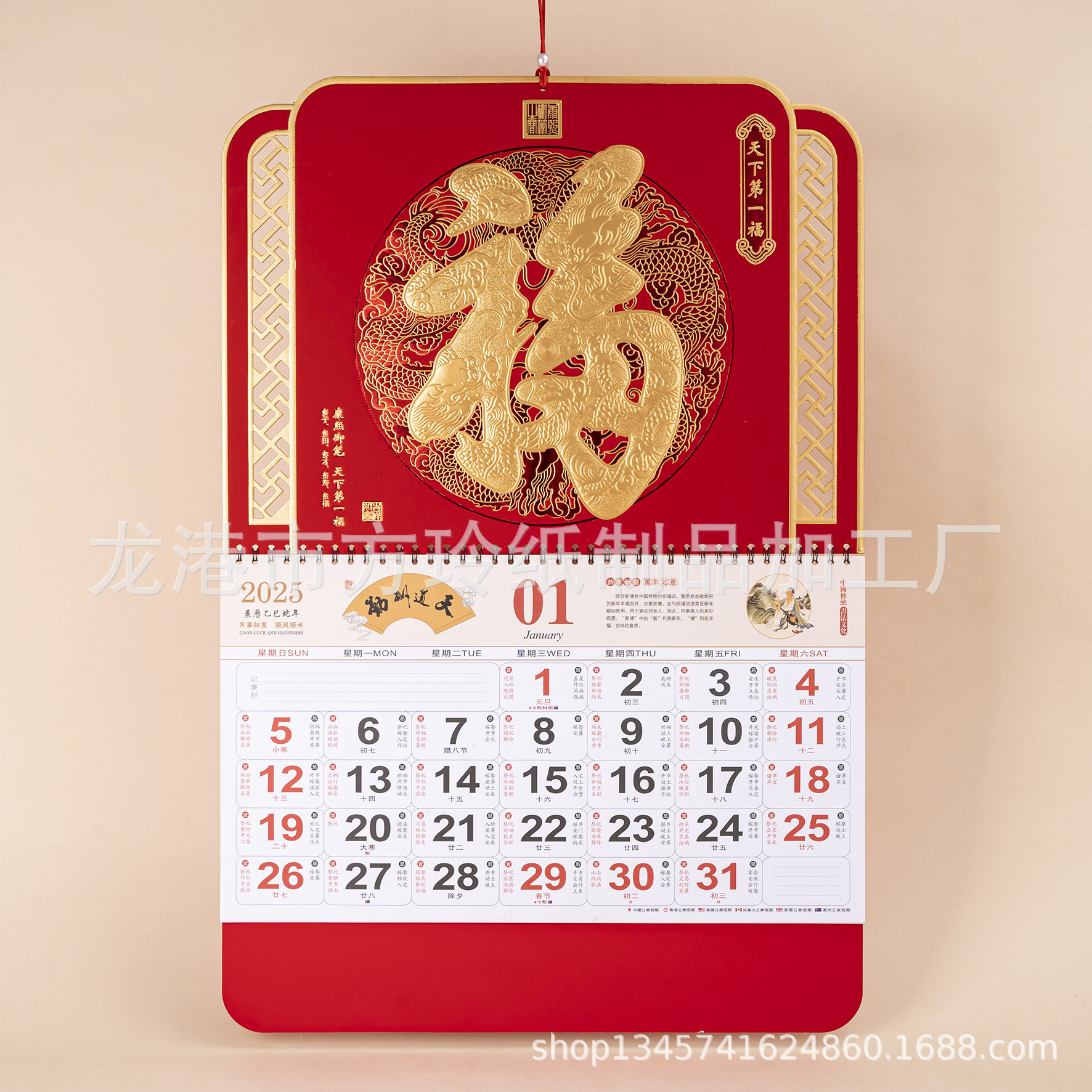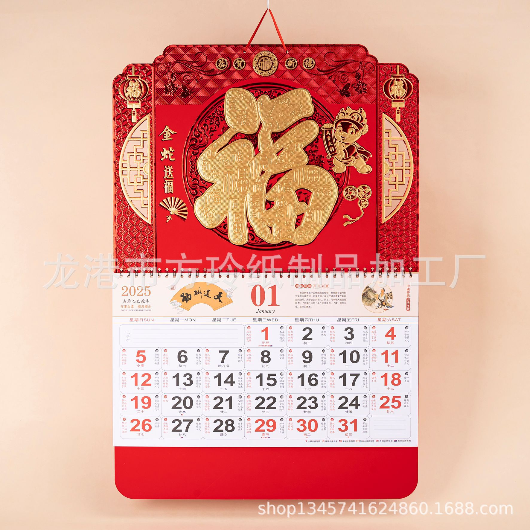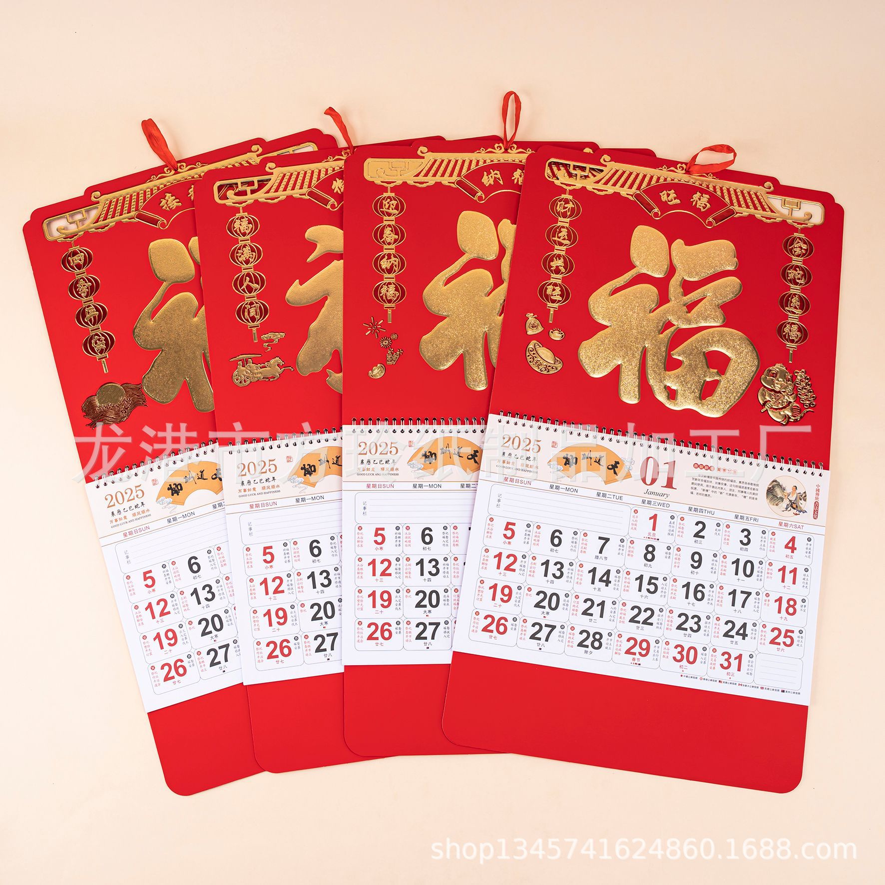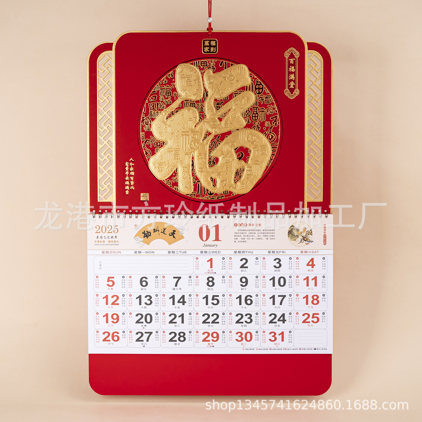 2023 Китайский красный подвесной календарь Fortune Brand Настенный календарь 3D подвесной календарь с персонажем Fortune Большой четырехстраничный утренний календарь с золотым тиснением