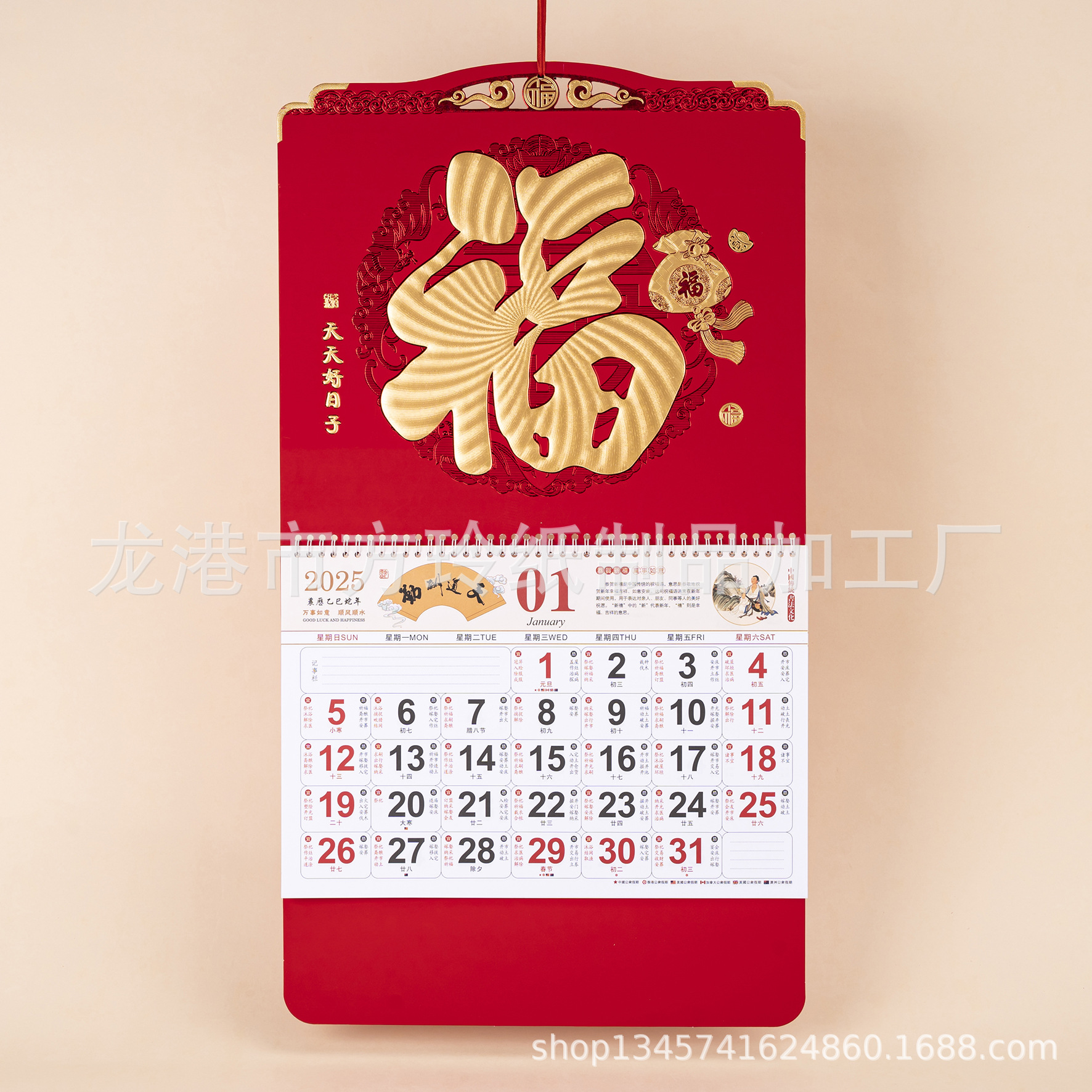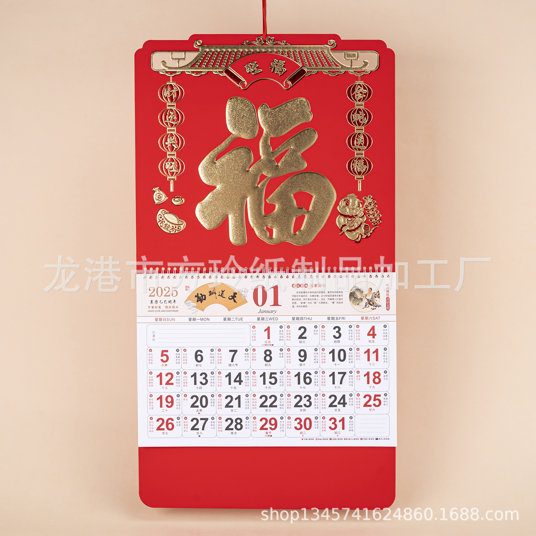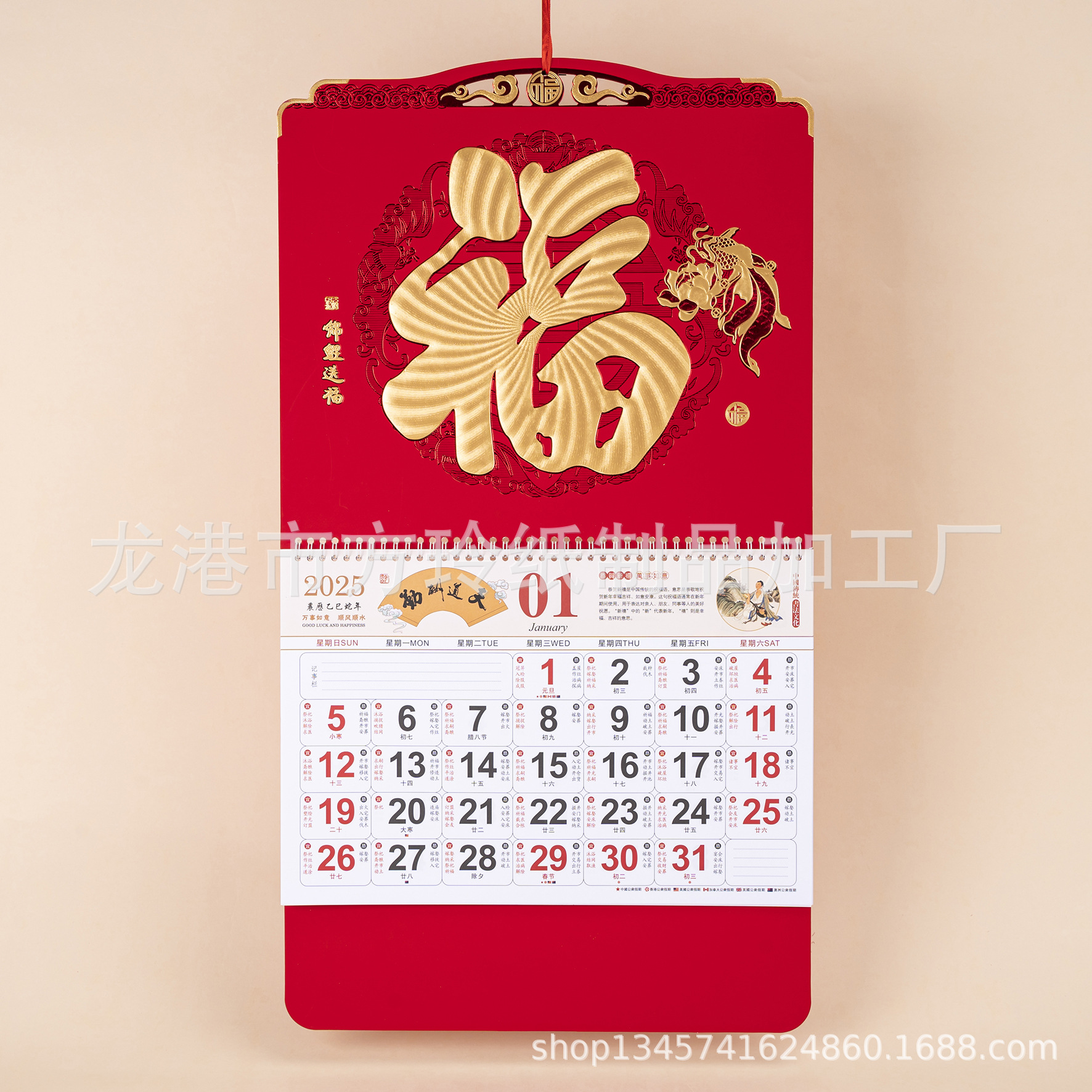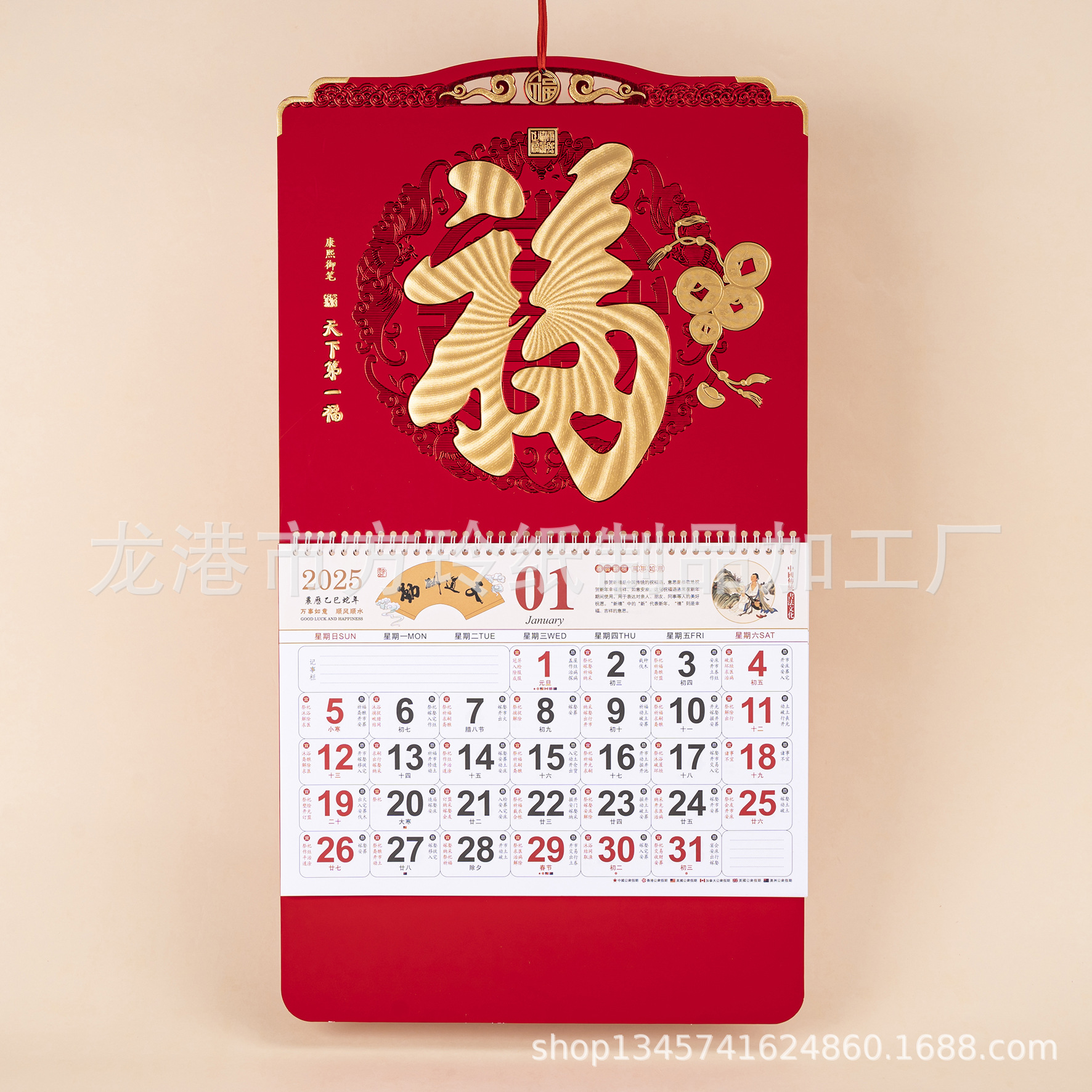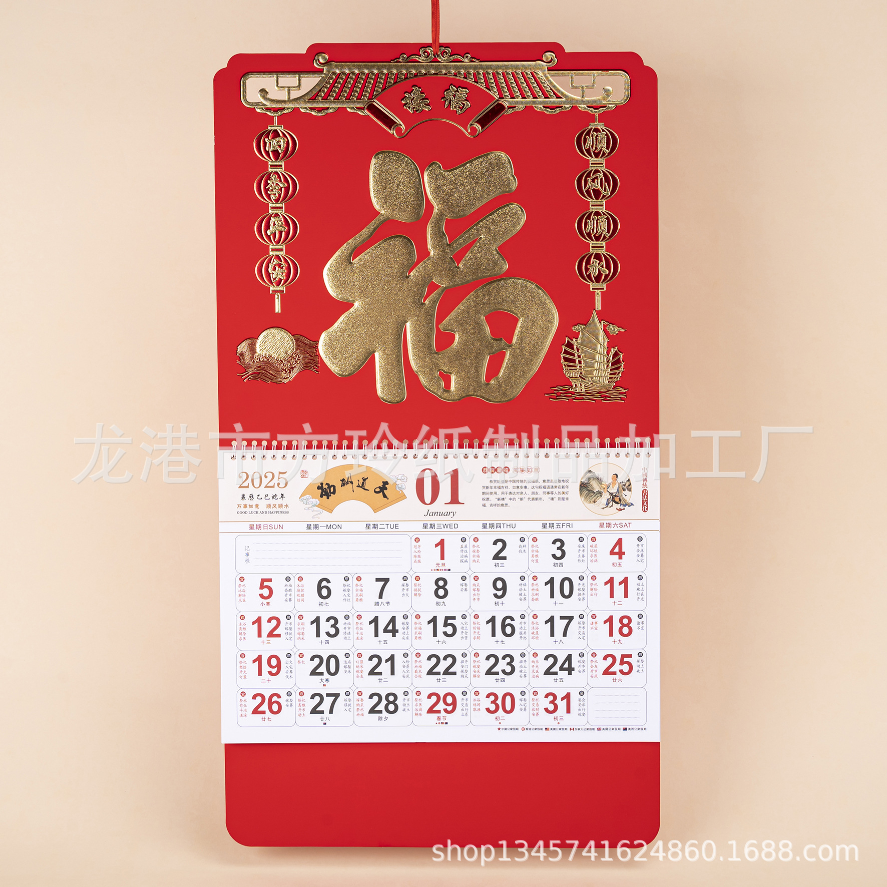 2023 Китайский красный подвесной календарь Fortune Brand Настенный календарь 3D подвесной календарь с персонажем Fortune Большой четырехстраничный утренний календарь с золотым тиснением