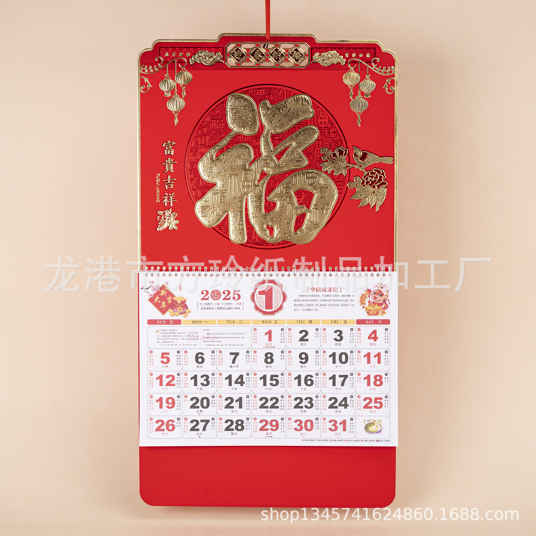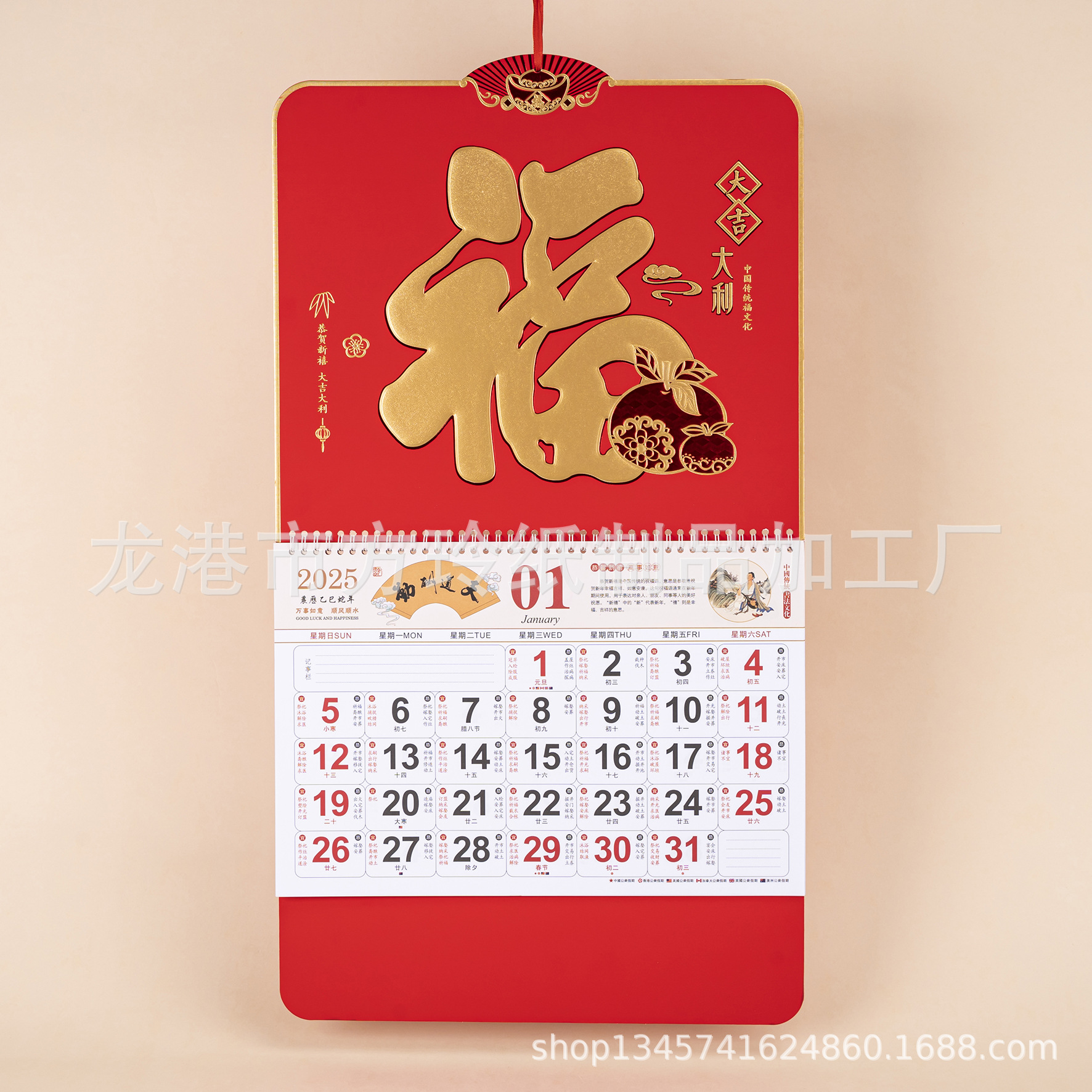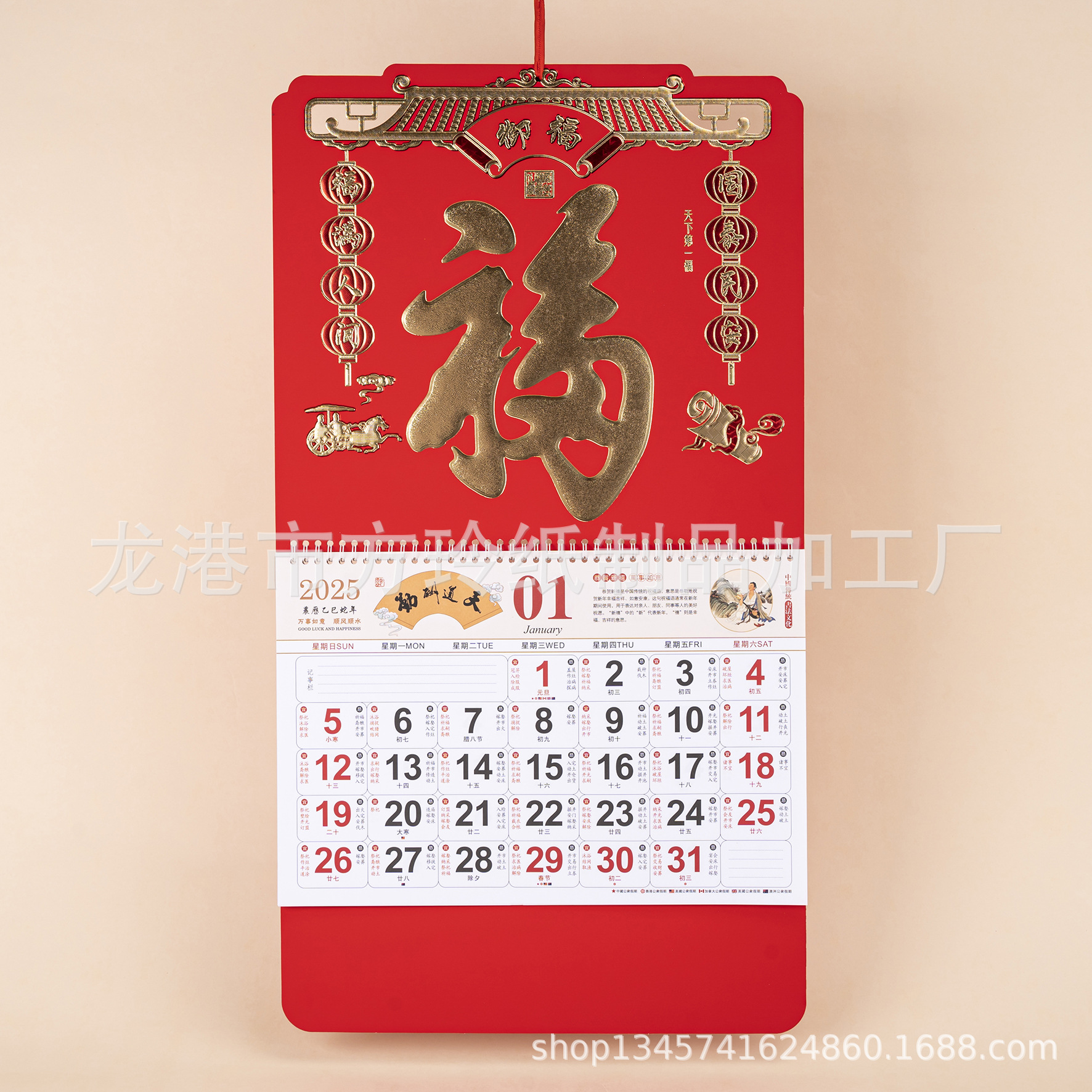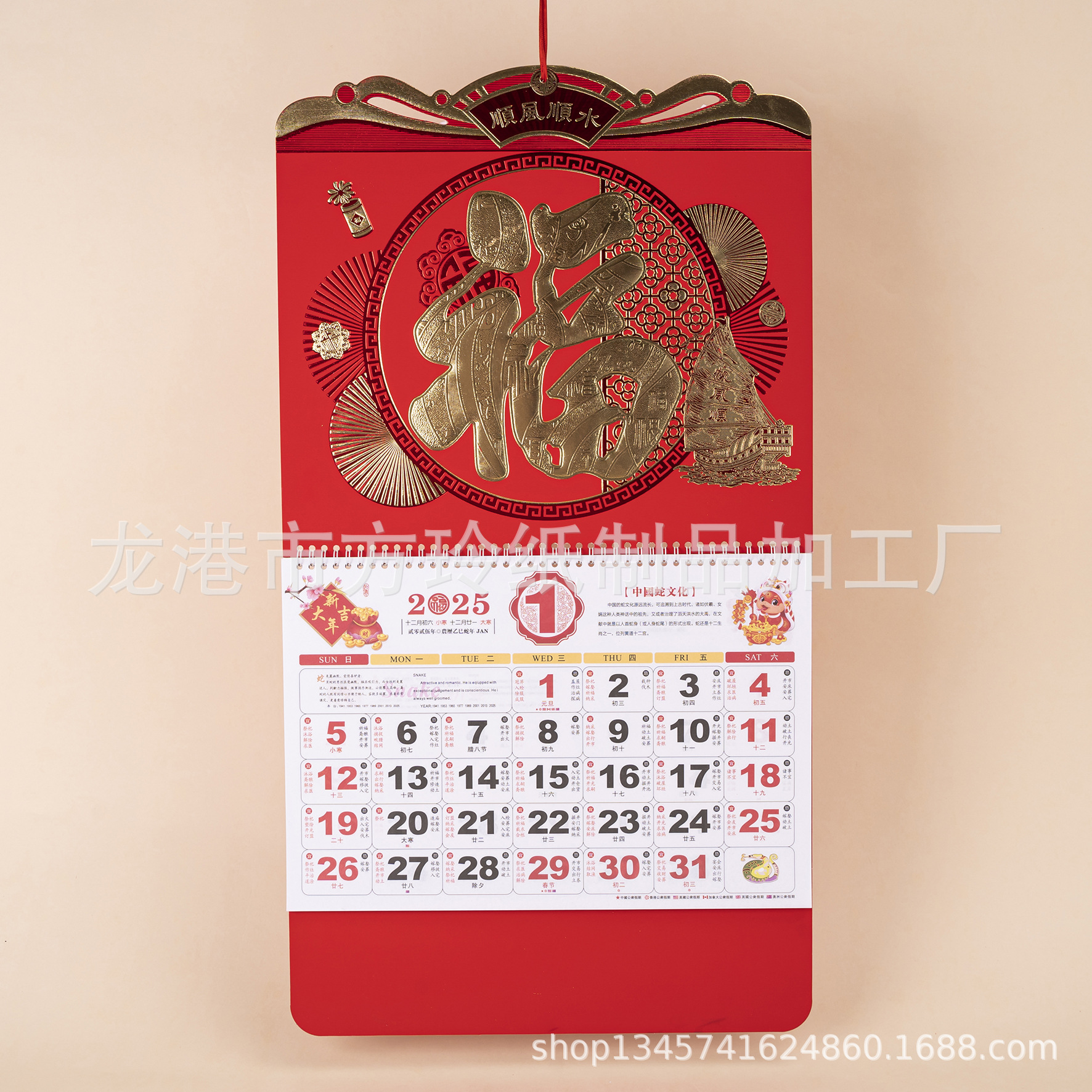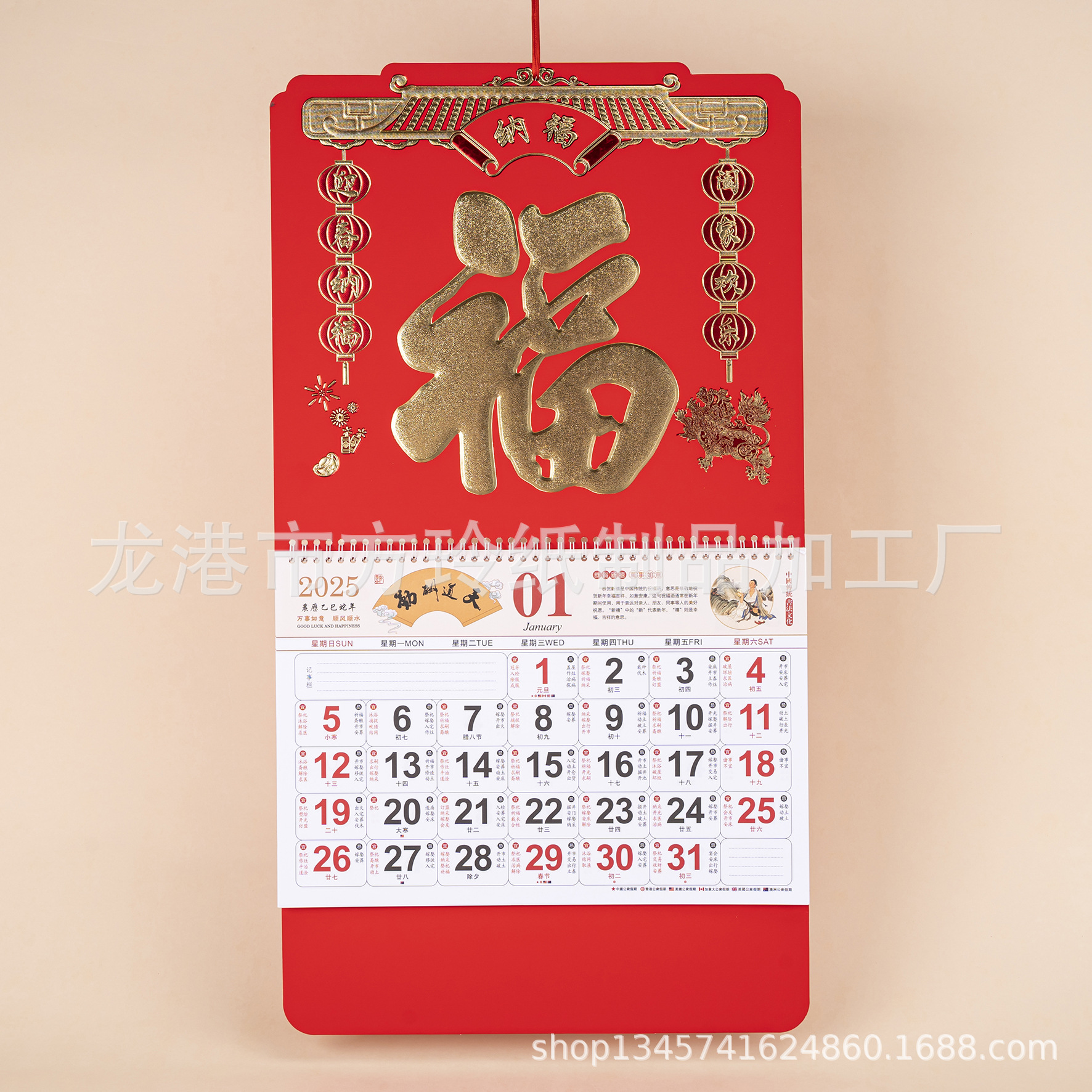 2023 Китайский красный подвесной календарь Fortune Brand Настенный календарь 3D подвесной календарь с персонажем Fortune Большой четырехстраничный утренний календарь с золотым тиснением