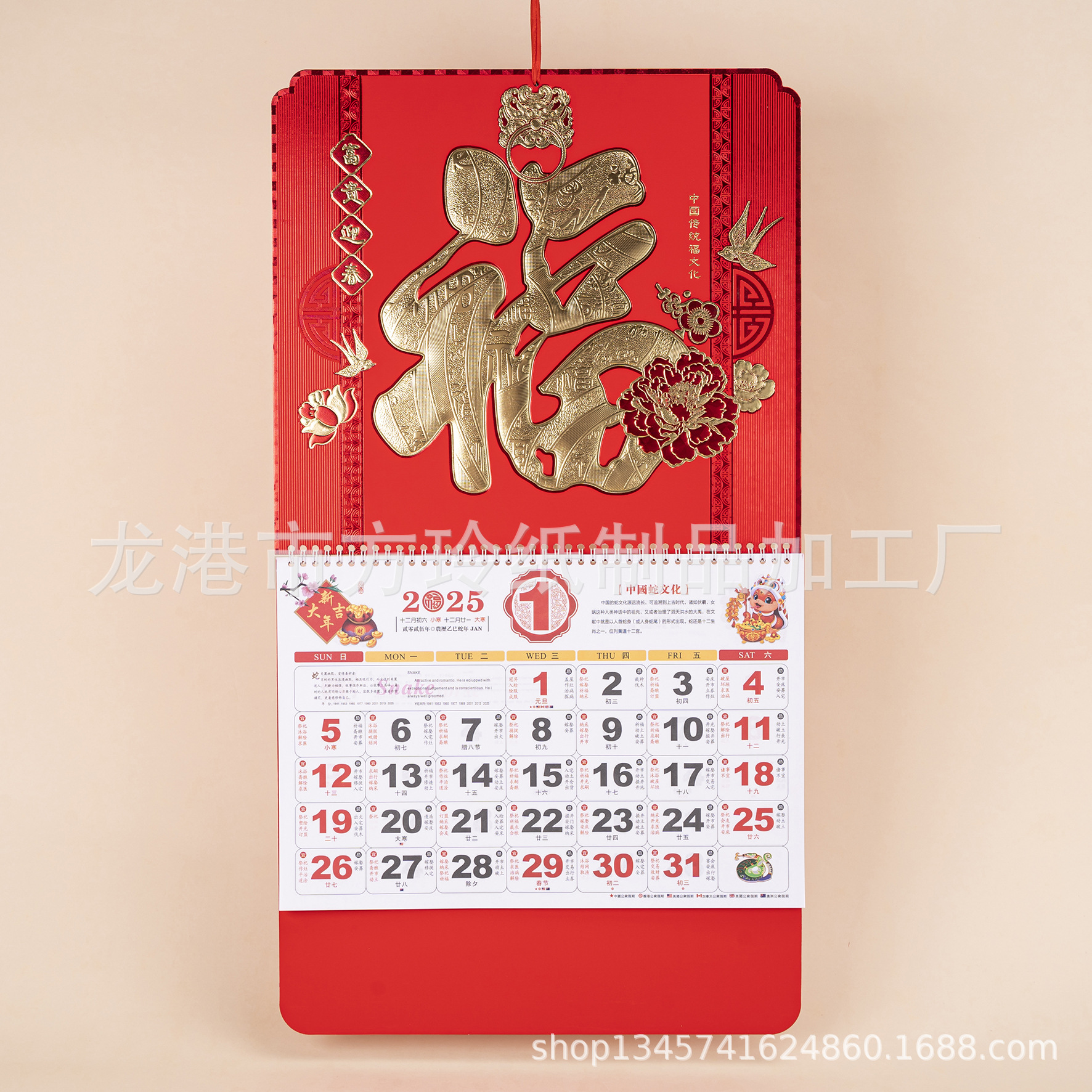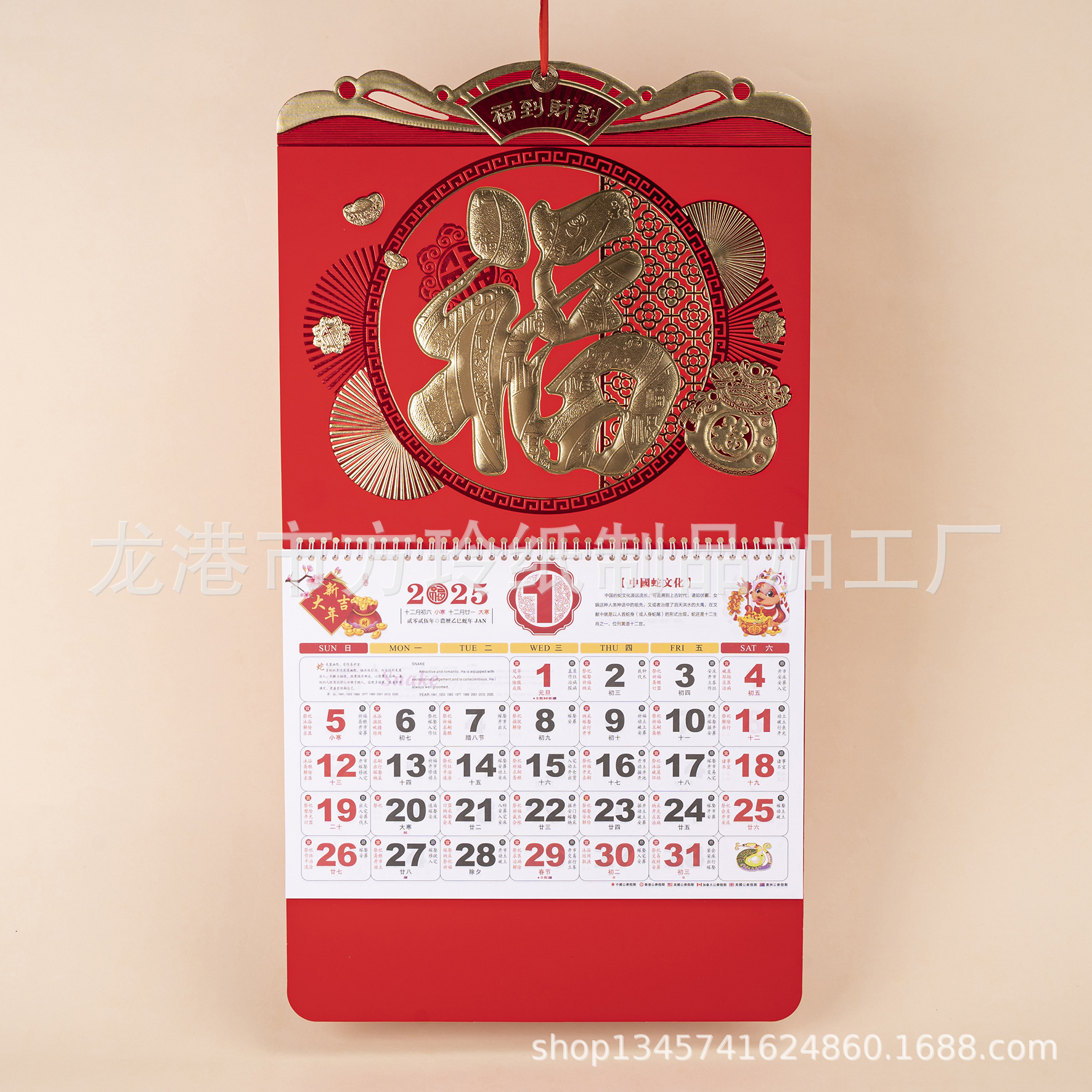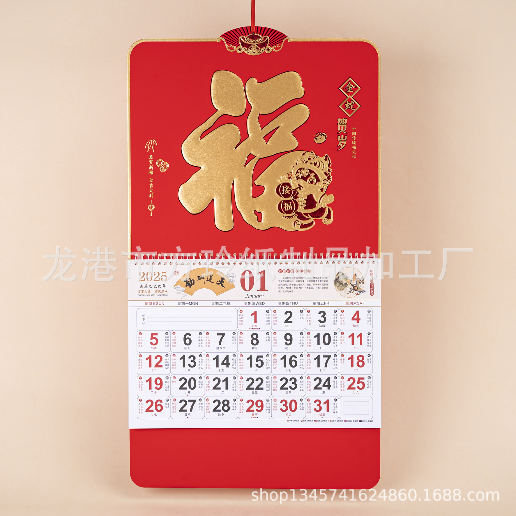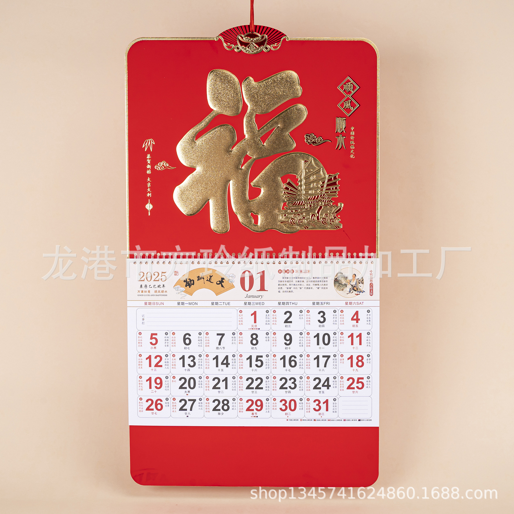 2023 Китайский красный подвесной календарь Fortune Brand Настенный календарь 3D подвесной календарь с персонажем Fortune Большой четырехстраничный утренний календарь с золотым тиснением