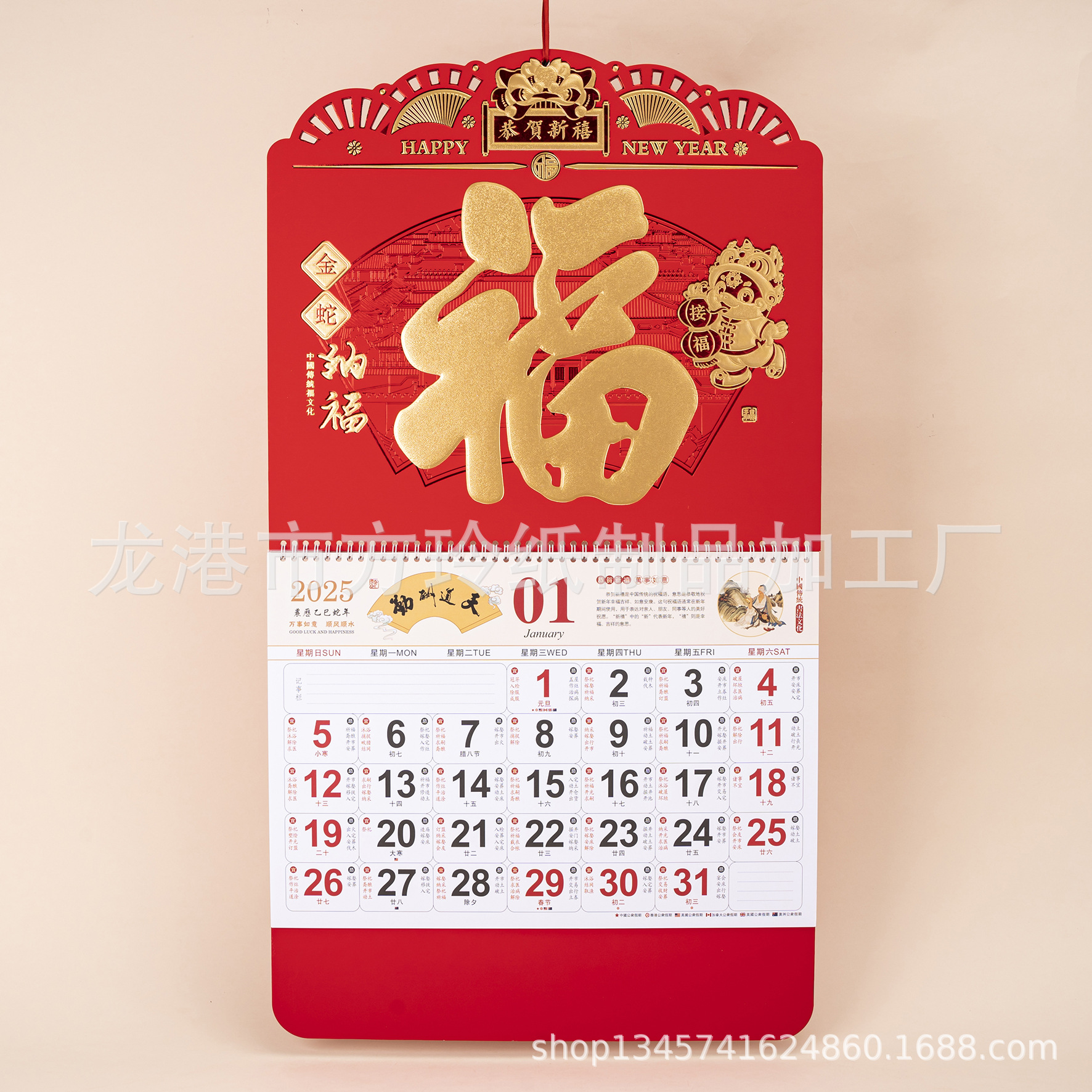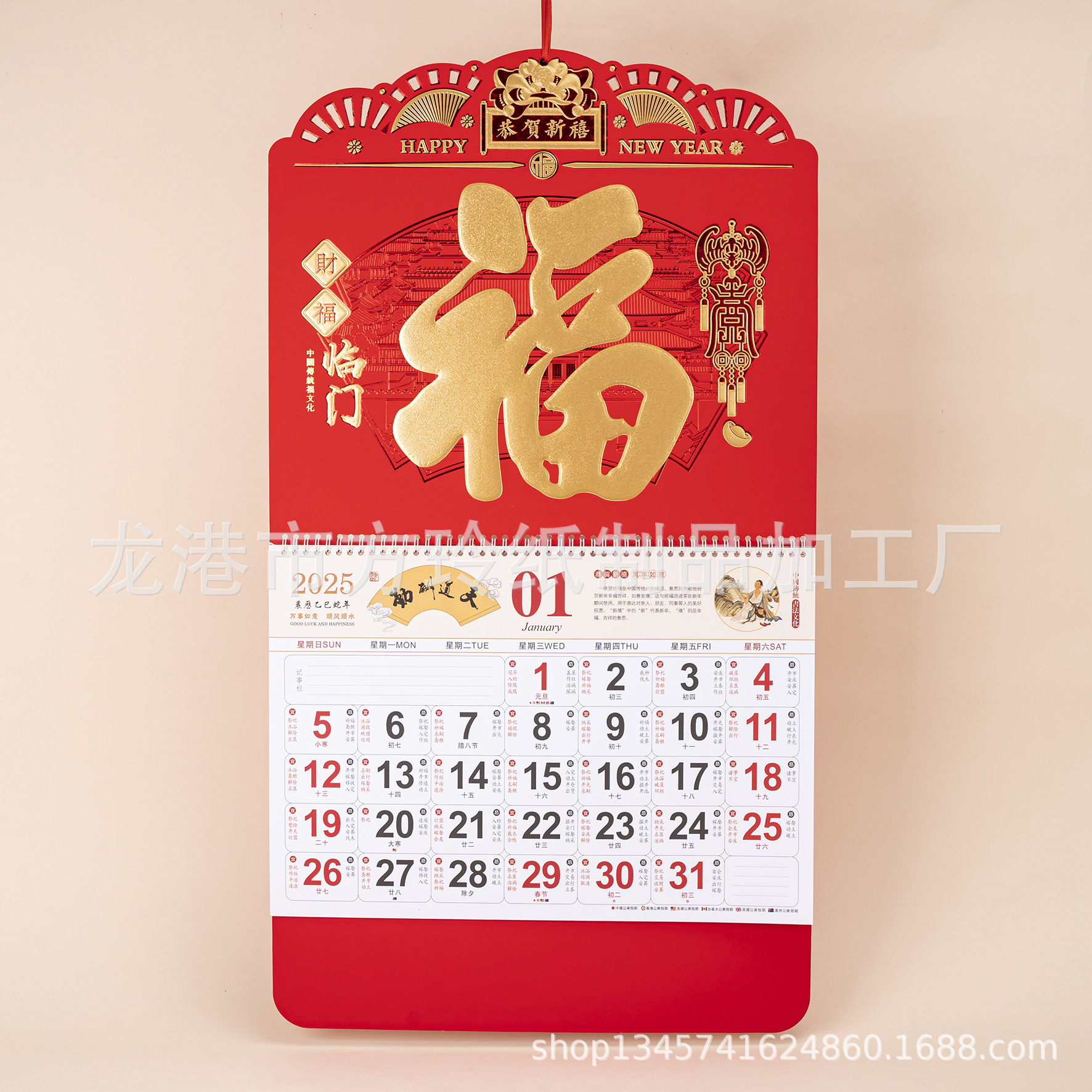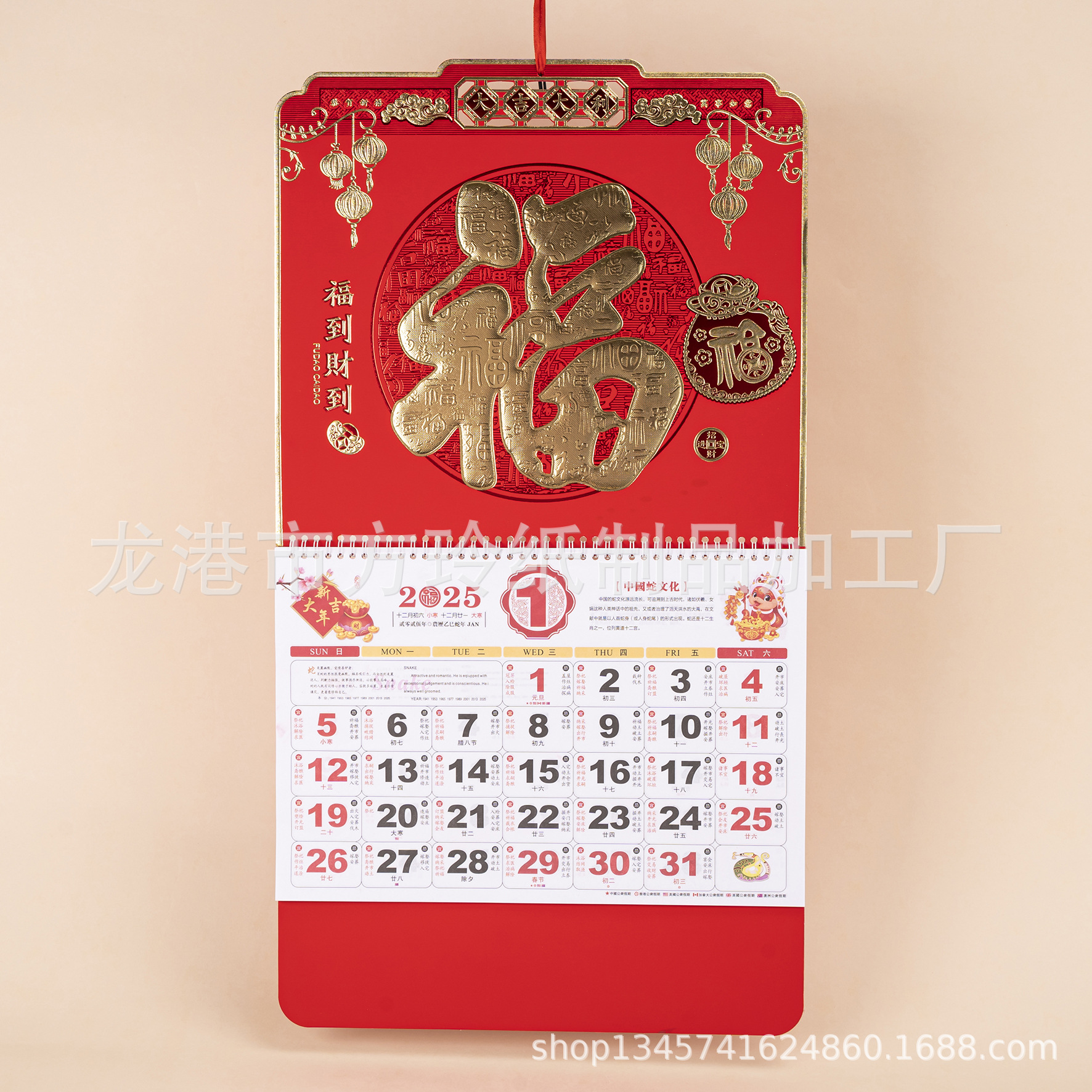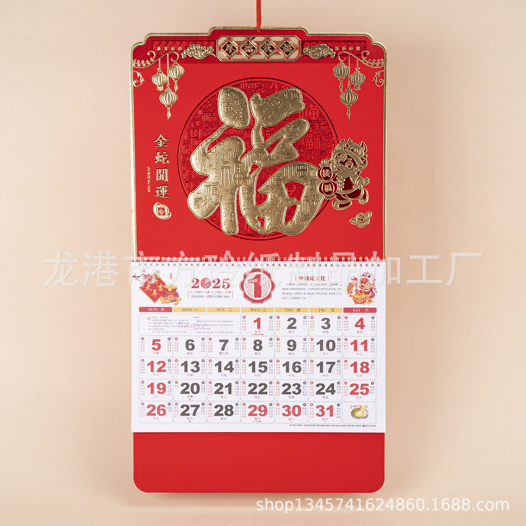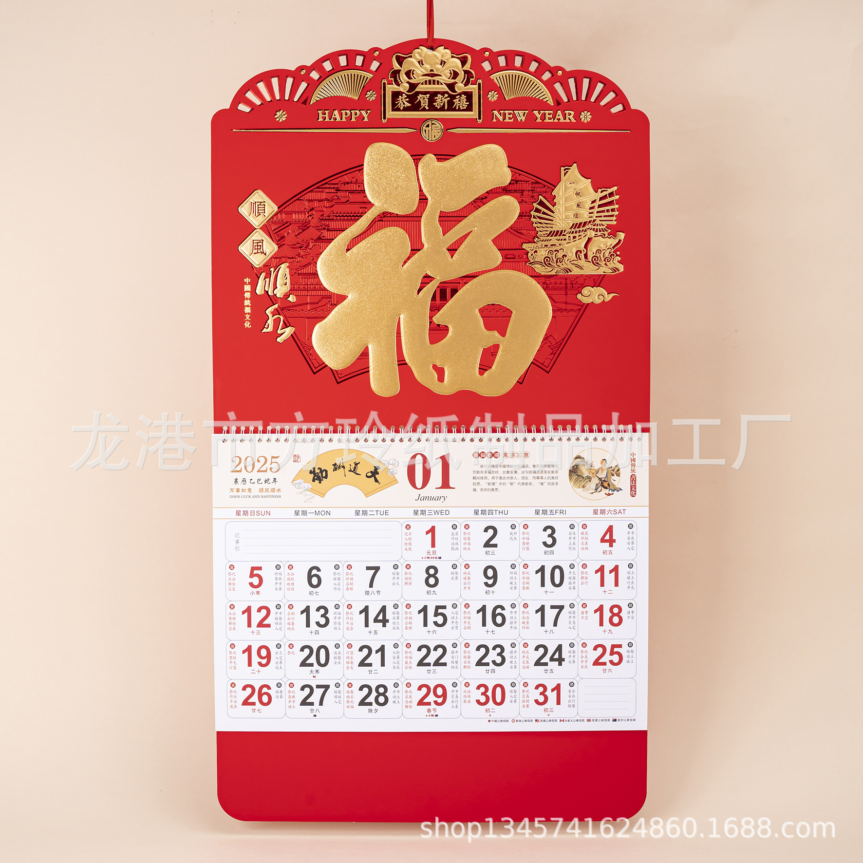 2023 Китайский красный подвесной календарь Fortune Brand Настенный календарь 3D подвесной календарь с персонажем Fortune Большой четырехстраничный утренний календарь с золотым тиснением