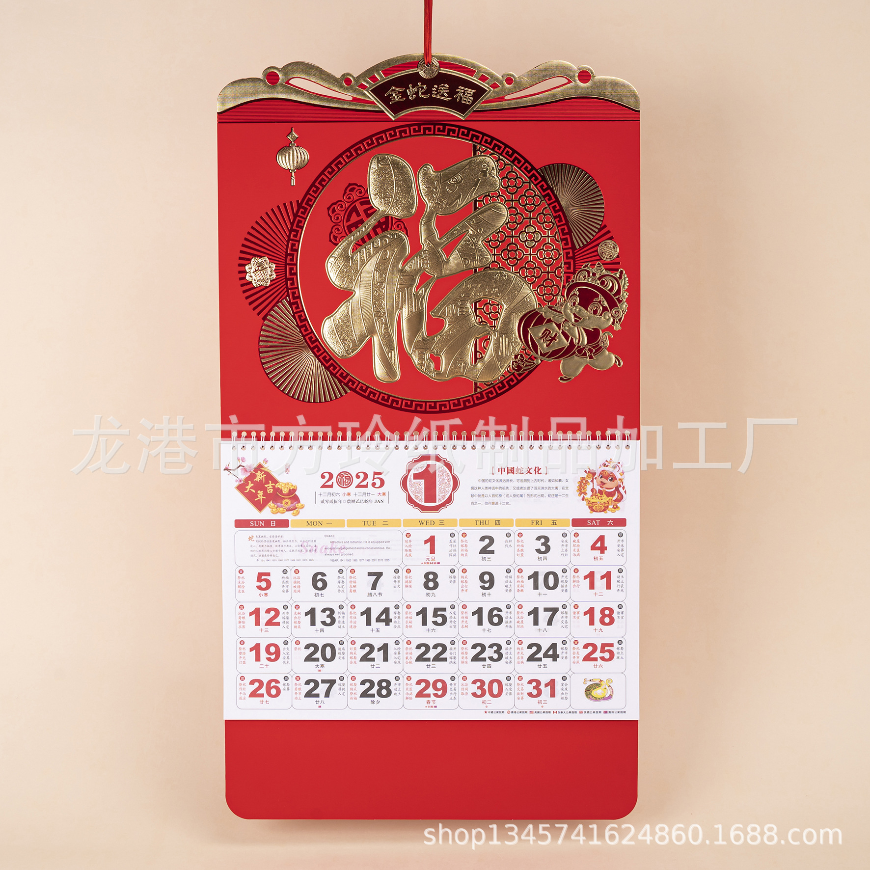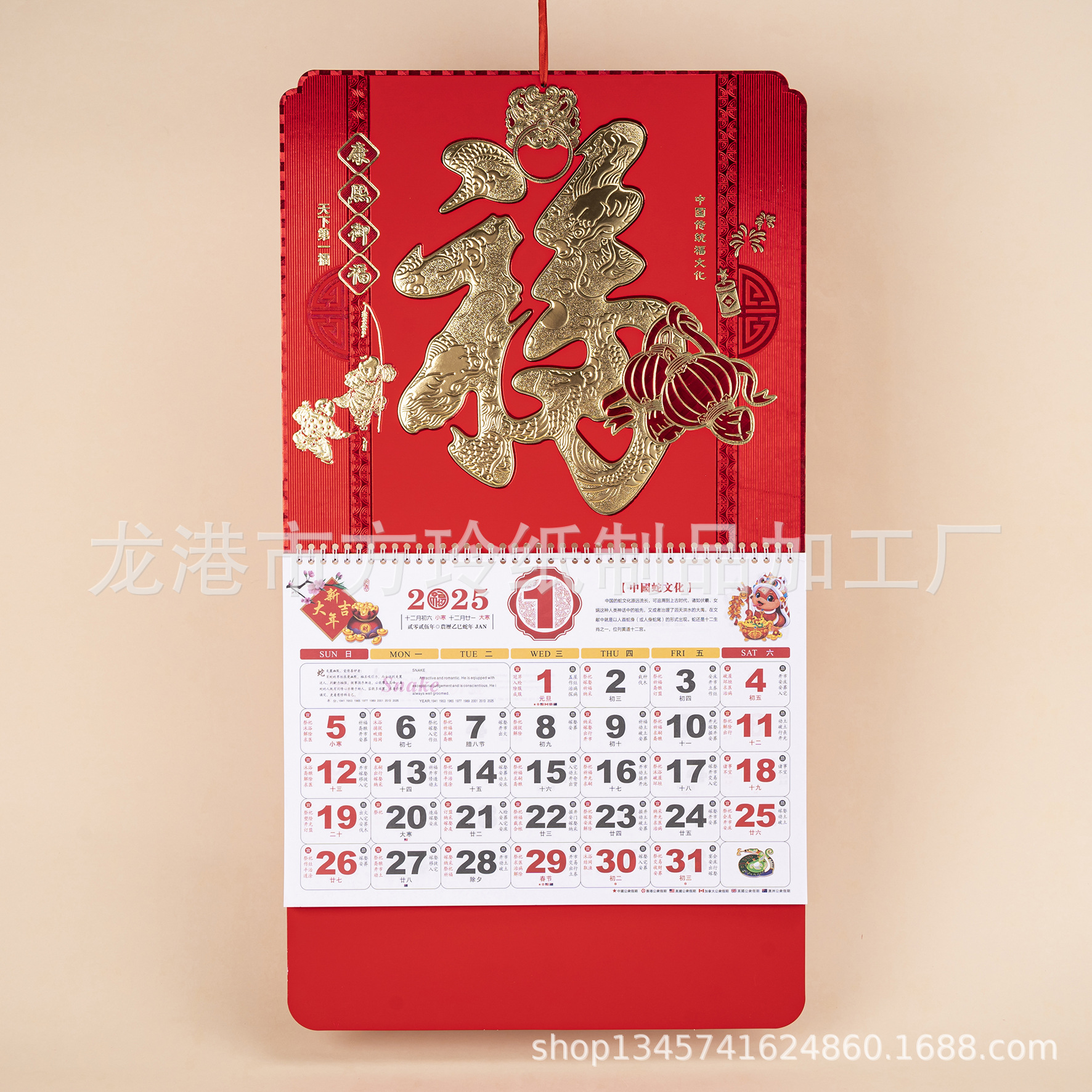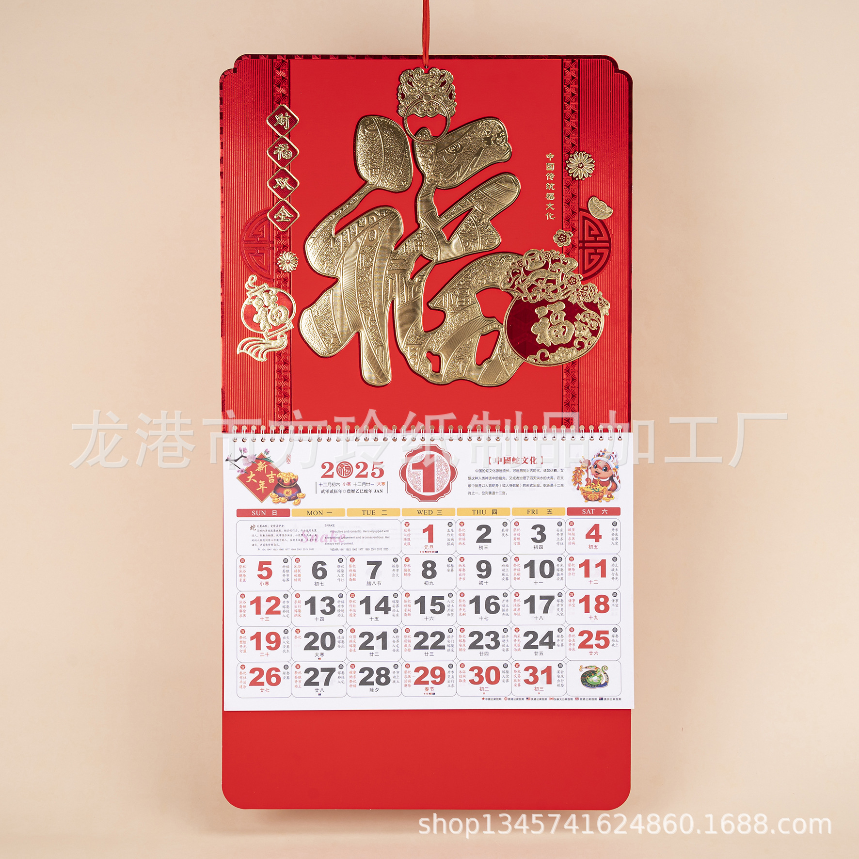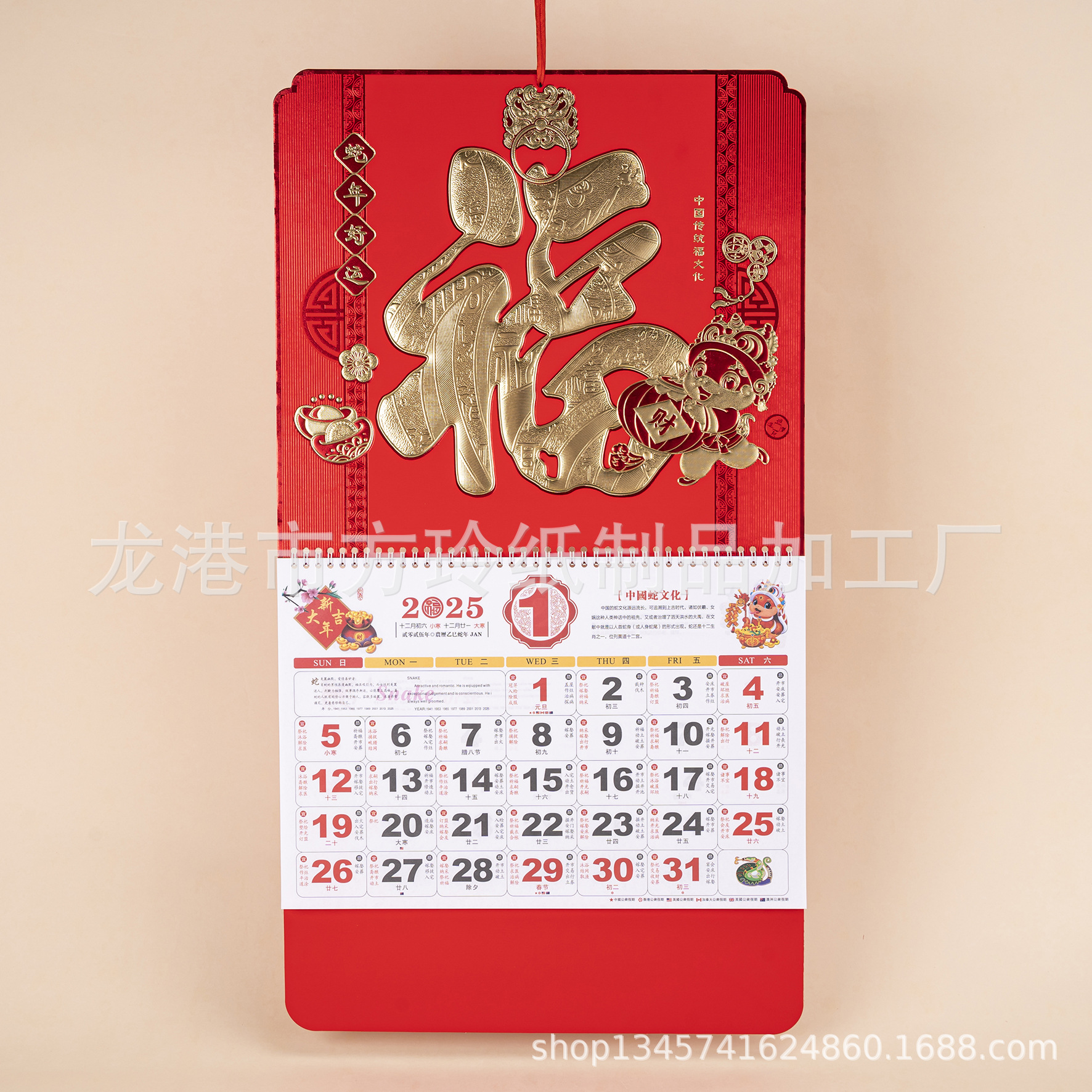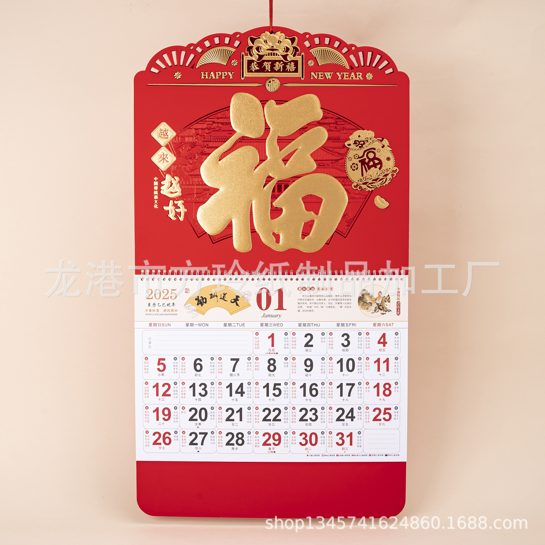 2023 Китайский красный подвесной календарь Fortune Brand Настенный календарь 3D подвесной календарь с персонажем Fortune Большой четырехстраничный утренний календарь с золотым тиснением