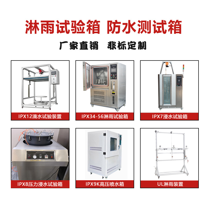 Водонепроницаемая испытательная камера для защиты от дождя (различные модели, запросите цену); Резервуар для погружения под давлением IPX8 (запрос и предложение); Камера для испытания на капельный поток IPX12 (запрос и предложение); Камера для испытаний на дождь с поворотной трубкой IPX34 (запрос и предложение); Камера для испытаний на боковое распыление и дождь по стандарту IPX56 (запрос и предложение); Камера для испытаний на воздействие дождя с верхним распылением IPX56 (запрос и предложение); Камера для испытаний на погружение по стандарту IPX7 (запрос и предложение); Резервуар для распыления воды под высоким давлением IPX9K (запрос и предложение); Водонепроницаемая комната для испытаний на дождь (запрос и предложение); Камера для комплексного испытания на водонепроницаемость IPX1-9 (запросите цену); Водонепроницаемая дождевая камера для тестирования, нестандартная настройка (запрос и расчет стоимости)