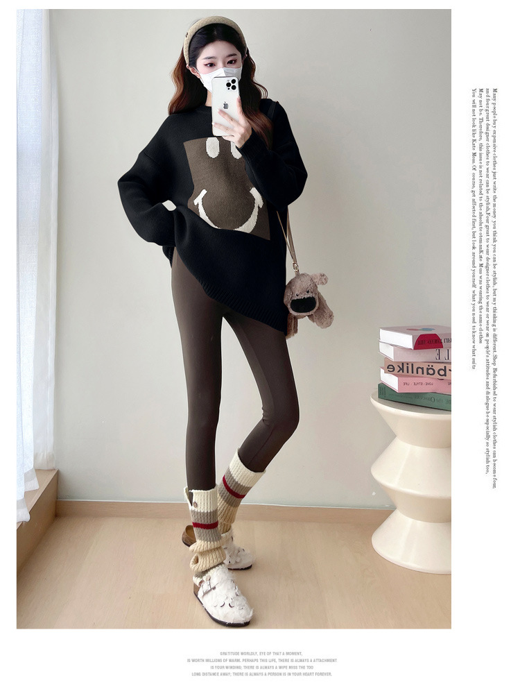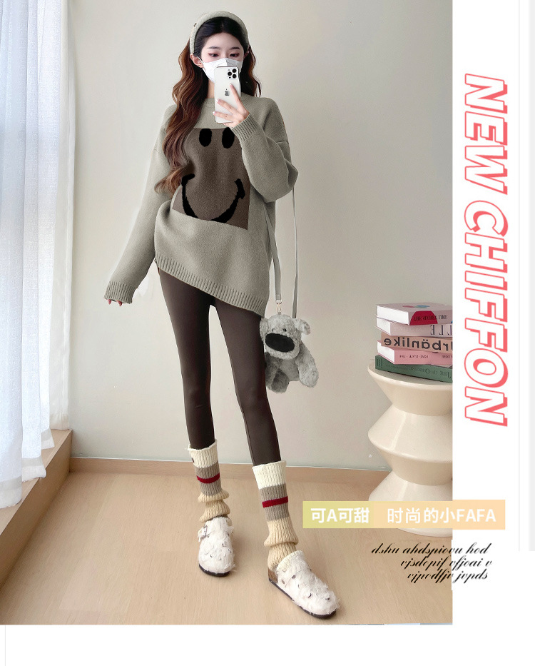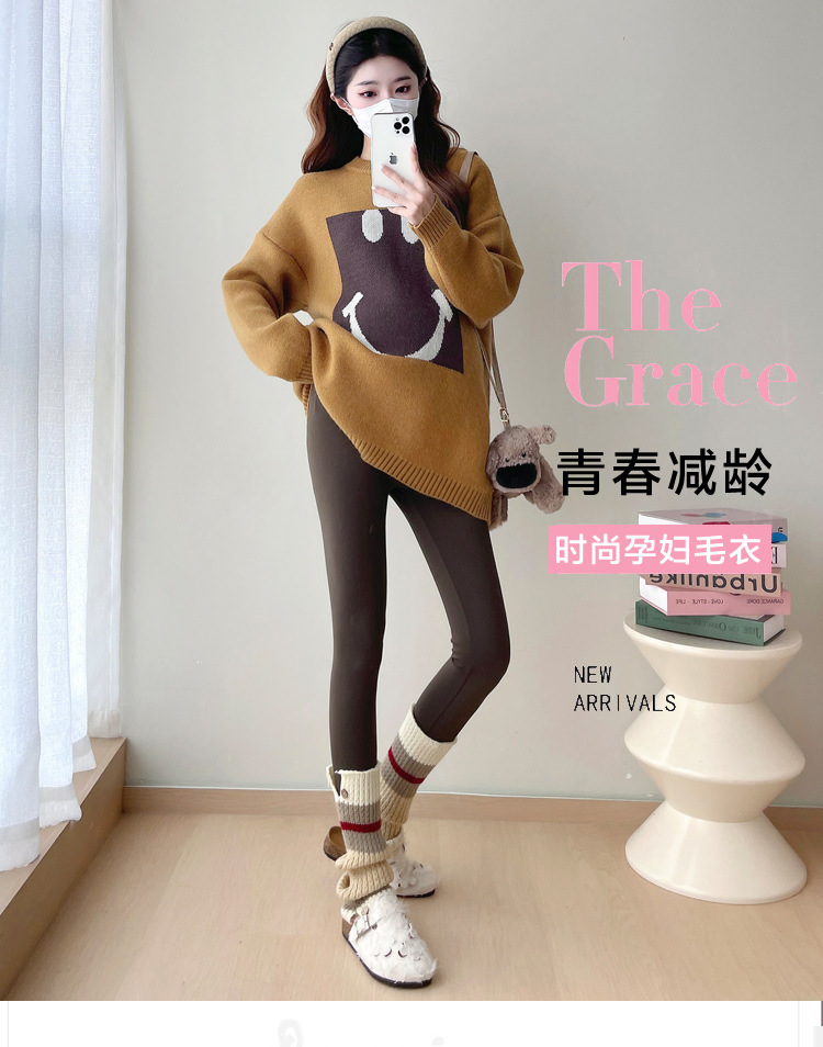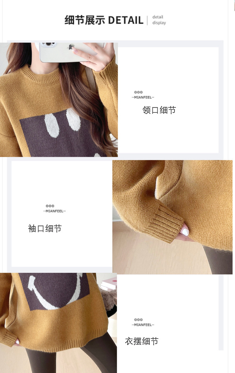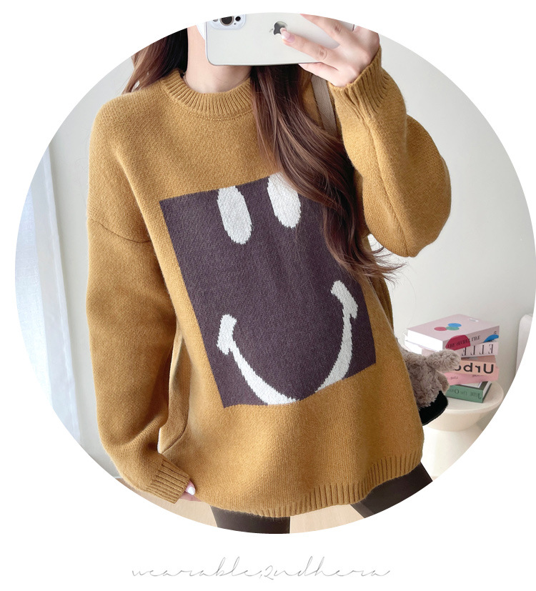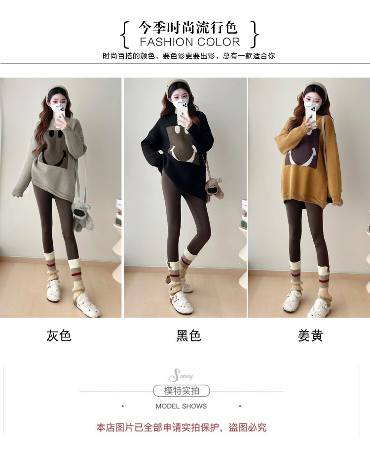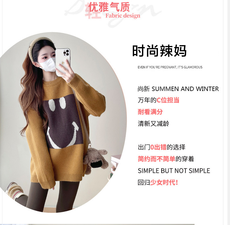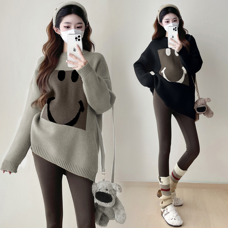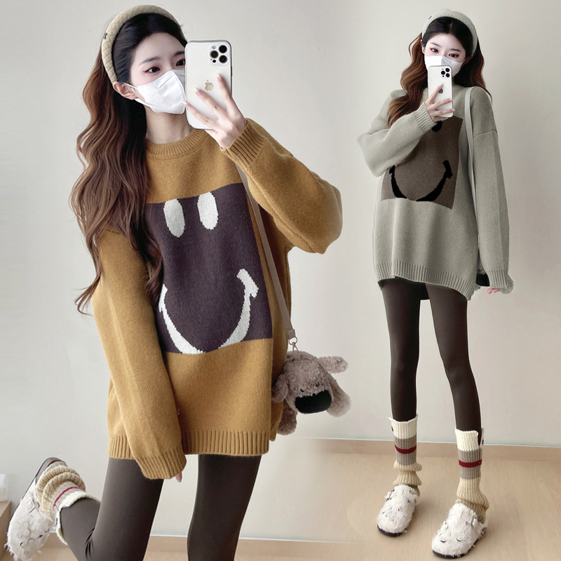 Свитер для беременных 2024 осень и зима корейский свободный ленивый топ модный большой размер тонкий смайлик вязаный свитер