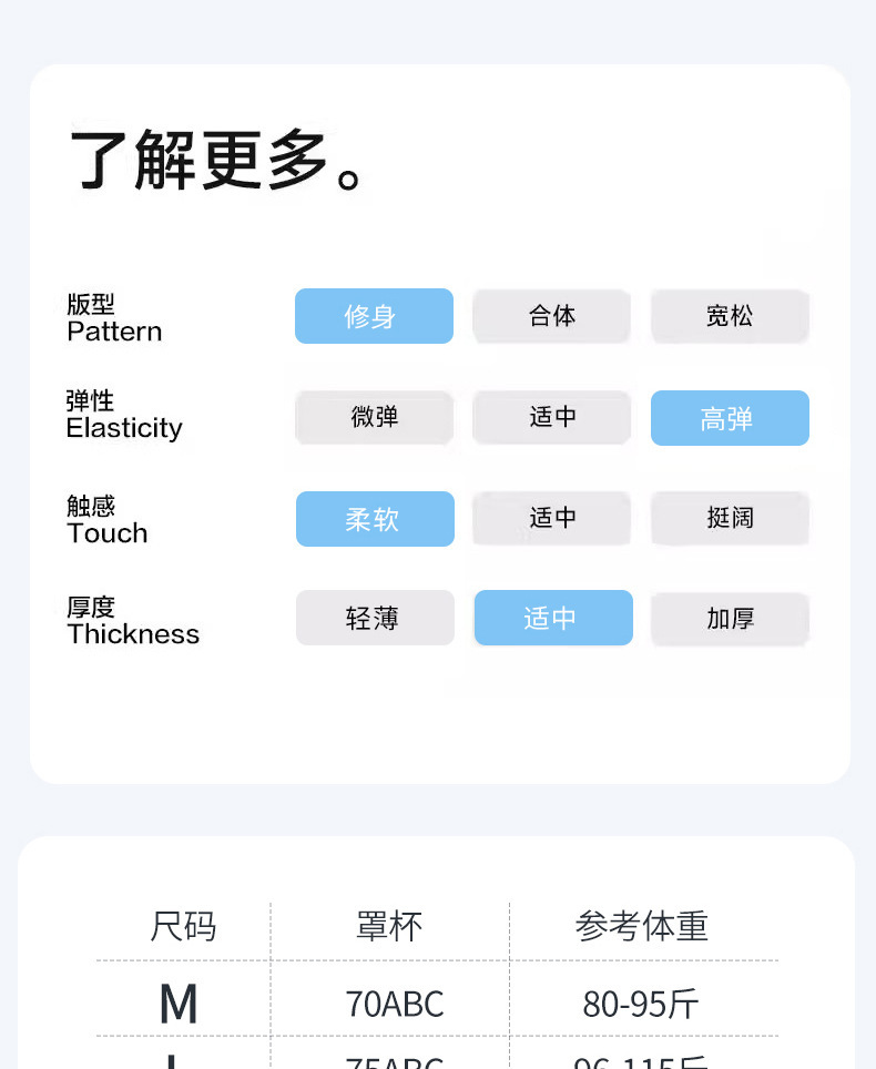 М (80— 47.5kg -70ABC); L (96— 57.5kg -75ABC); XL (116— 67.5kg -80AB); 2XL (136— 75kg -85AB)