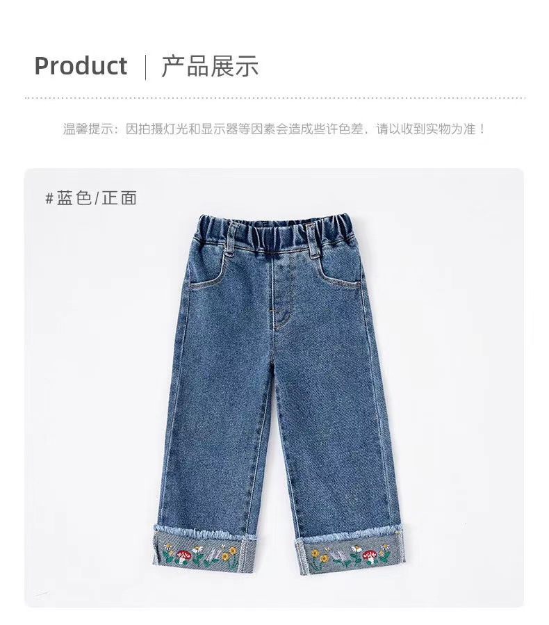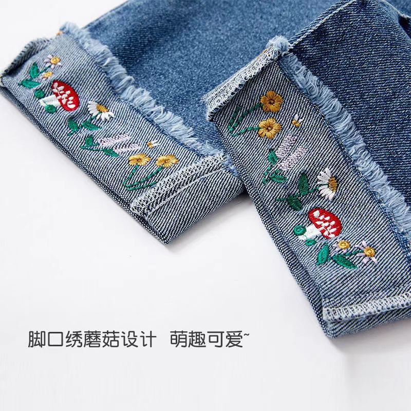 Ребенок новый стиль джинсы для девочек милые повседневные брюки иностранная вышивка широкие брюки для детей прямые длинные брюки