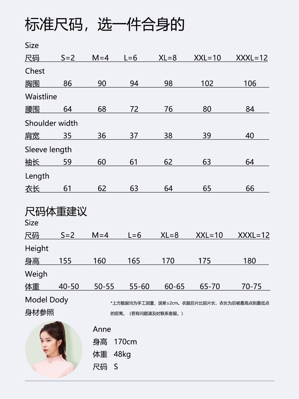 2/С 37.5-47.5kg; 4/М 47.5-52.5kg; 6/л 52.5-60kg; 8/XL 60-65kg; 10/XXL 65-70kg; 12/3XL 67.5-75kg
