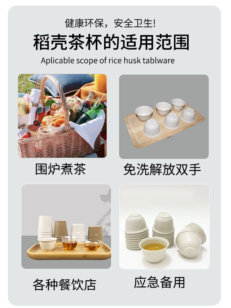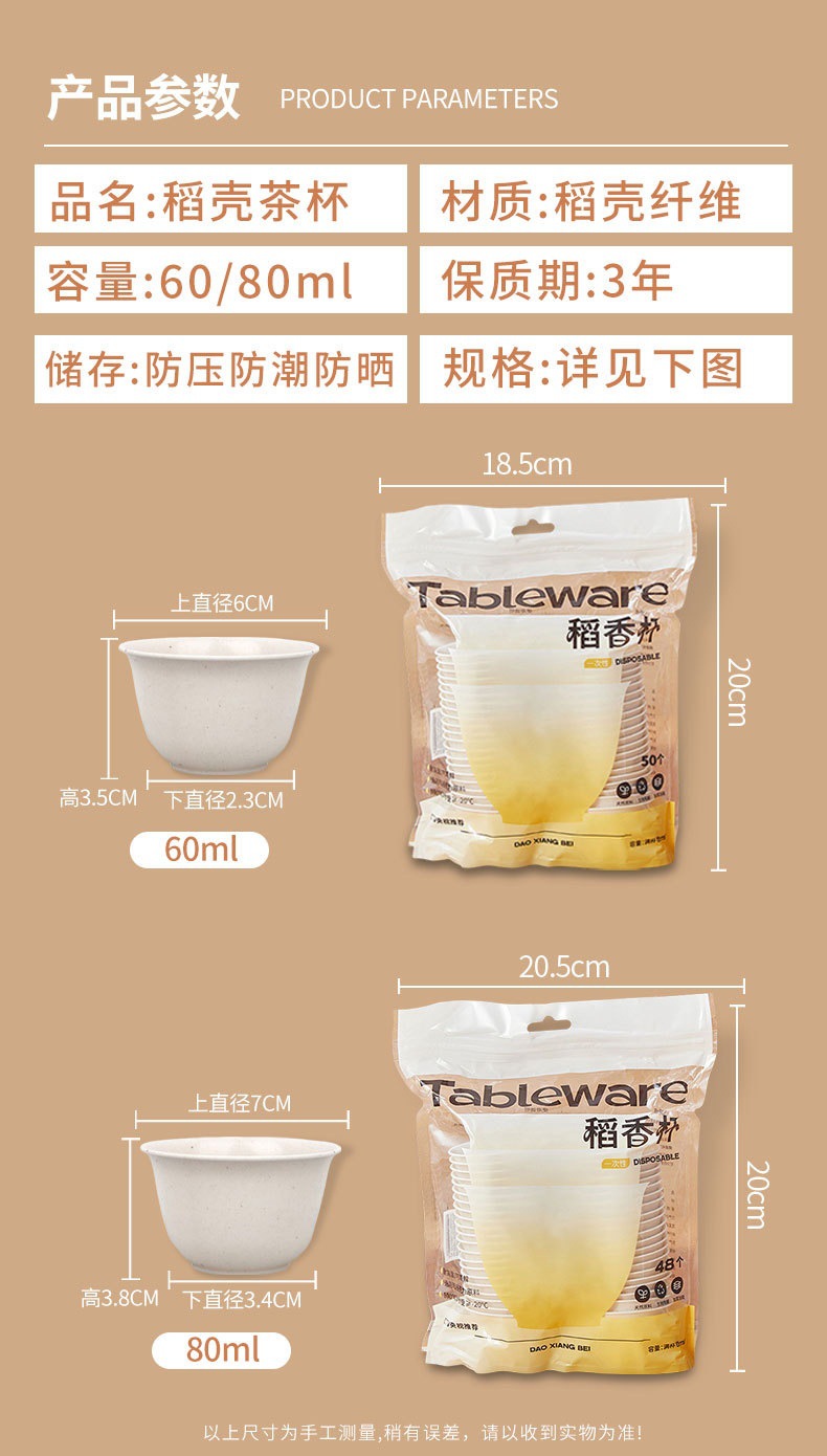 Объемные чайные чашки из рисовой шелухи объемом 60 мл (2400 штук в коробке); Чайные чашки из рисовой шелухи по 60 мл в пакетиках (2400 штук в коробке); Чайные чашки из рисовой шелухи по 80 мл в пакетиках (1000 штук в коробке); Утолщенная мастер-чашка/чашка для рисовой шелухи объемом 120 мл (1000 штук в коробке)