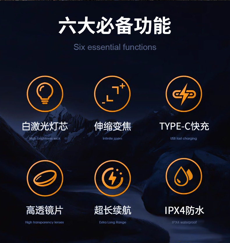 Алюминиевая головка с высоким люменом (бело-лазерный зум); Пластиковая головка с низким люменом (бело-лазерный зум); Белый лазер (цифровой дисплей +1200 мАч); Алюминиевая головка с белым лазером (индукция +1200 мАч); Алюминиевая головка с функцией масштабирования (белый лазер + датчик цифрового дисплея); Трехрежимный алюминиевый налобный фонарь (белый, желтый, синий + цифровой дисплей с датчиком движения); Белый и желтый двойной лазер (головка из алюминиевого сплава + 1800 мАч), черная модель; Бело-желтый двойной лазер (головка из алюминиевого сплава +1800 мАч) камуфляжная модель; Высокая конфигурация (белый лазер + индукционный дисплей) 3000 мАч; Стандартная конфигурация (белый лазер + индукционный дисплей) 1500 мАч
