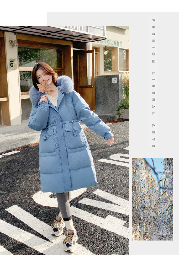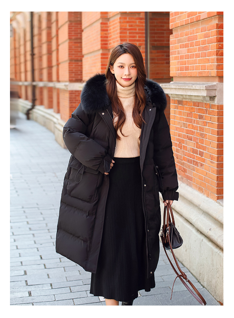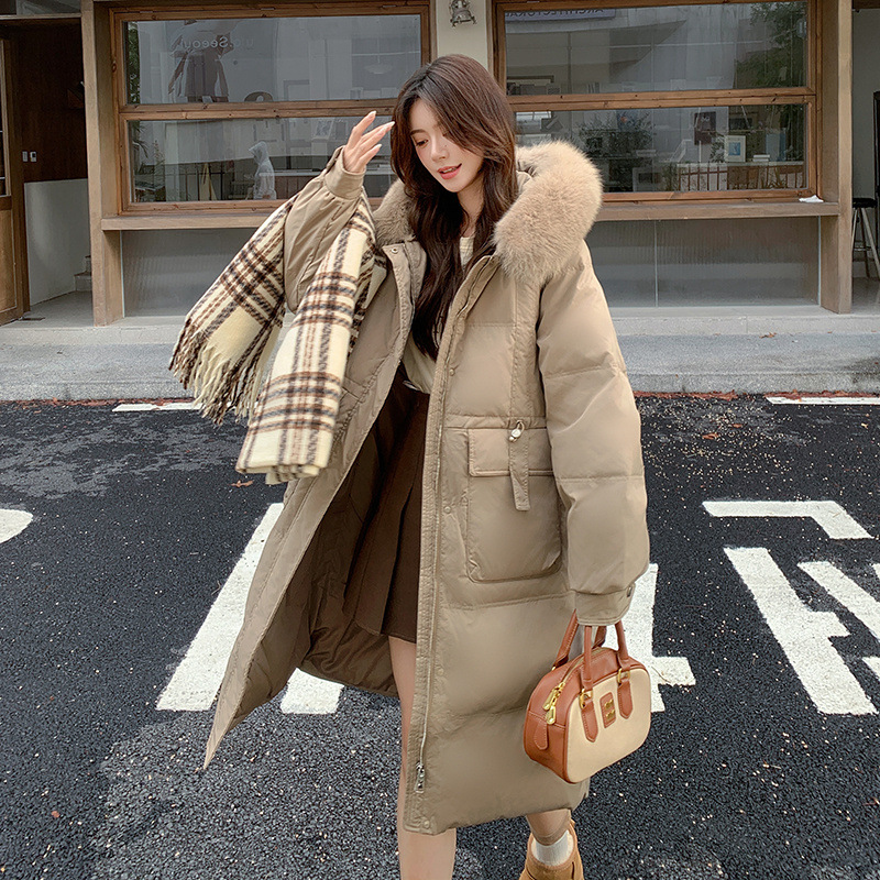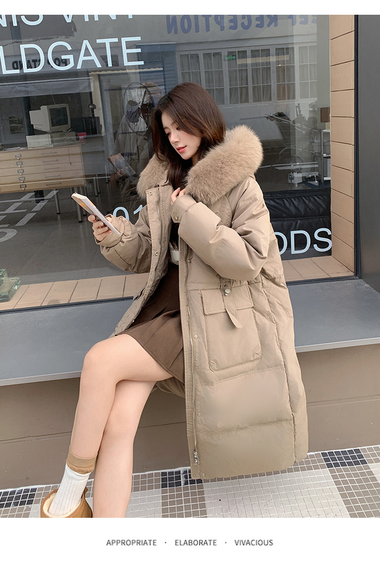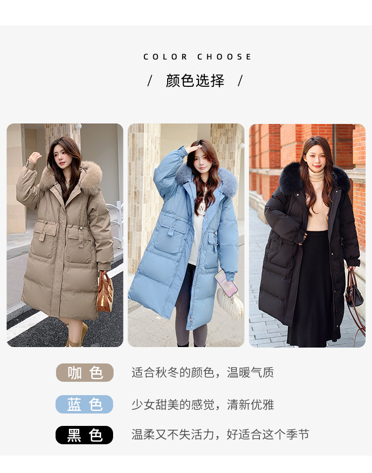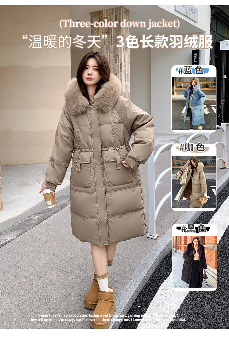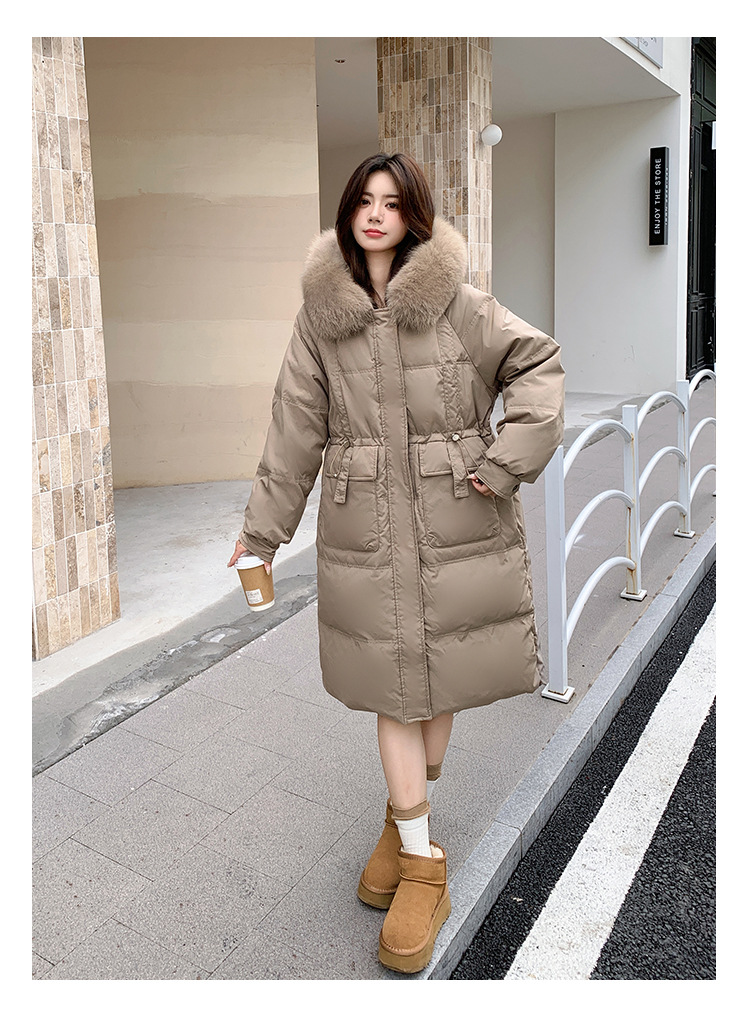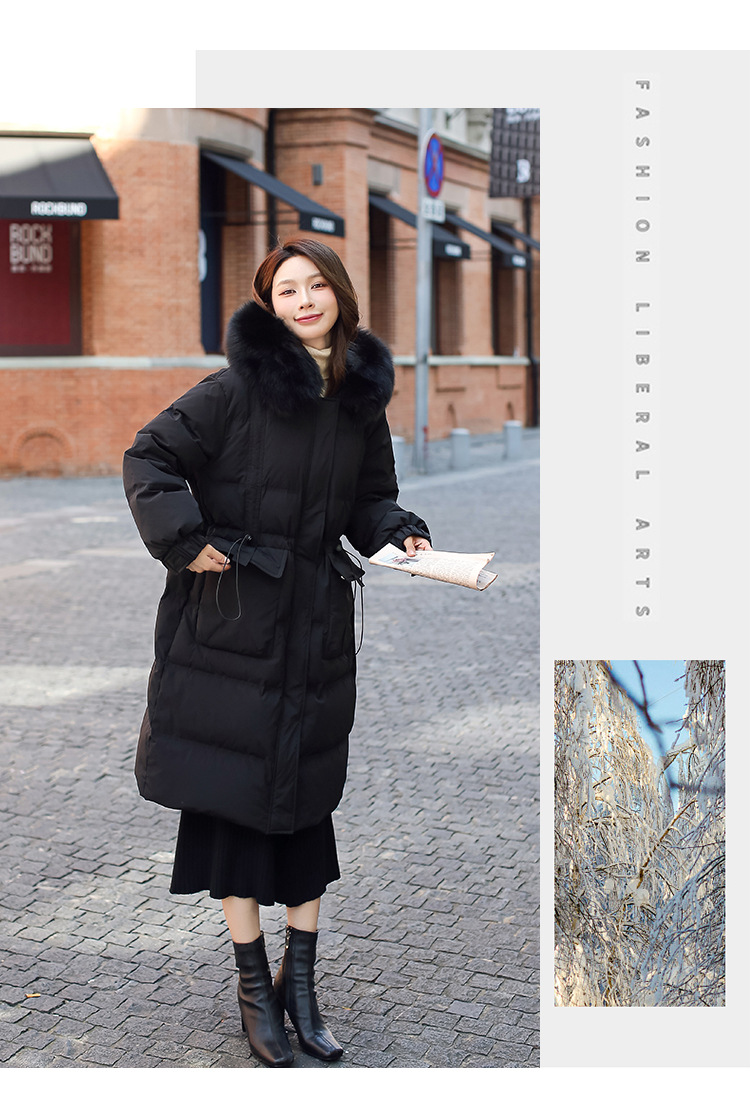 2025 новая женская одежда больших размеров, 100kg модный длинный пуховик для похудения с завязками на талии и воротником из лисьего меха 218