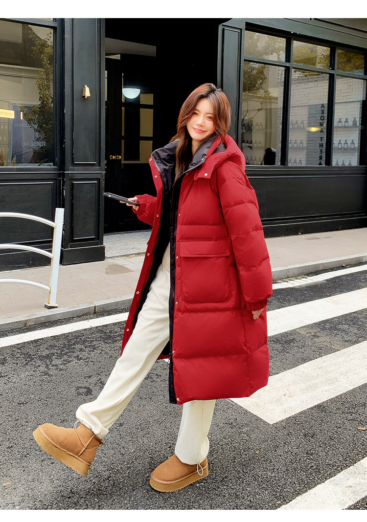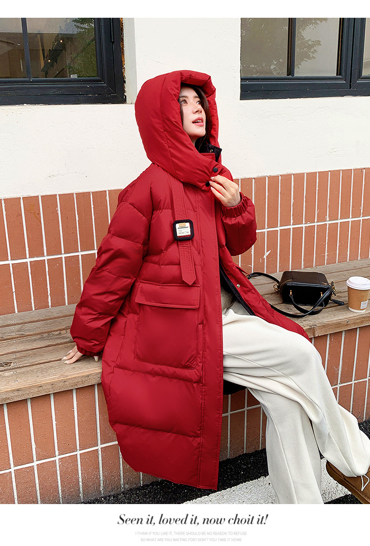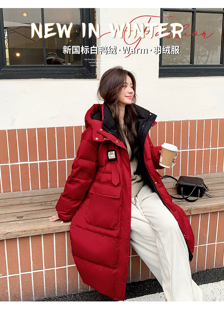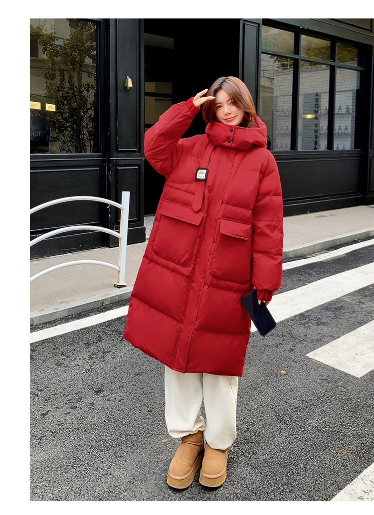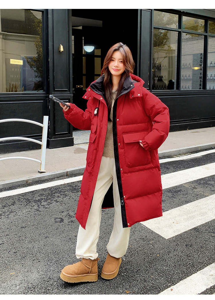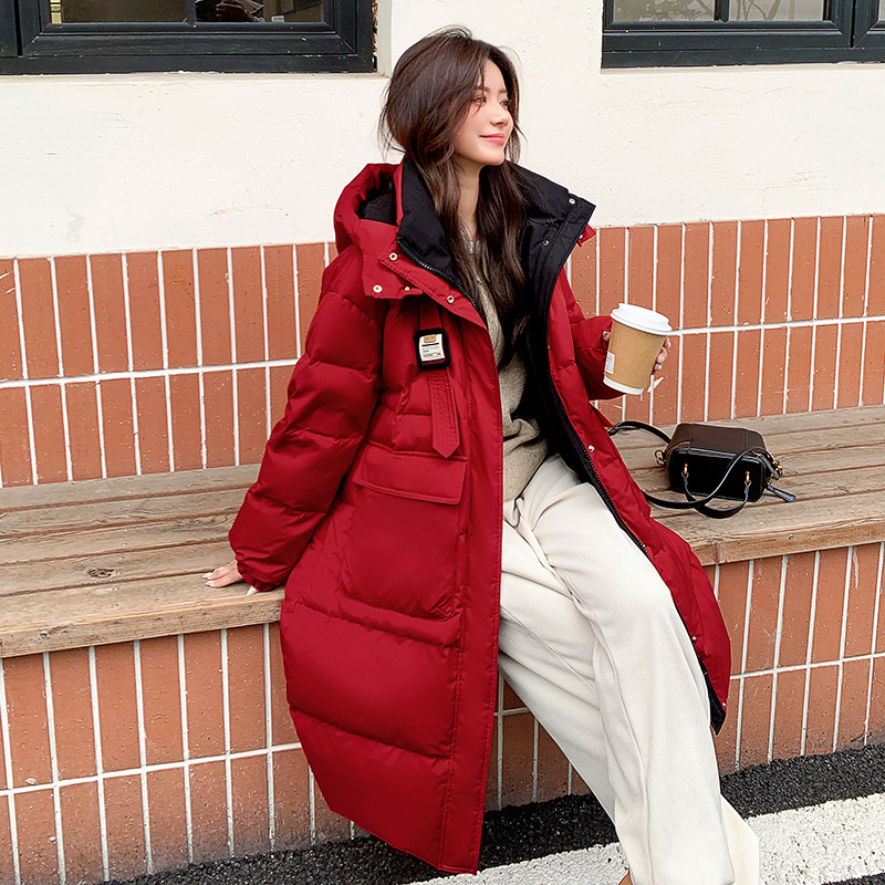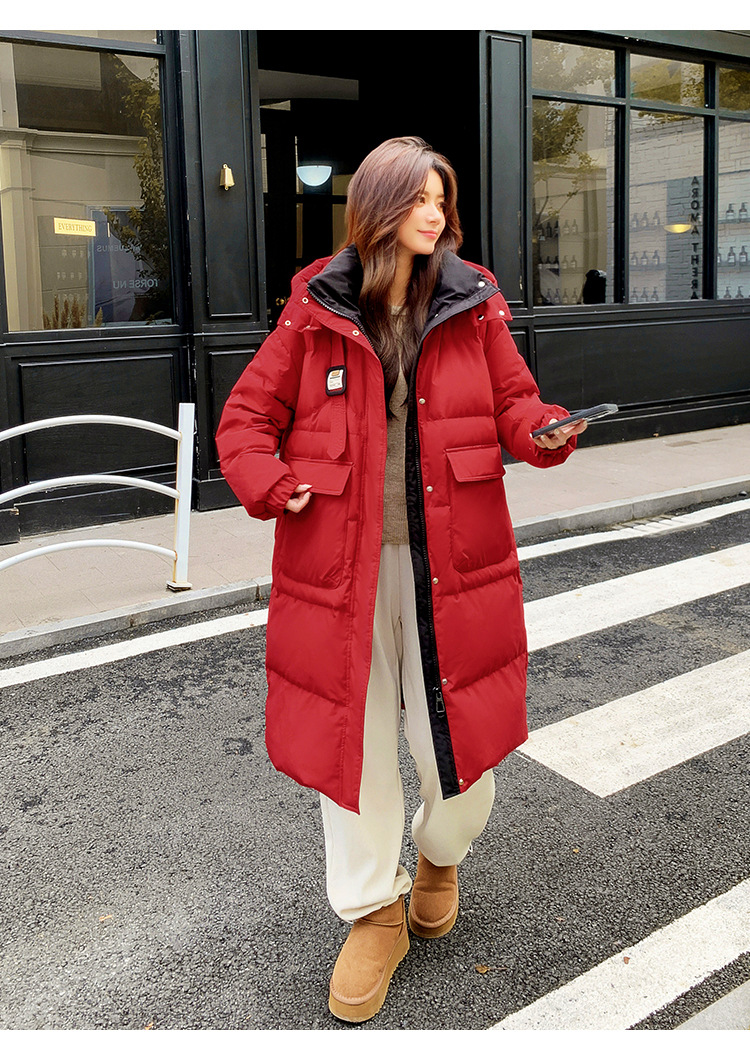2025 новый корейский стиль, длинная зимняя свободная пуховая куртка больших размеров из ангоры с контрастным красным цветом, 230