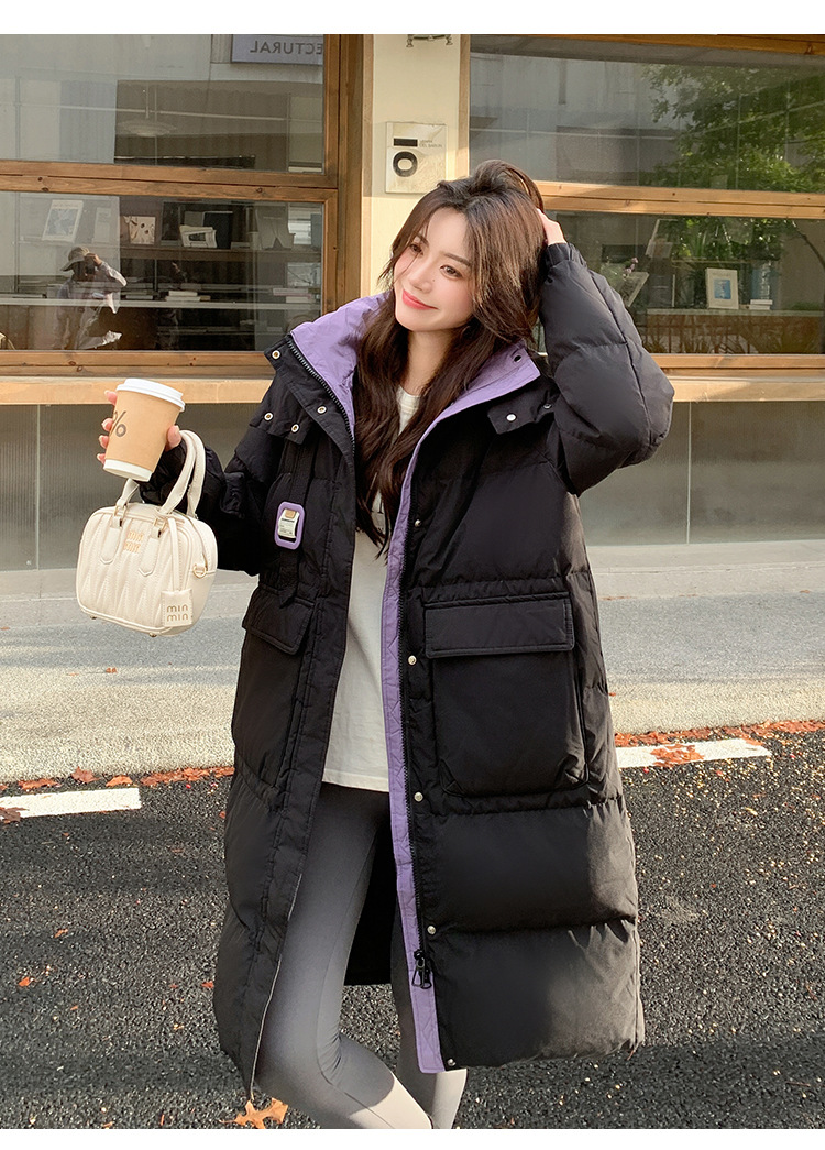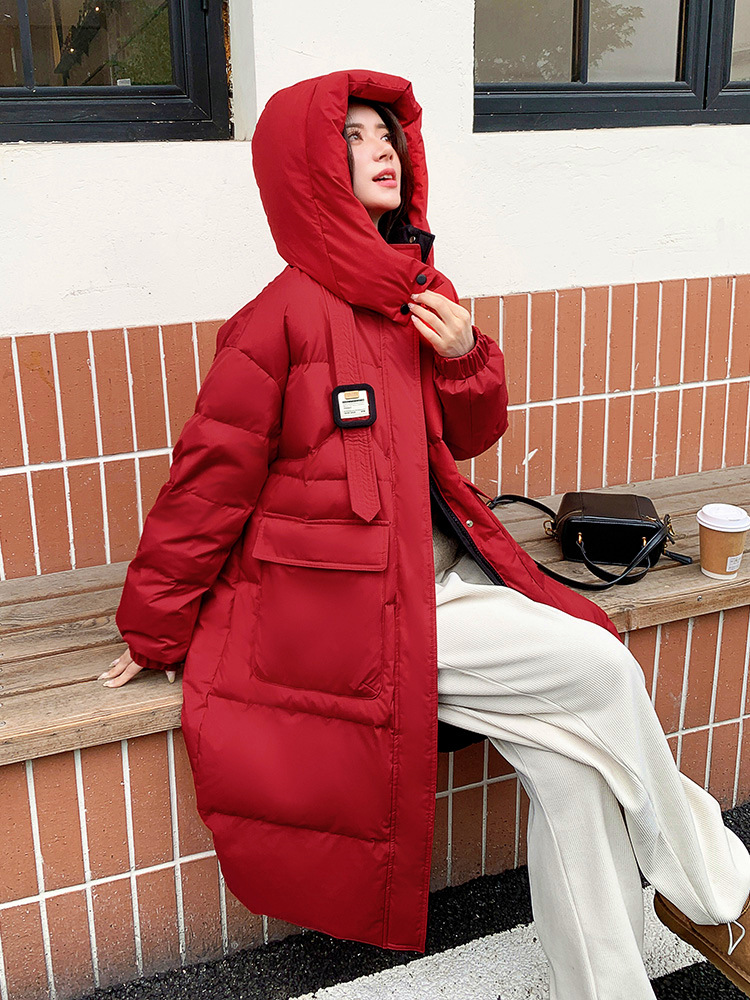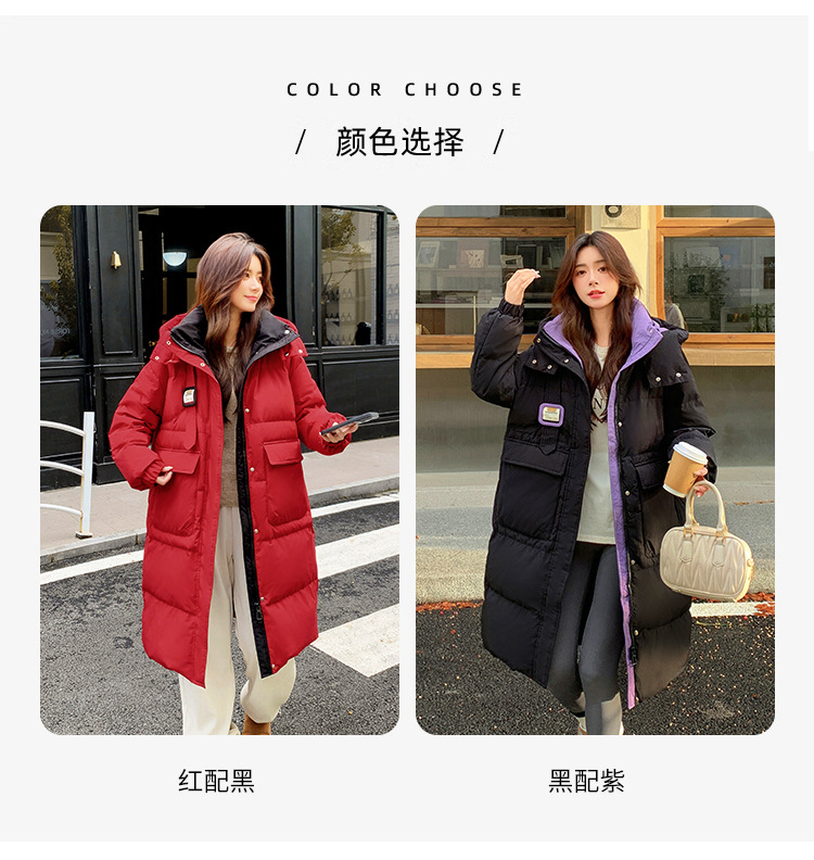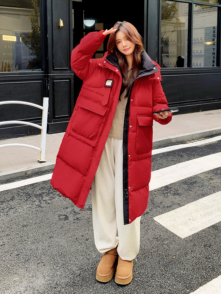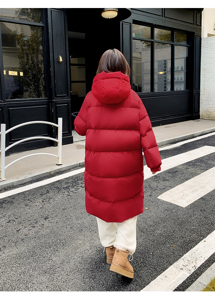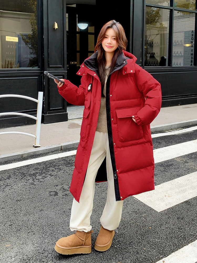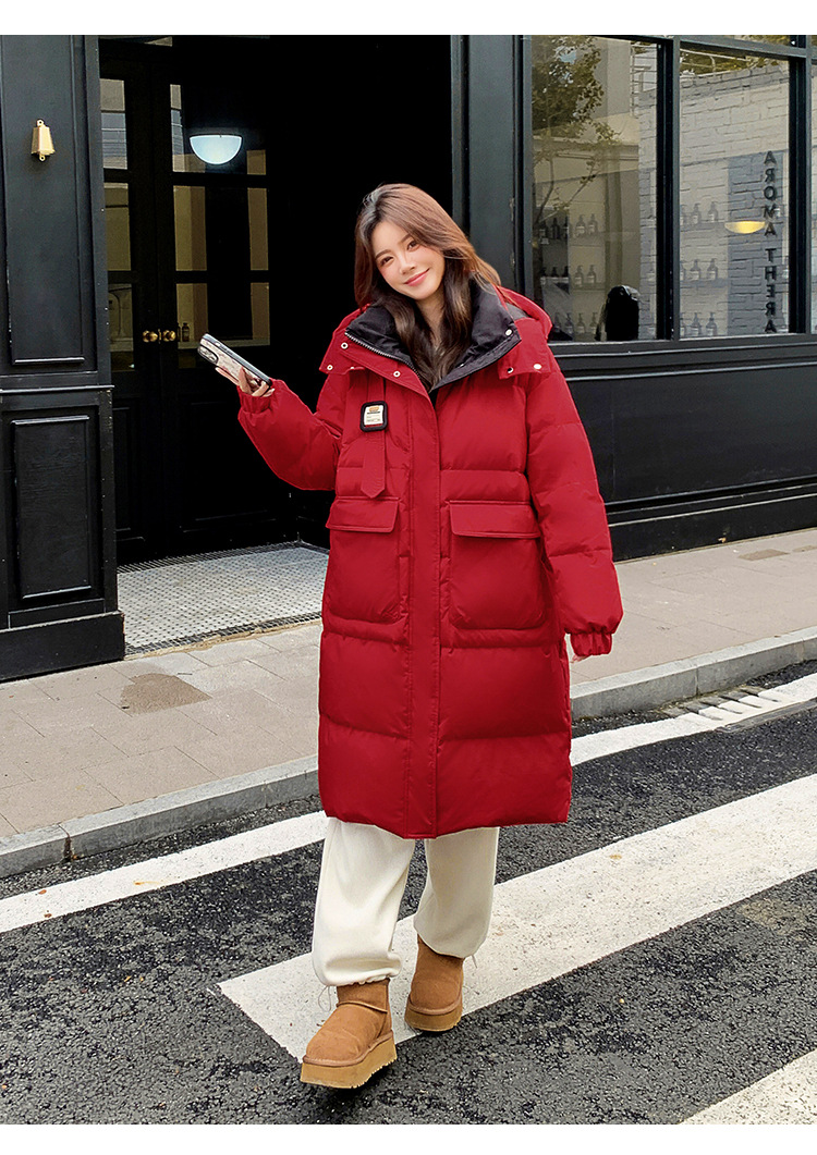 2025 новый корейский стиль, длинная зимняя свободная пуховая куртка больших размеров из ангоры с контрастным красным цветом, 230
