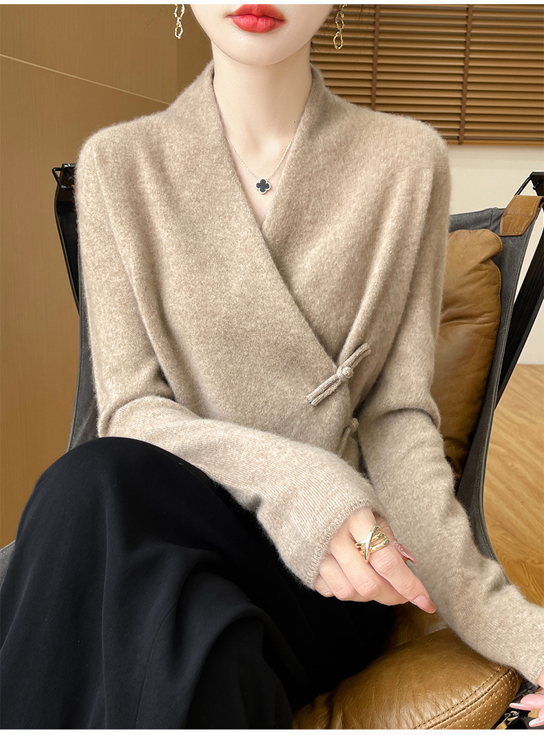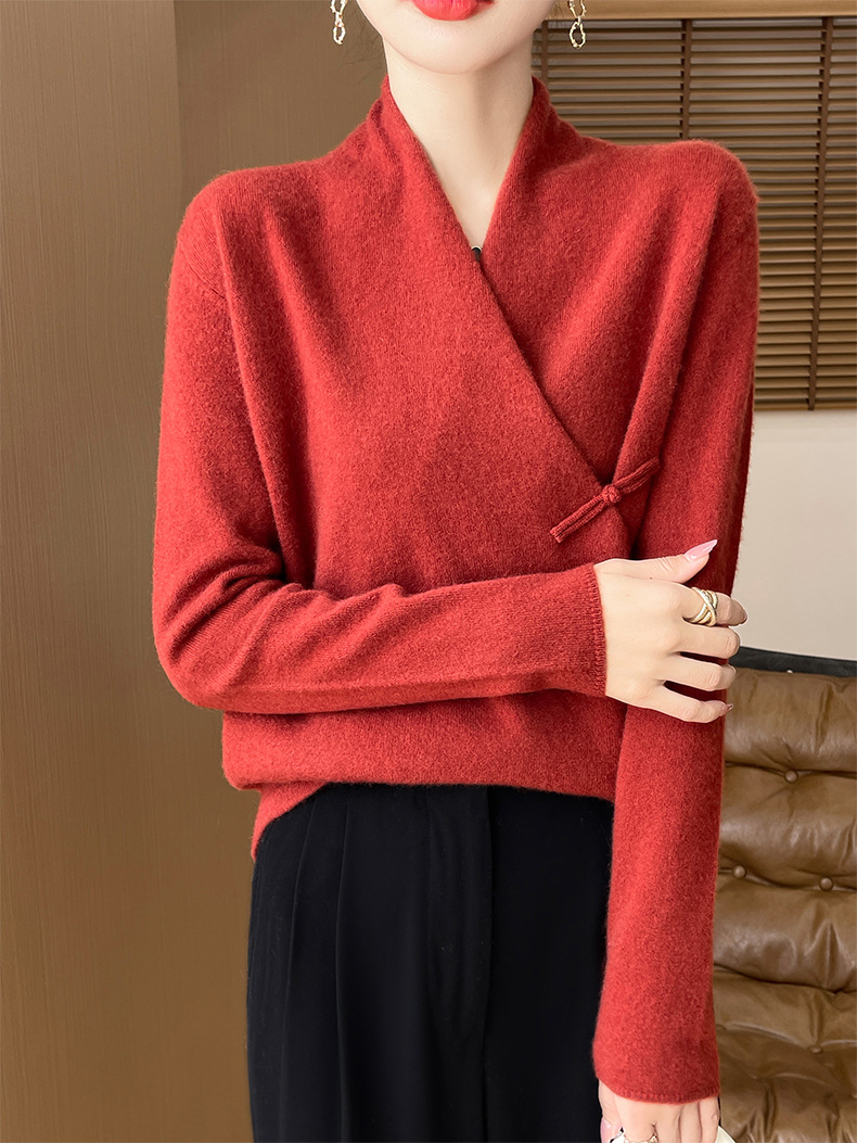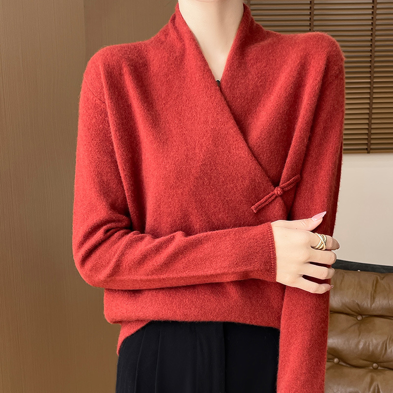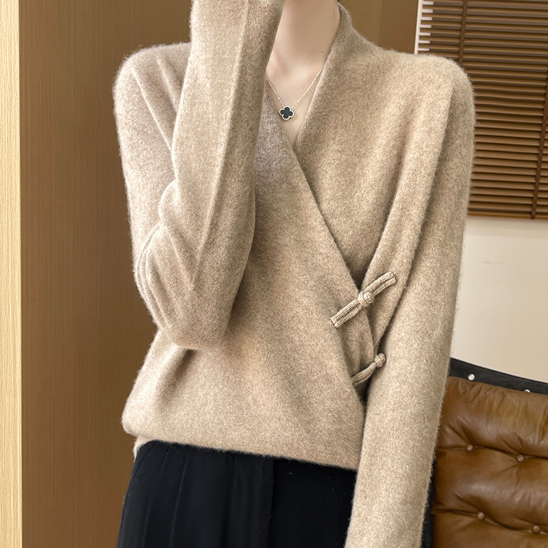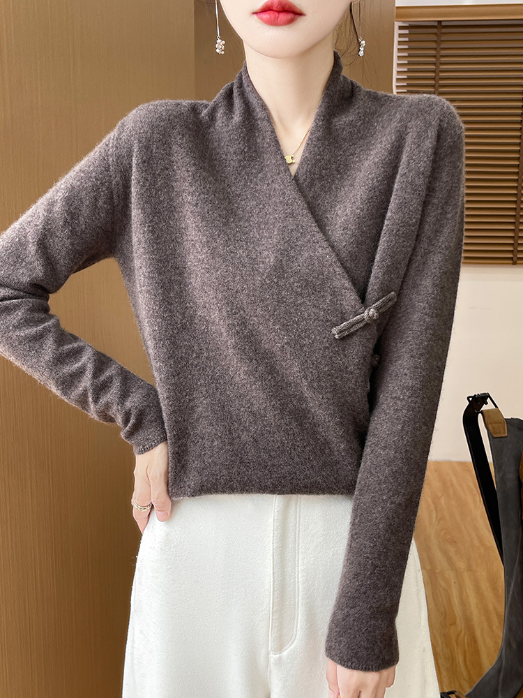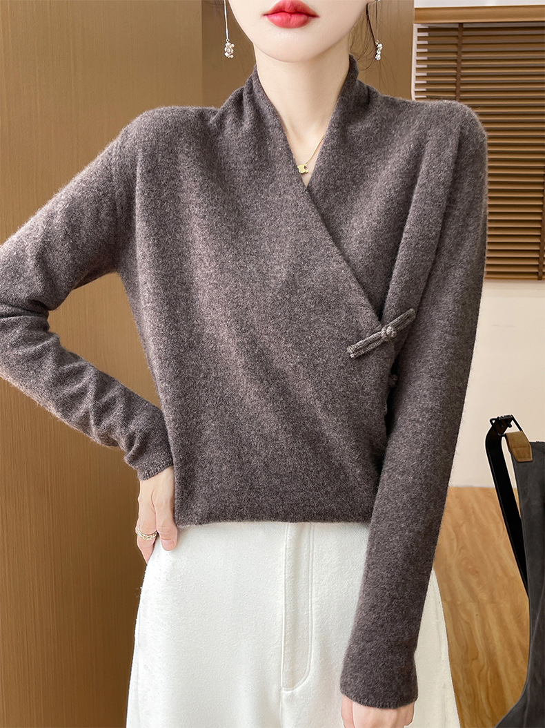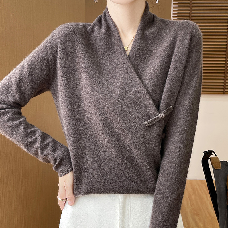 Новый осенне-зимний свитер из 100% чистой шерсти с перекрестным воротником, элегантной застежкой на пуговицы, длинными рукавами, вязаный кашемировый свитер-базовый слой.