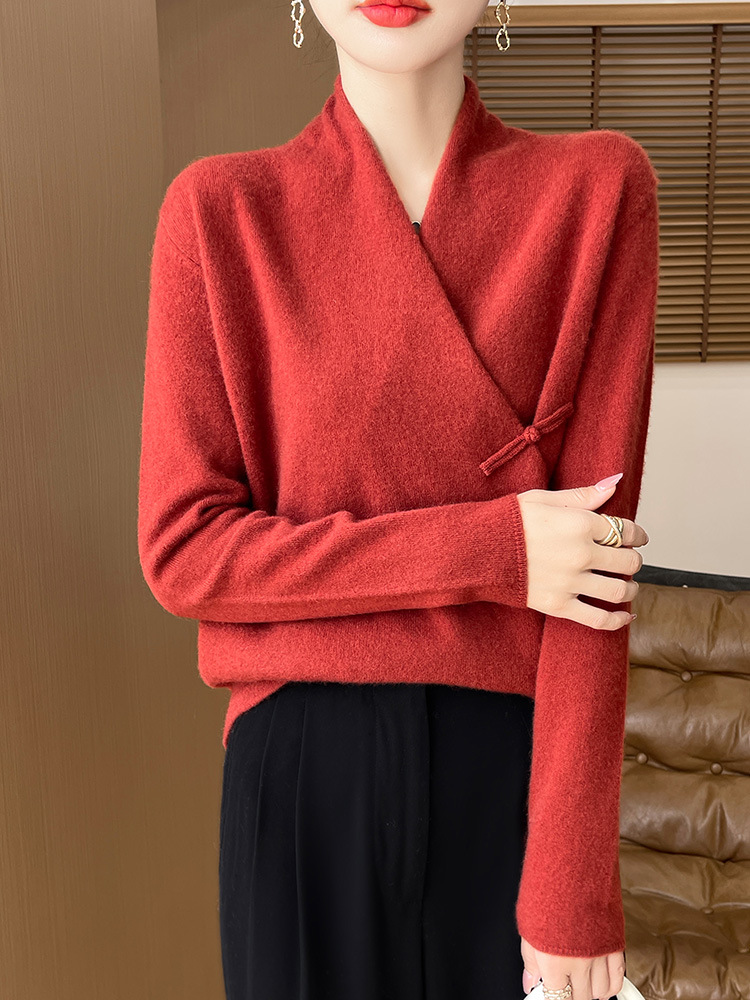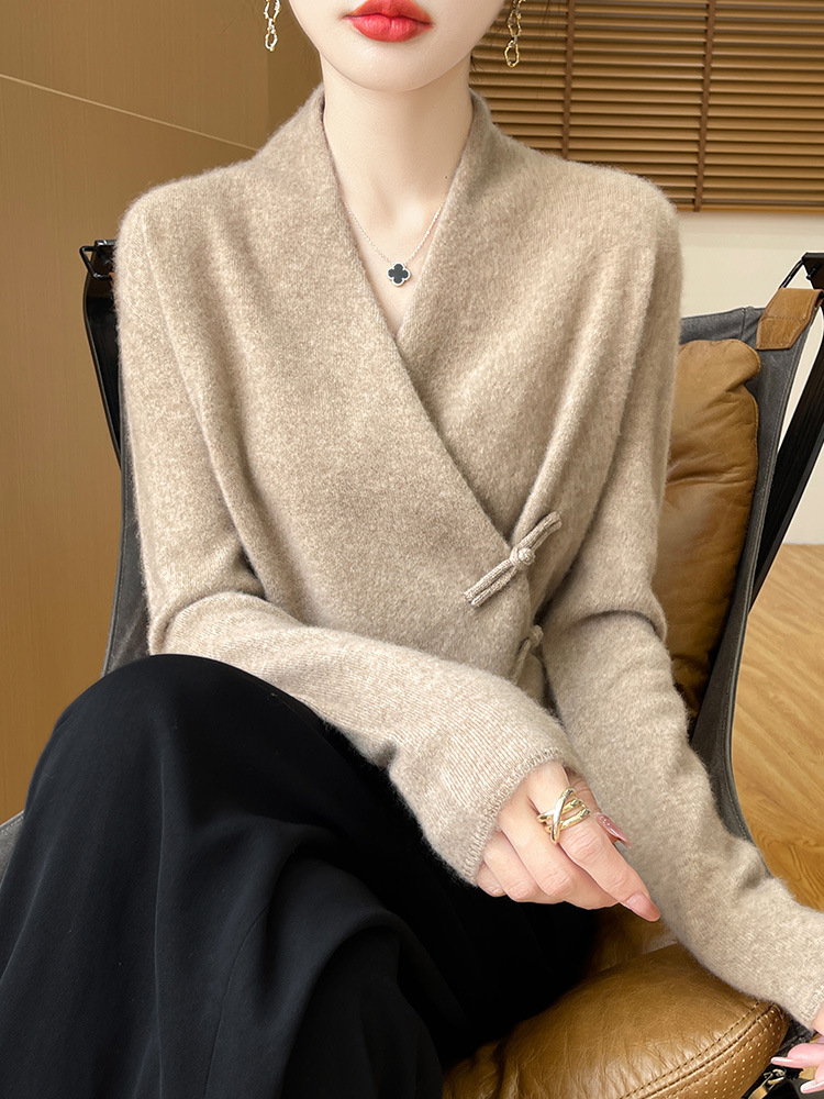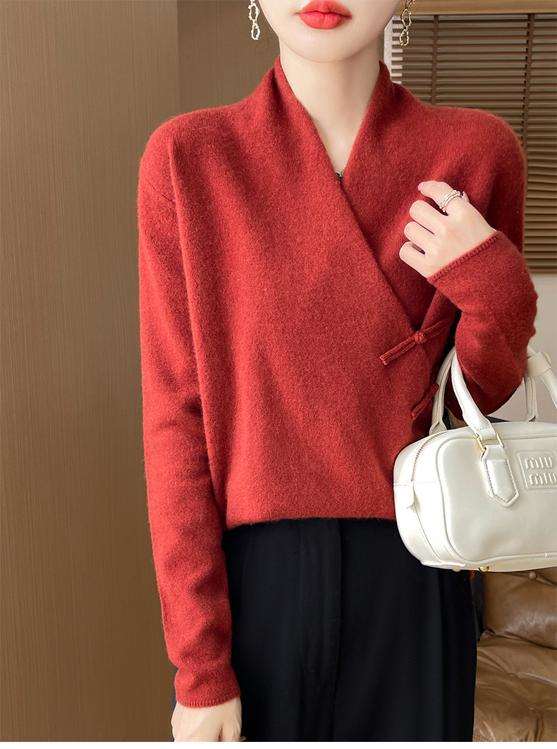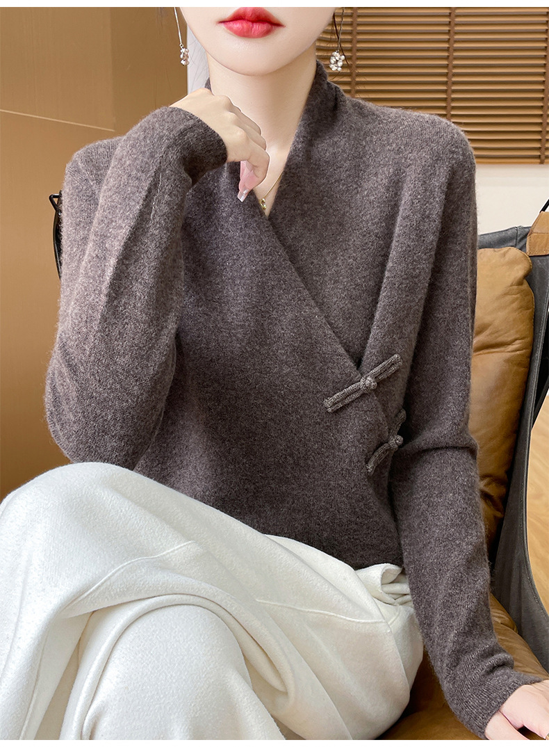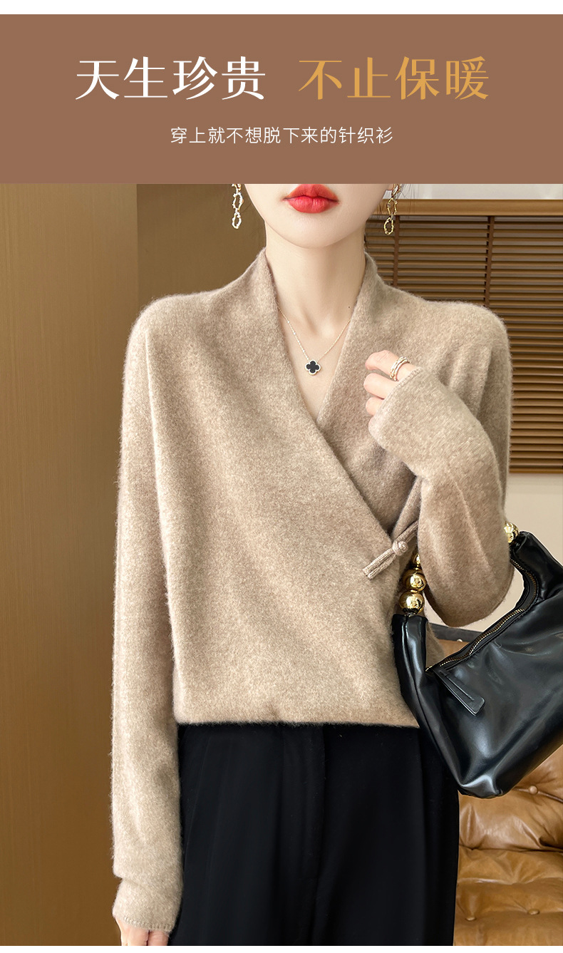 Новый осенне-зимний свитер из 100% чистой шерсти с перекрестным воротником, элегантной застежкой на пуговицы, длинными рукавами, вязаный кашемировый свитер-базовый слой.