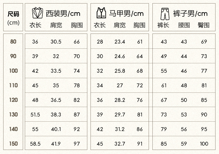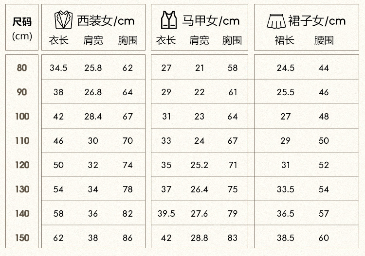 Комплект жилета для мальчика из 2 предметов (жилет + брюки); Комплект жилета для мальчика из 3 предметов (рубашка + жилет + брюки); Комплект куртки из 2 предметов для мальчика (куртка + брюки); Комплект куртки для мальчика из 3 предметов (рубашка + куртка + брюки); Костюм-тройка для мальчика (куртка+жилет+брюки); Костюм-четвёрка для мальчика (рубашка+верхняя одежда+жилет+брюки); Комплект жилета для девочек из 2 предметов (жилет + юбка); Комплект жилета для девочек из трех предметов (рубашка + жилет + юбка); Комплект куртки для девочек из 2 предметов (куртка + юбка); Комплект куртки для девочек из трех предметов (рубашка + куртка + юбка); Костюм-тройка для девочки (куртка + жилет + юбка); Костюм-четвёрка для девочек (рубашка+пальто+жилет+юбка)