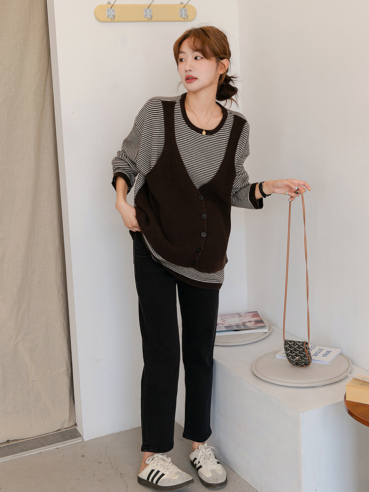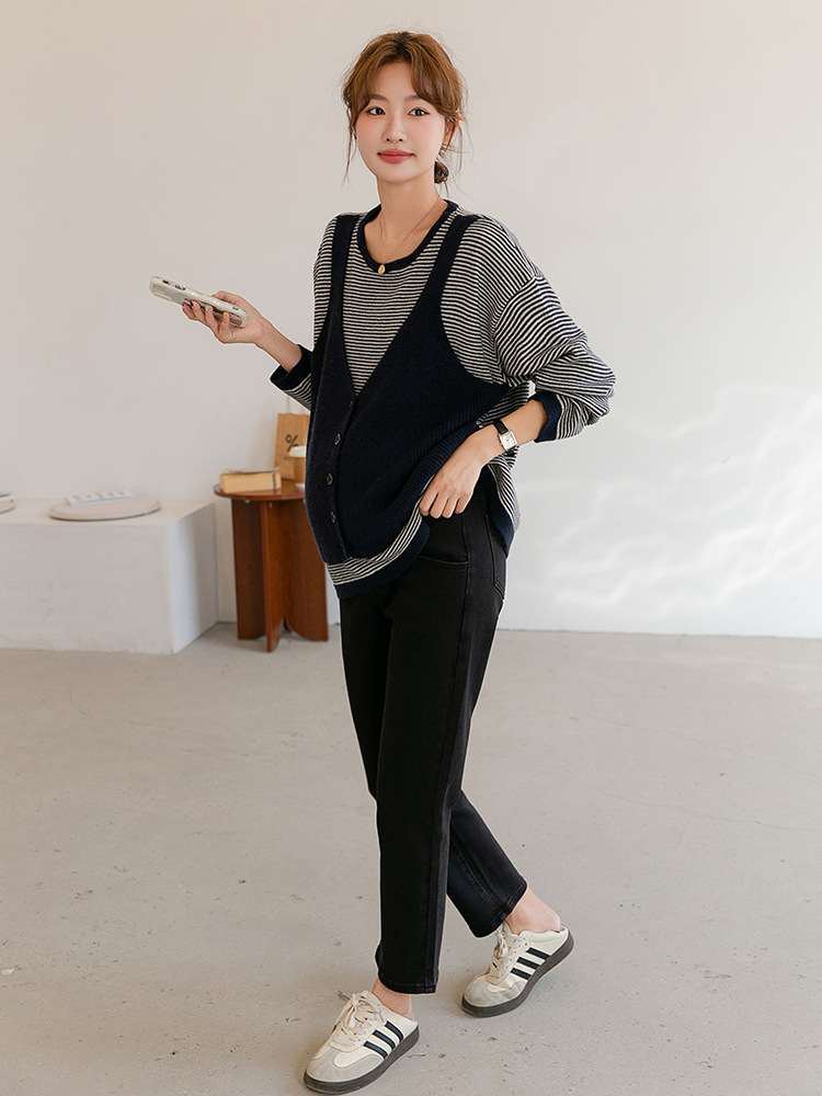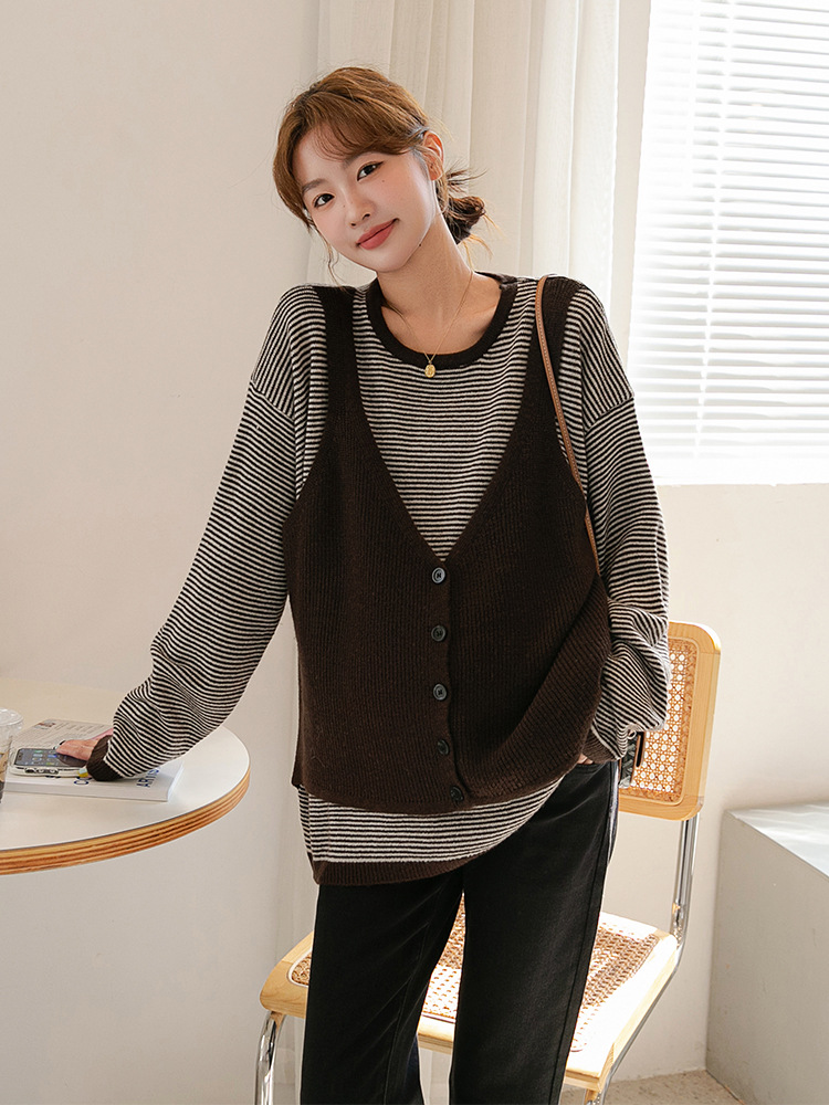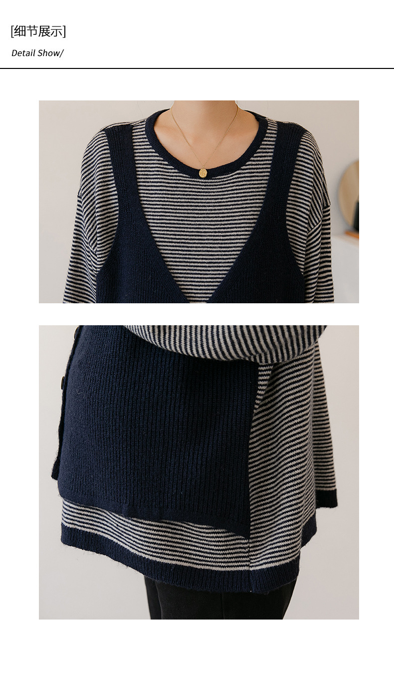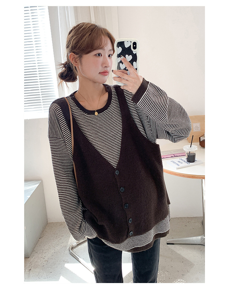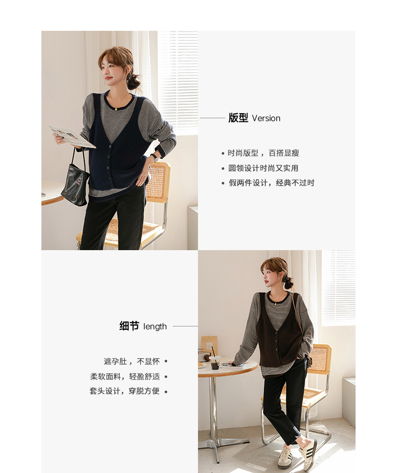 Осенняя и зимняя одежда для беременных корейская мода поддельные два беременных свитера свободные полоски жилет поддельные два блузки
