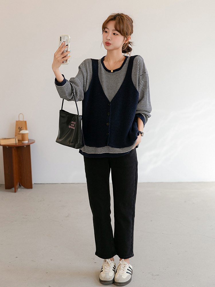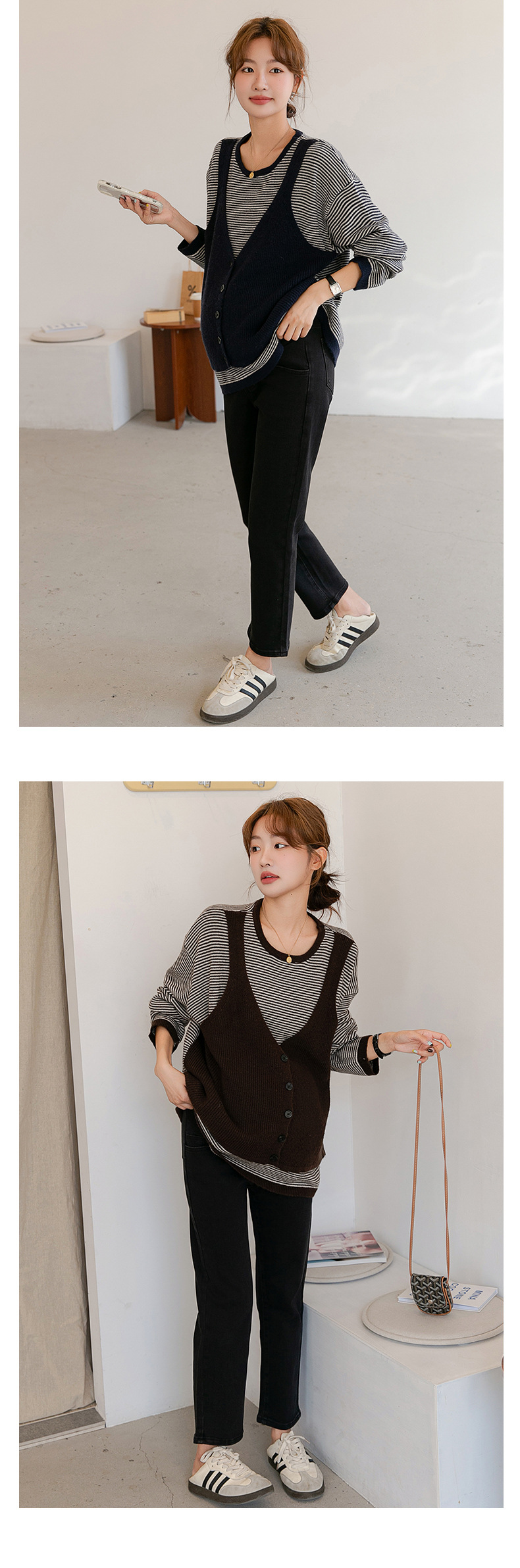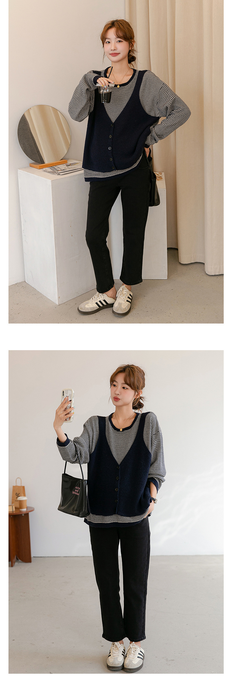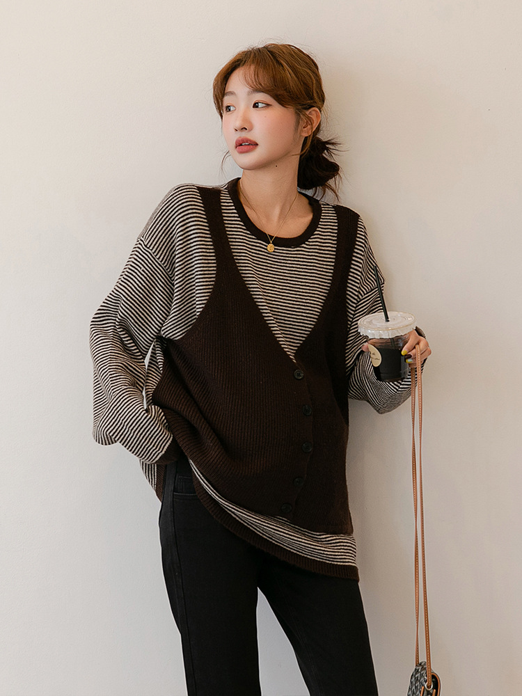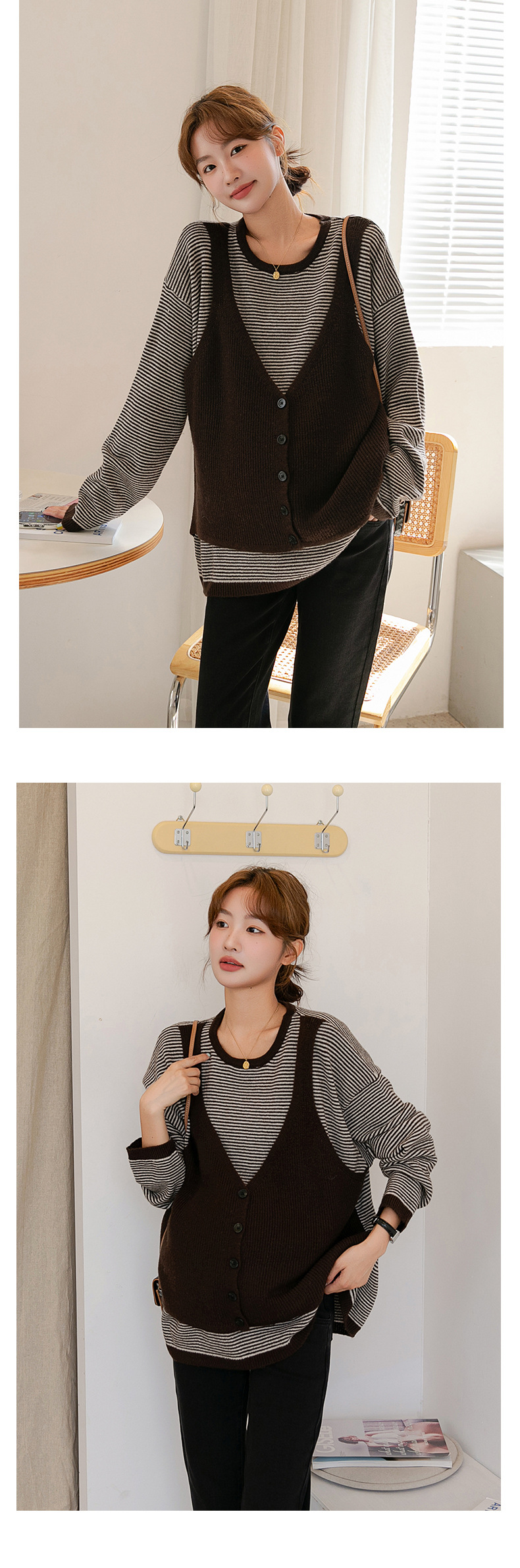 Осенняя и зимняя одежда для беременных корейская мода поддельные два беременных свитера свободные полоски жилет поддельные два блузки
