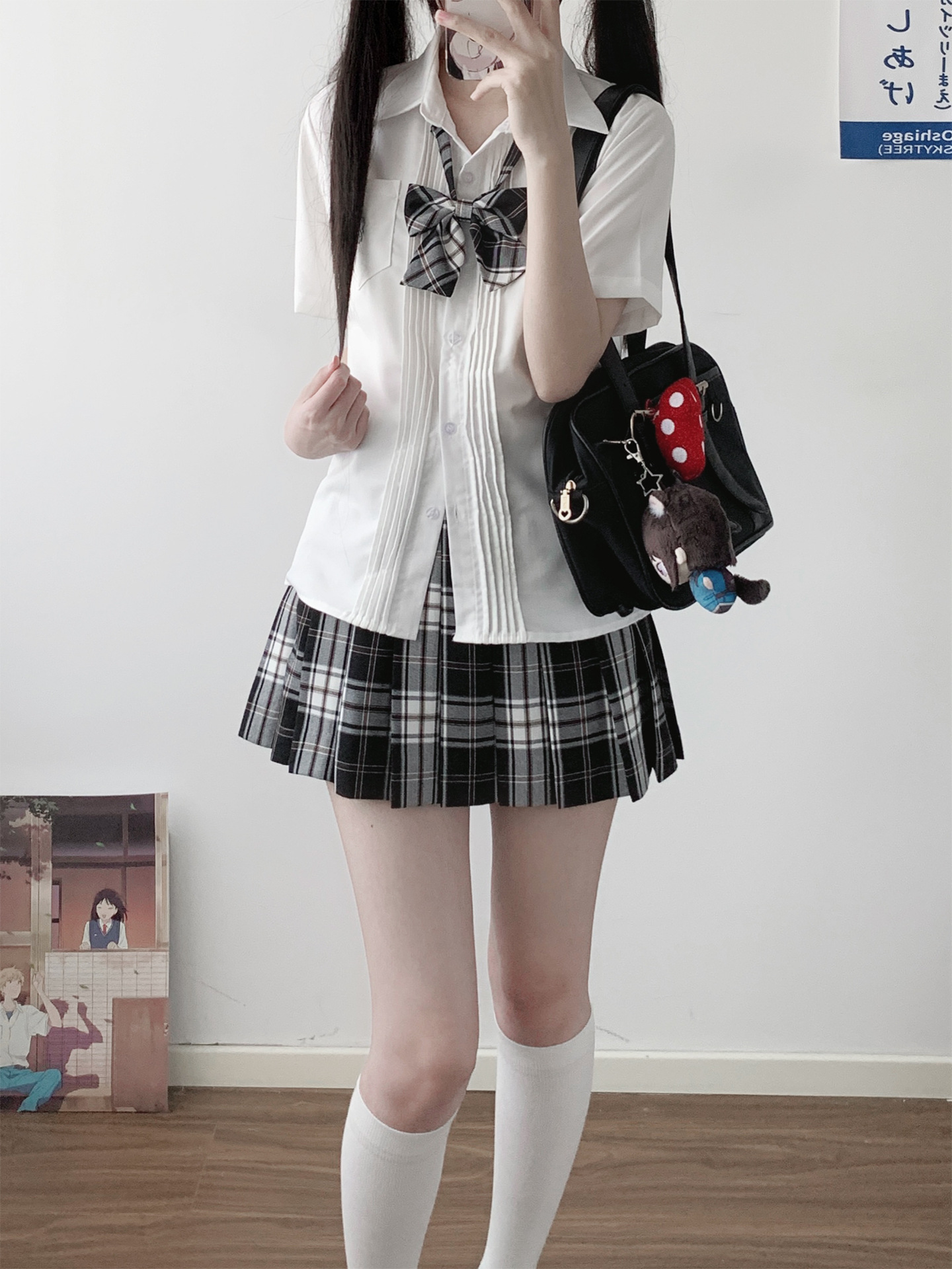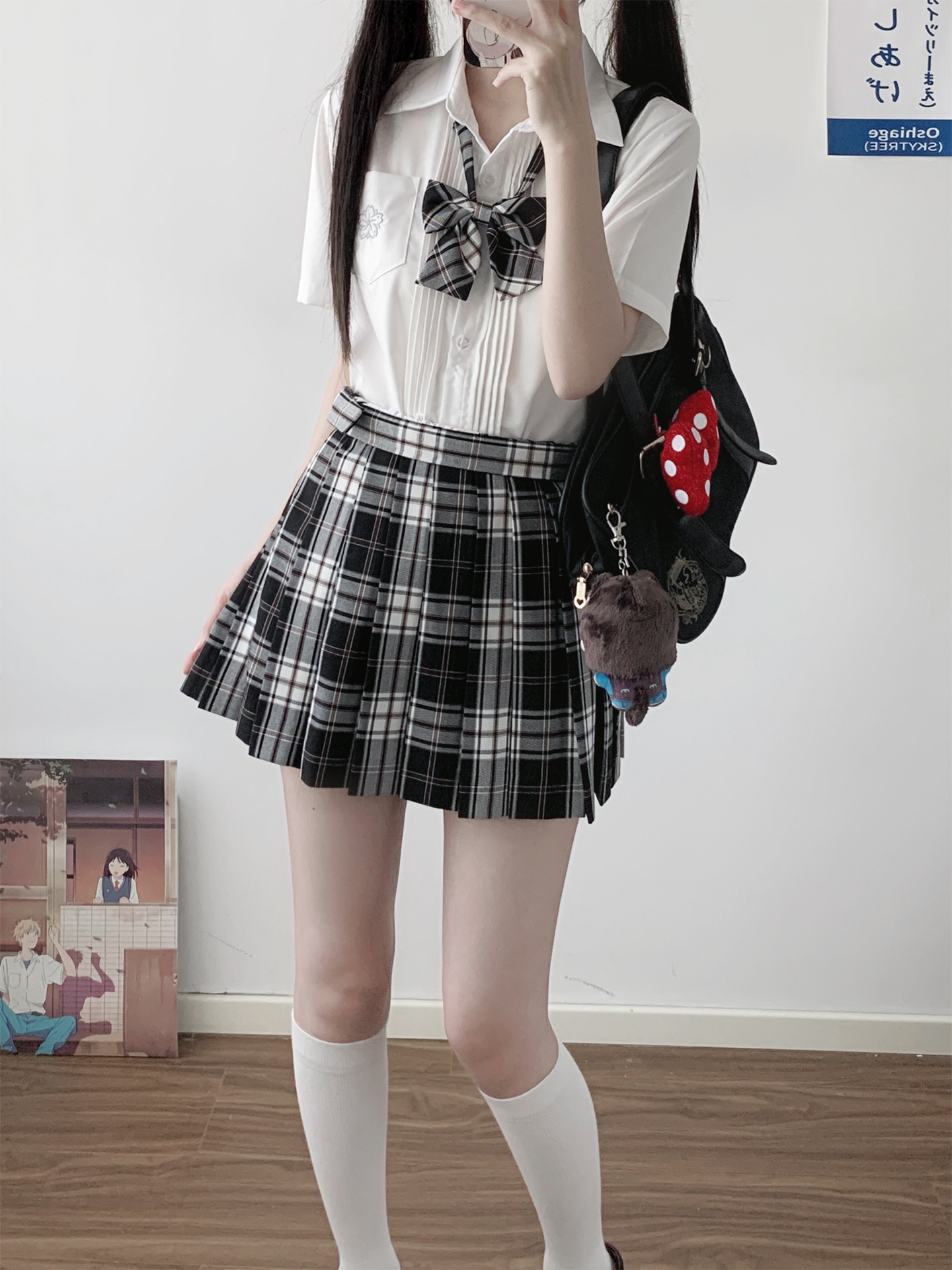 Юбка в клетку 36 см + галстук-бабочка; Клетчатая юбка 39 см + галстук-бабочка; Юбка в клетку 42 см + галстук-бабочка; Рубашка Haiying со средними короткими рукавами + юбка Moxie длиной 36 см + галстук-бабочка + черные защитные штаны