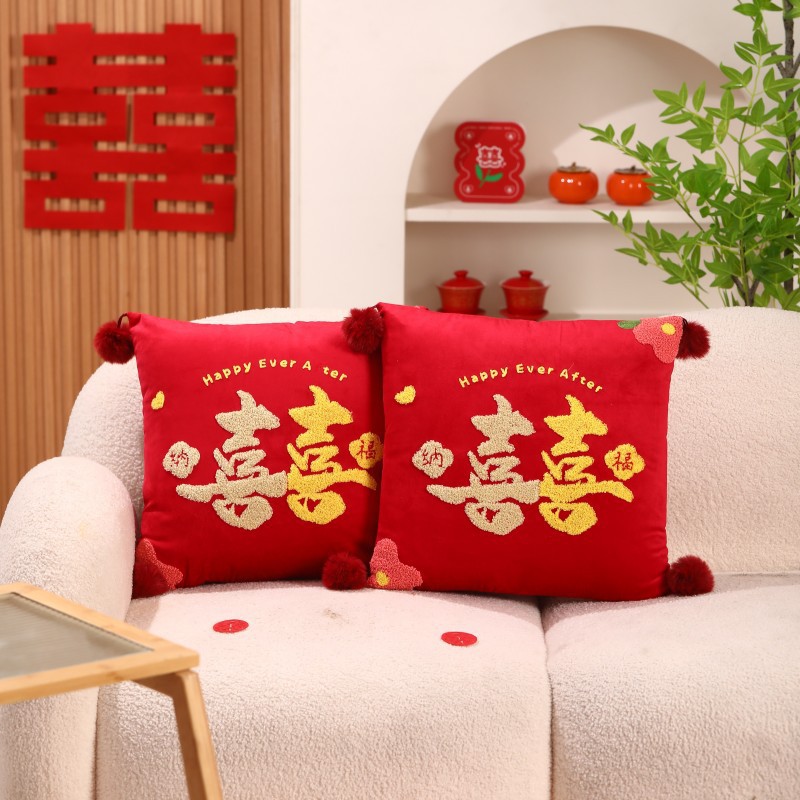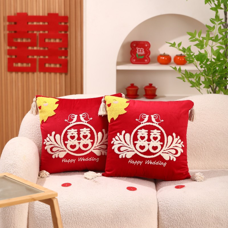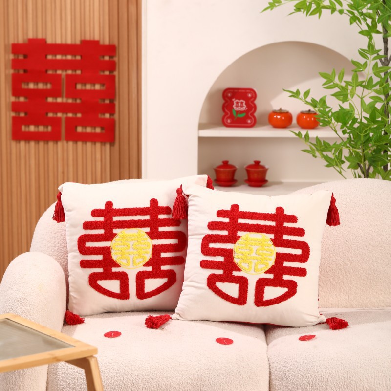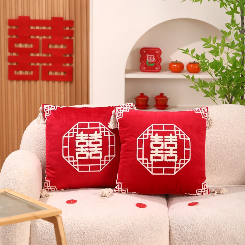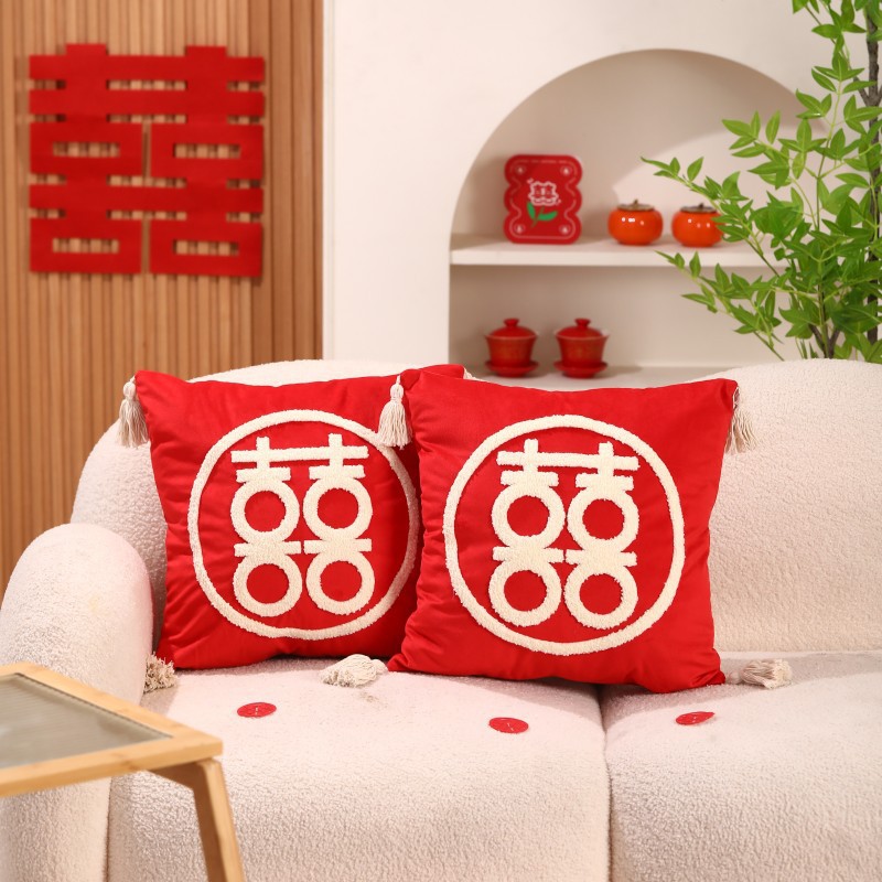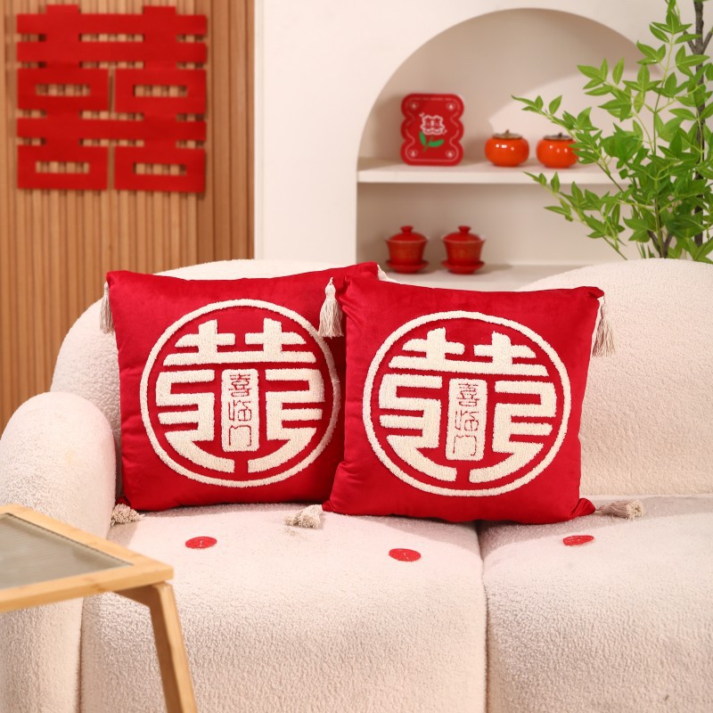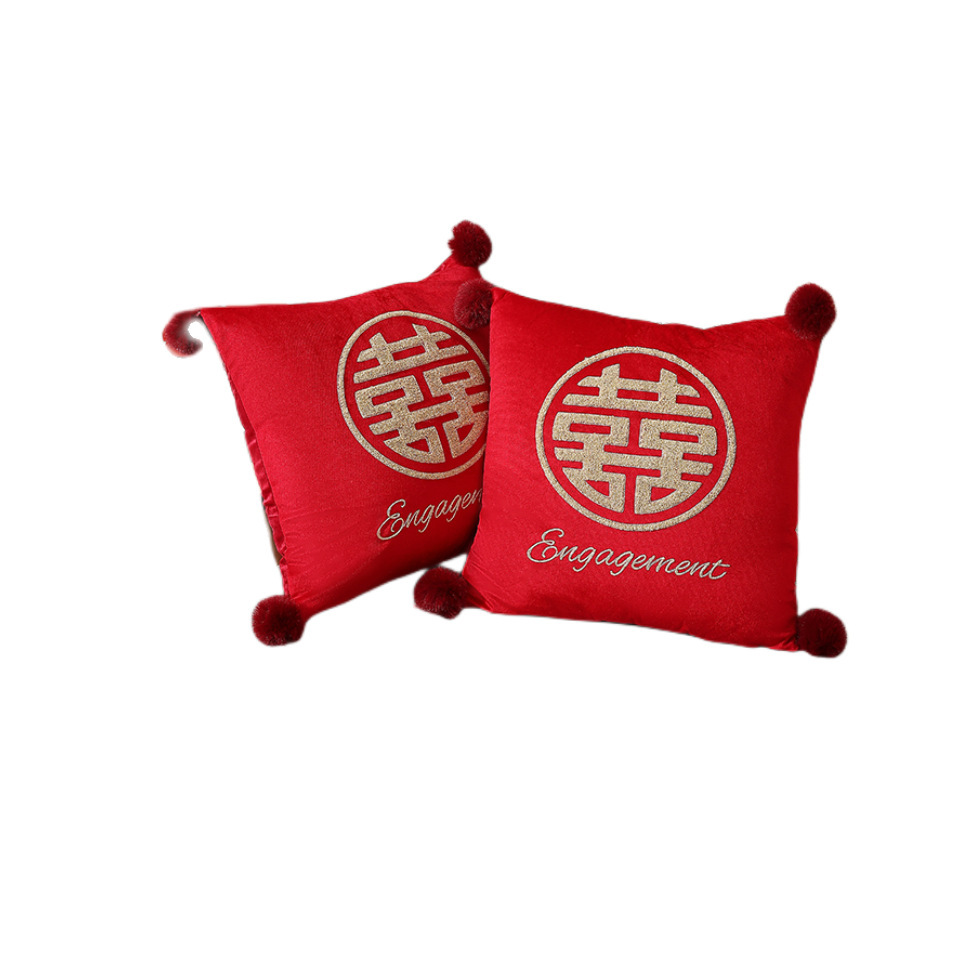 Подушки для свадебного декора "Двойное счастье", пара свадебных подушек для украшения свадебного зала, подушки для кровати молодоженов, красные подушки "Двойное счастье", полный комплект свадебных принадлежностей.
