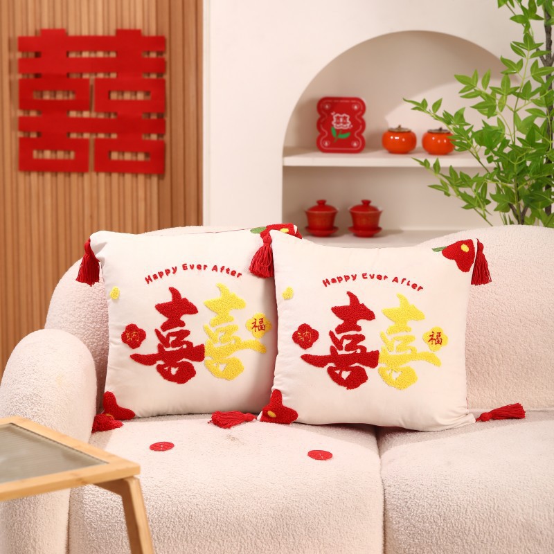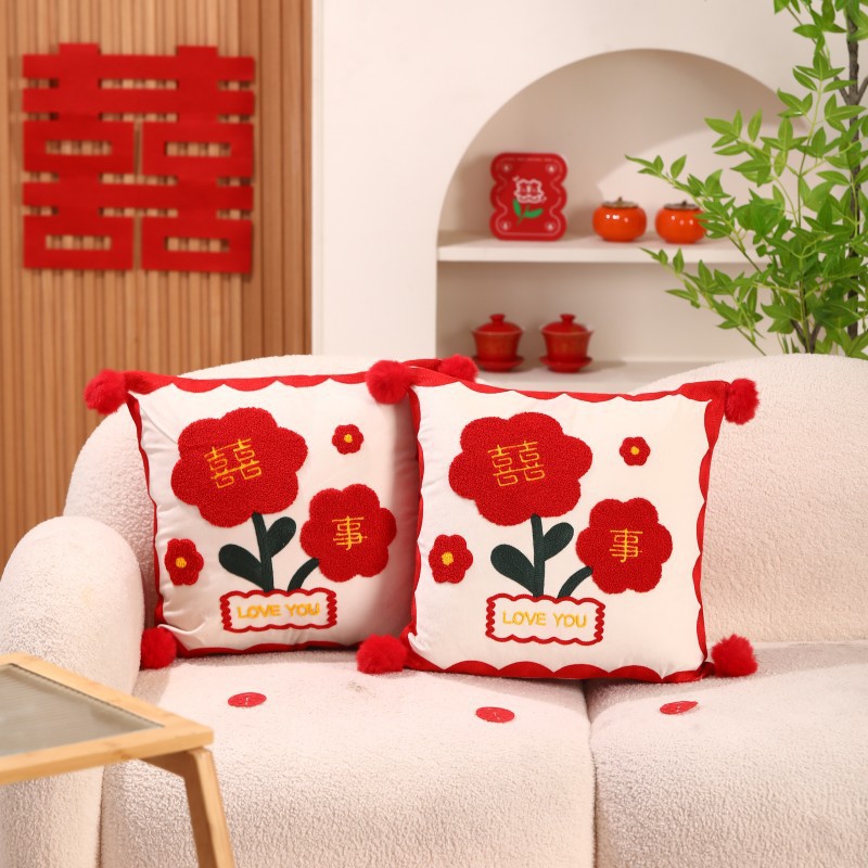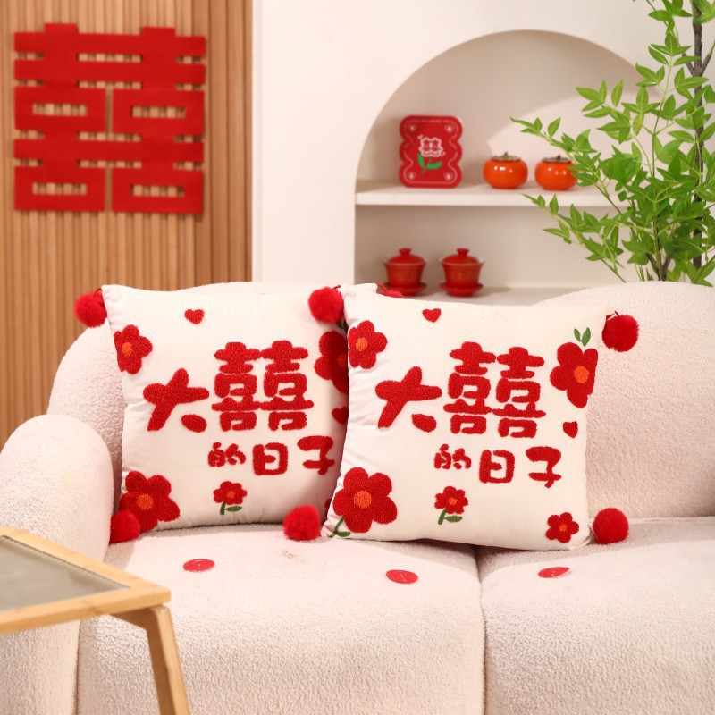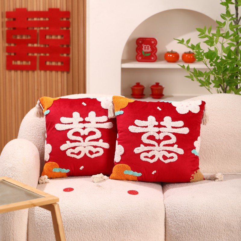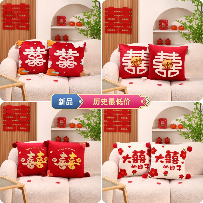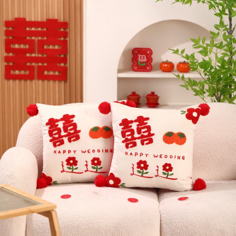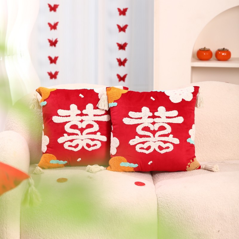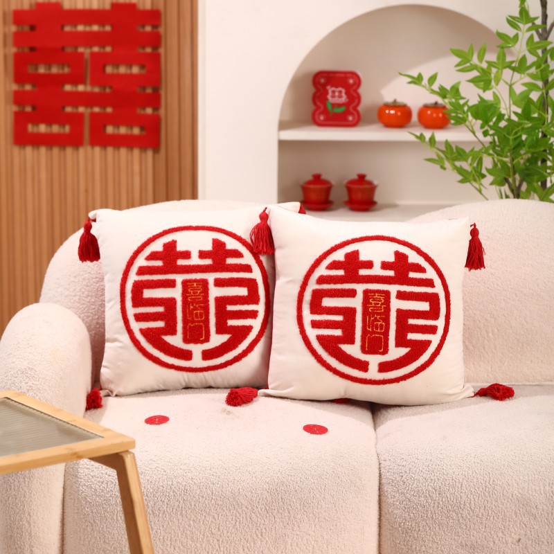 Подушки для свадебного декора "Двойное счастье", пара свадебных подушек для украшения свадебного зала, подушки для кровати молодоженов, красные подушки "Двойное счастье", полный комплект свадебных принадлежностей.