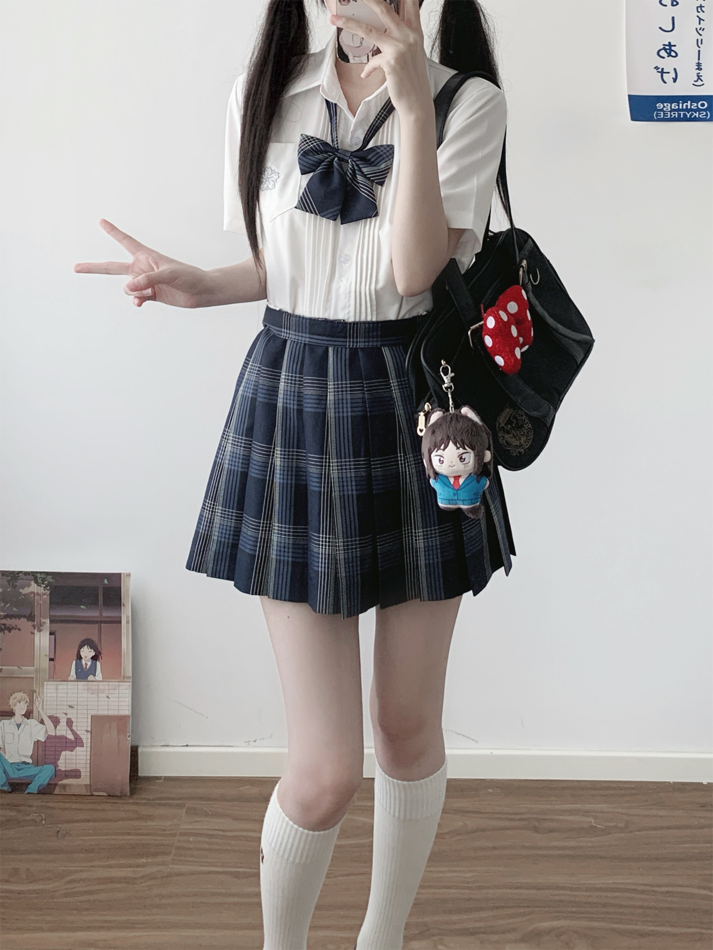 Плиссированная юбка 36 см + галстук-бабочка; Плиссированная юбка 39 см + галстук-бабочка; Плиссированная юбка 42 см + галстук-бабочка; Рубашка Haizing с короткими рукавами + юбка Qiqi 39 см + галстук-бабочка + черные леггинсы; Темно-синий пуловер с завязкой на талии + белая рубашка с длинным рукавом Xiaoya + юбка Qige длиной 39 см + галстук-бабочка + черные леггинсы