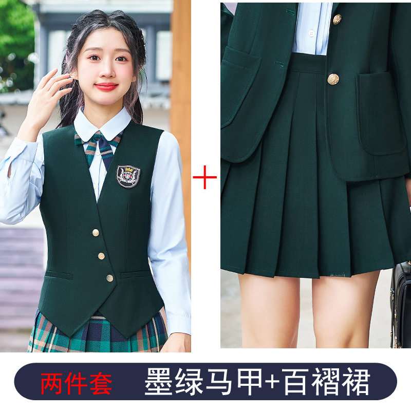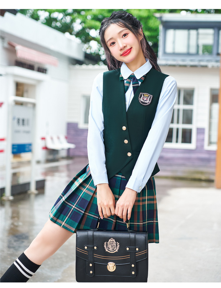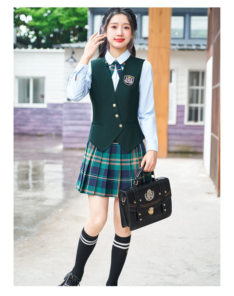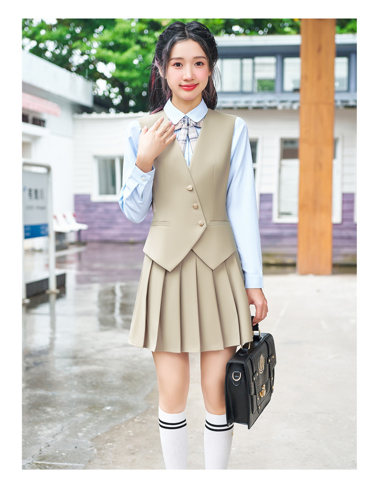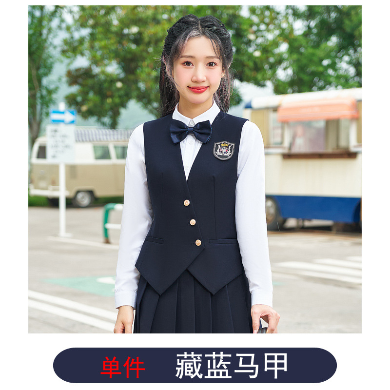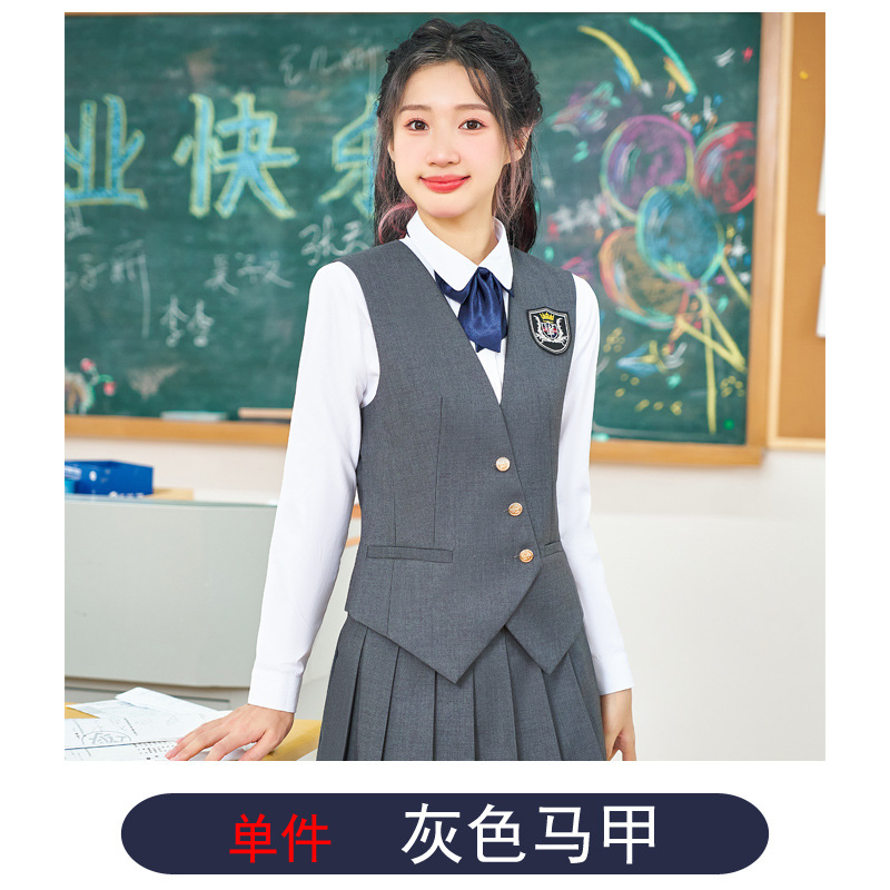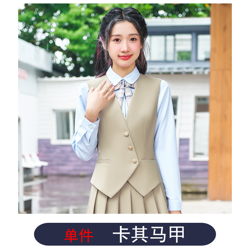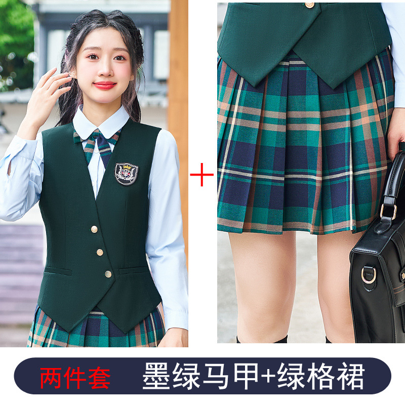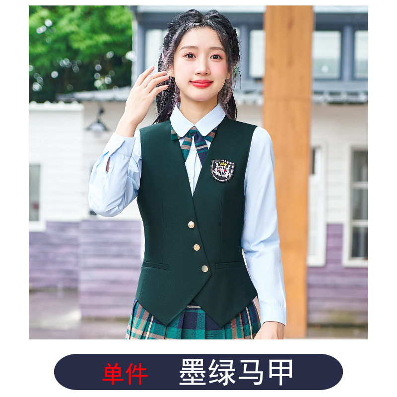 Цельный жилет темно-синего цвета; Одиночный серый жилет; Одинарный жилет цвета хаки; Один темно-зеленый жилет; Темно-синий жилет + темно-синяя юбка А01; Темно-синий жилет + темно-синяя юбка А03; Серый жилет + серая юбка А01; Серый жилет + серая юбка А03; Жилет хаки + юбка цвета хаки А03; Темно-зеленый жилет + зеленая клетчатая юбка А02.; Темно-зеленый жилет + зеленая юбка А03; Цельная белая рубашка 608.; Цельная синяя рубашка 608.