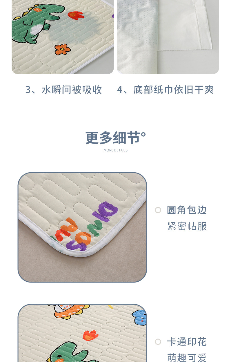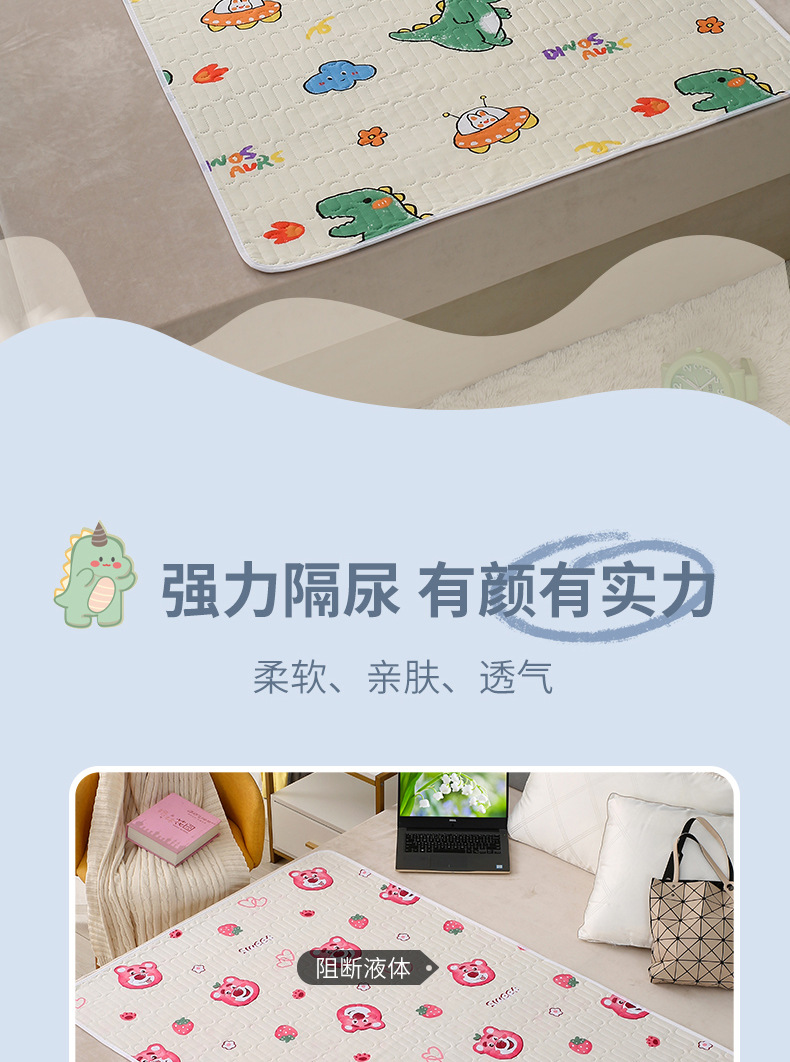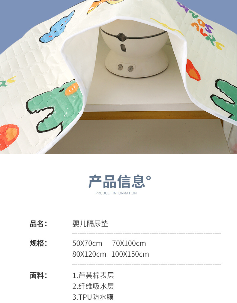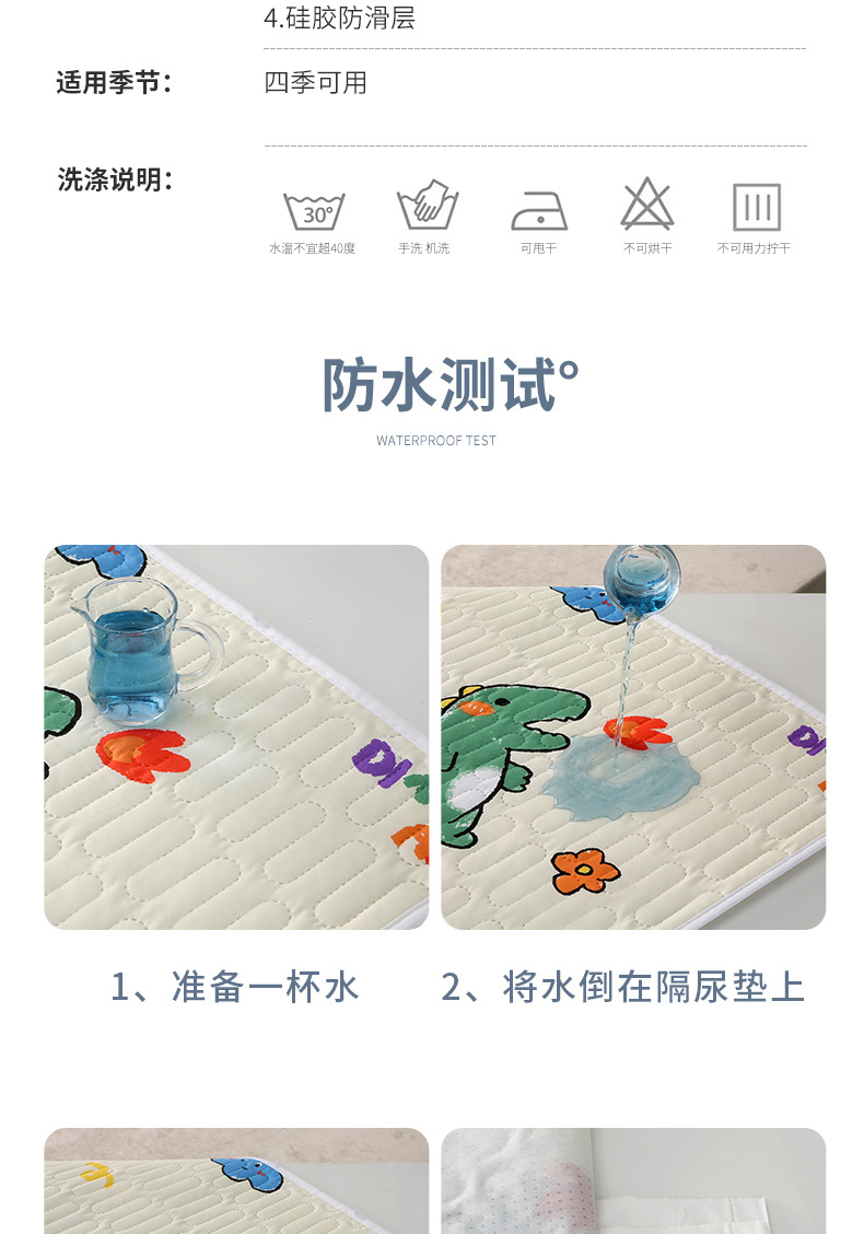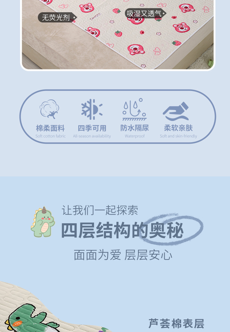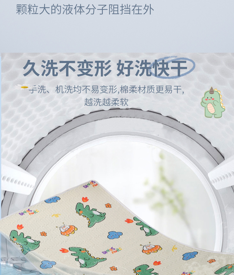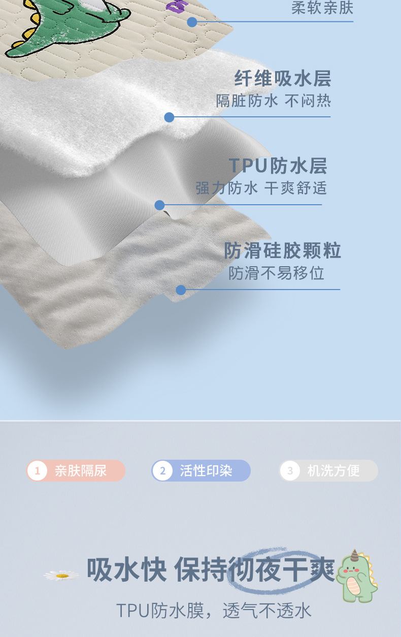 本产品是四层一体的,第一层亲肤水洗棉,2层透气洗水层,3层高端TPU防水层,四层防滑层。亲肤水洗棉是一种新型材质,不起球、不掉色、不缩水。布艺产品手工裁剪,尺寸都会有3-5厘米误差,介意的亲追求完美的亲慎拍,毕竟只是隔尿垫不是床品。收到货第一时间检查没有问题了,满意了再去清洗使用,有问题一定要第一时间联系客沟通,七天无理由退货,使用完了清洗了再有问题不退不换,毕竟是贴身用品,介意的亲慎拍,特此声明!