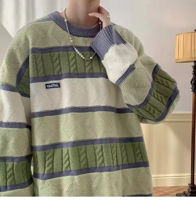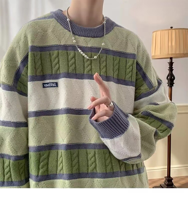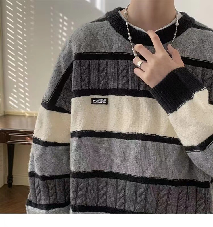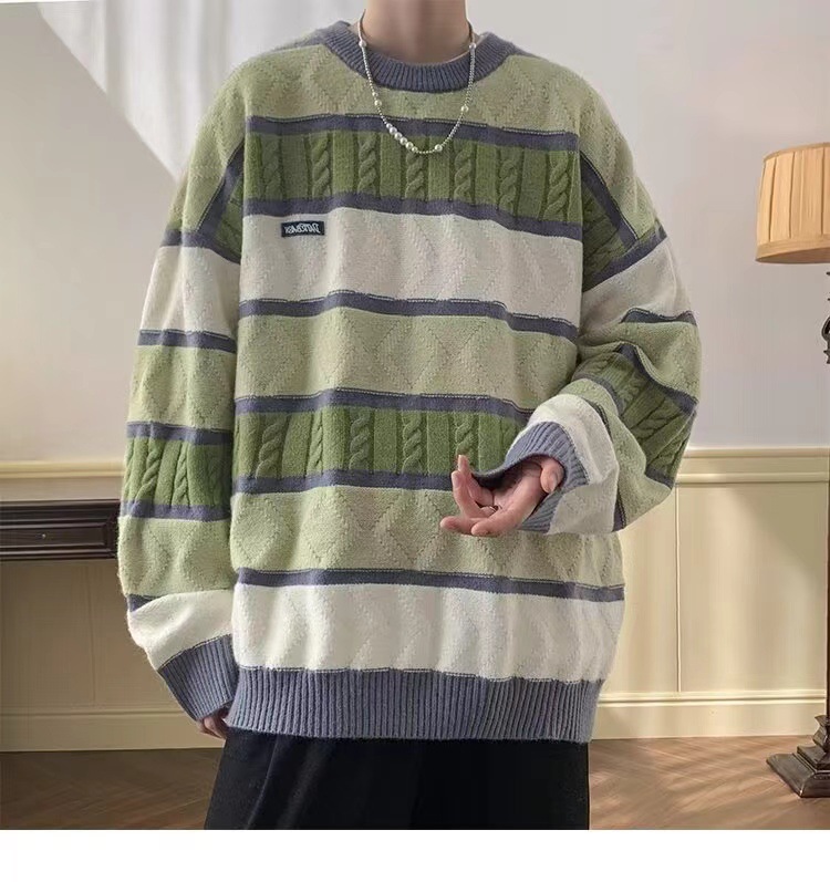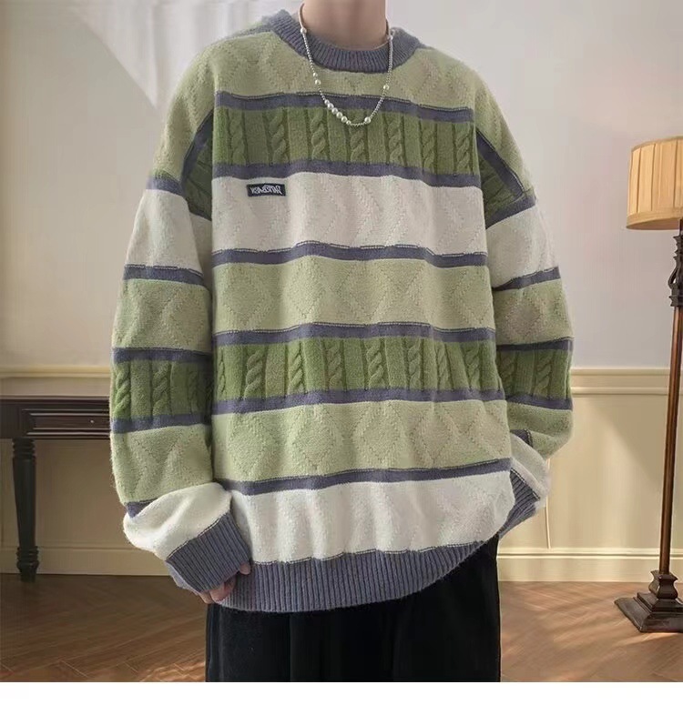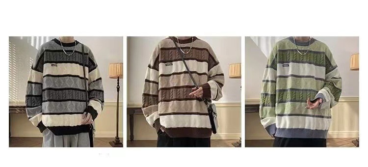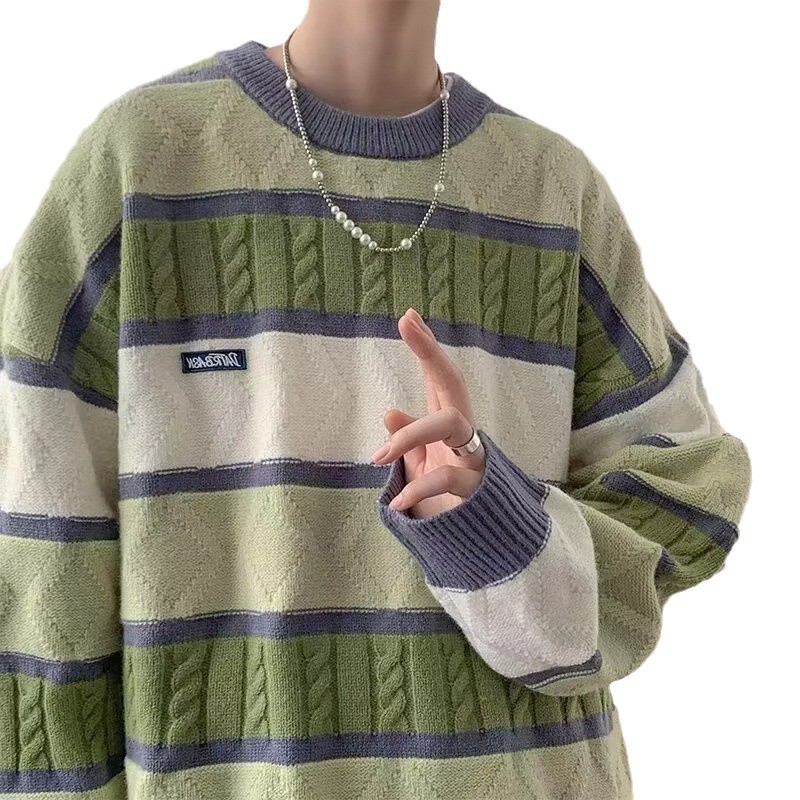 Осенний и зимний толстый свитер мужской корейский тренд свободный полосатый трикотаж зимний дикий гонконгский стиль ленивый свитер