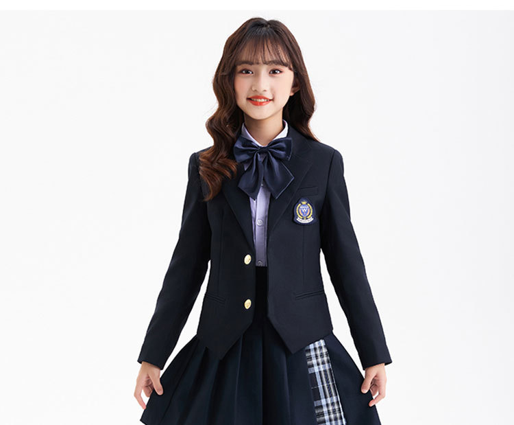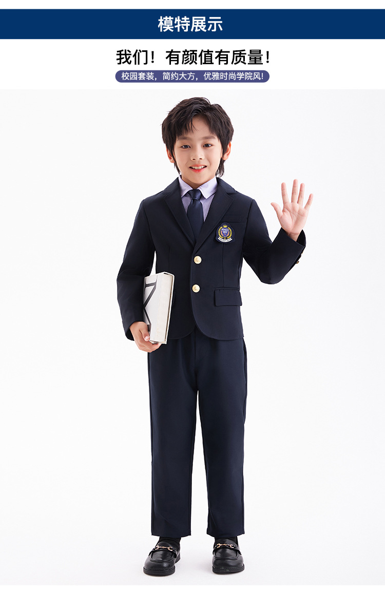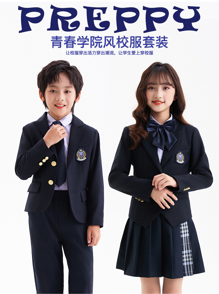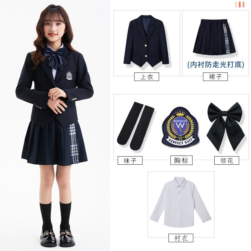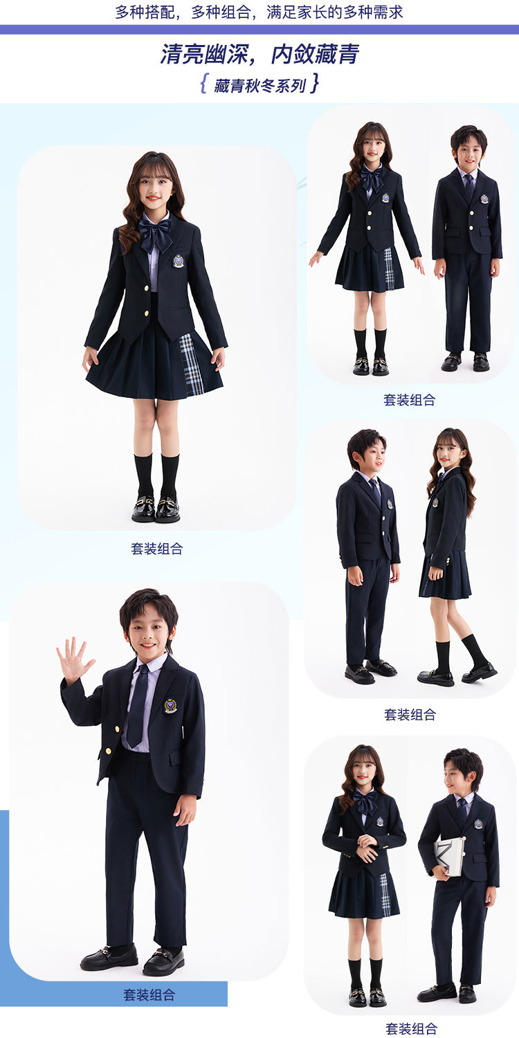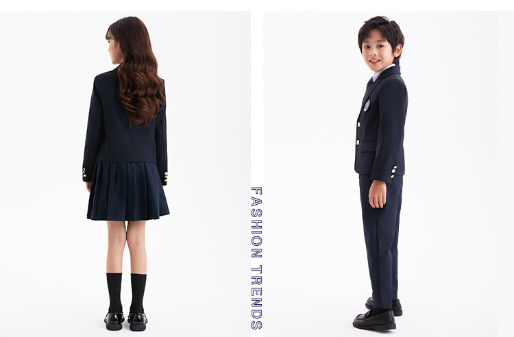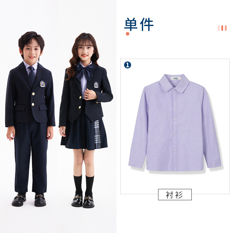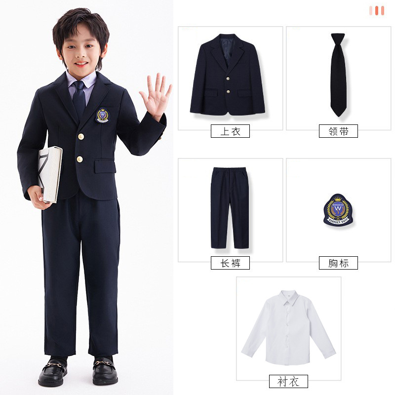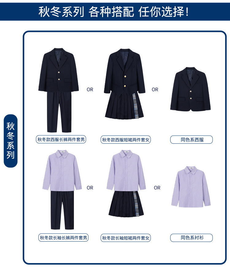 Комплект из четырех предметов для мальчика; Комплект из пяти предметов для девочек; куртка для мальчиков; брюки; пальто для девочек; юбка; фиолетовая рубашка; Темно-синий жилет; Серый жилет; Комплект из пяти предметов для мальчика; Комплект из шести предметов для девочек.