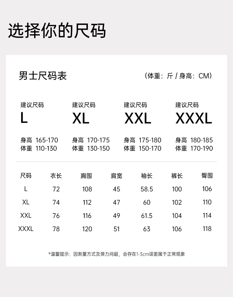 L【 55-65kg 】; XL【 65-75kg 】; XXL【 75-85kg 】; XXXL【170-190】