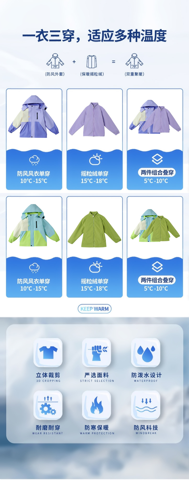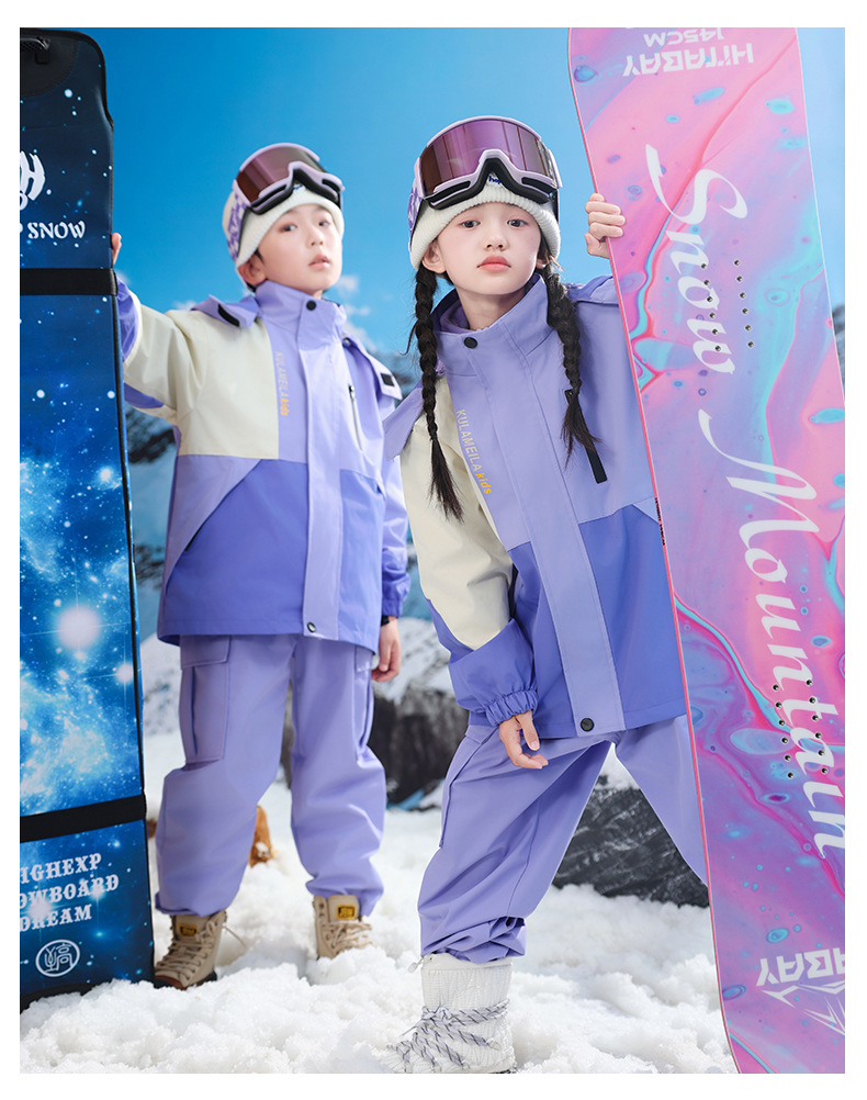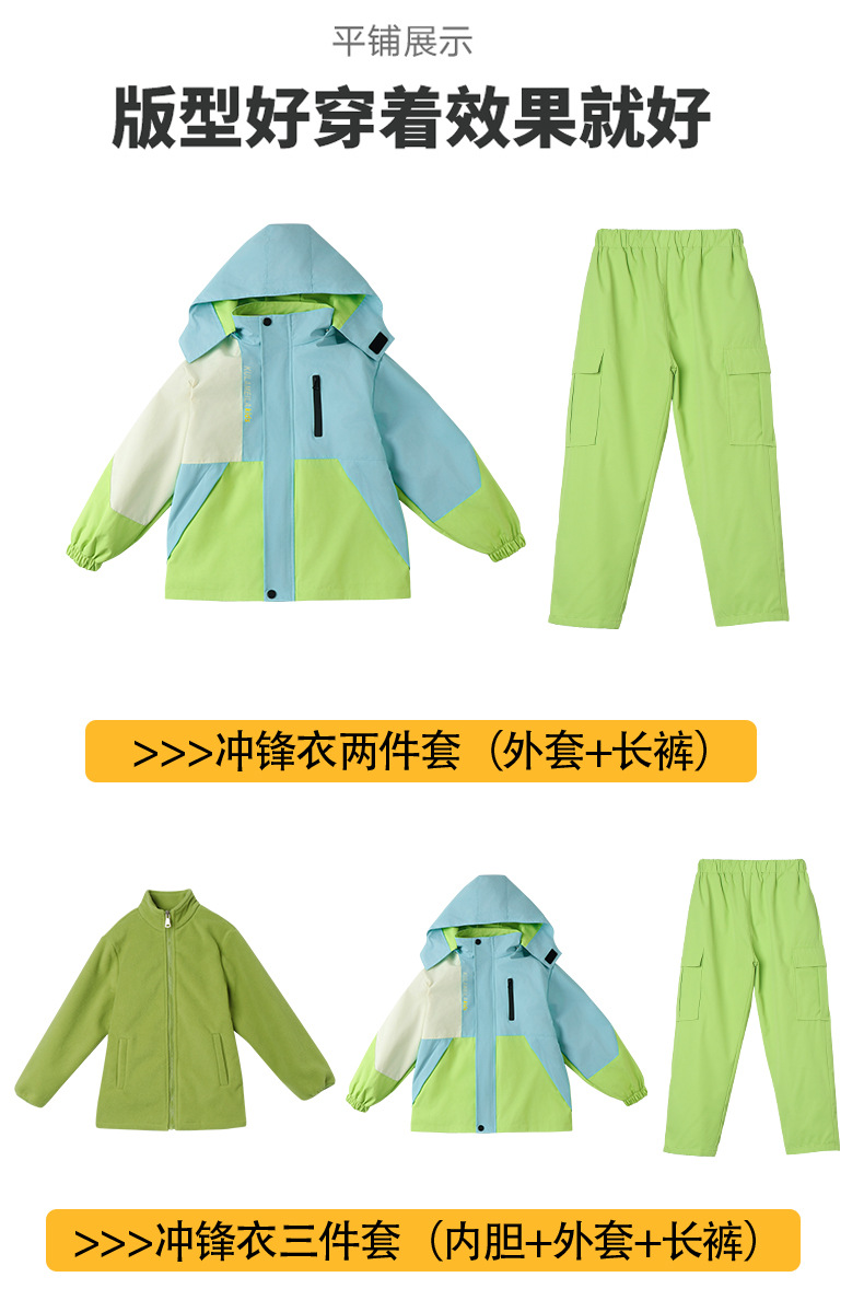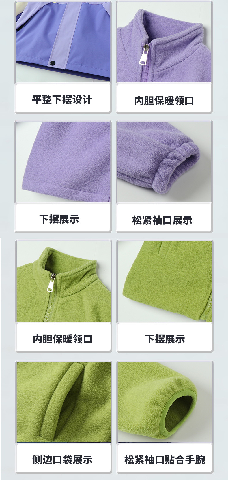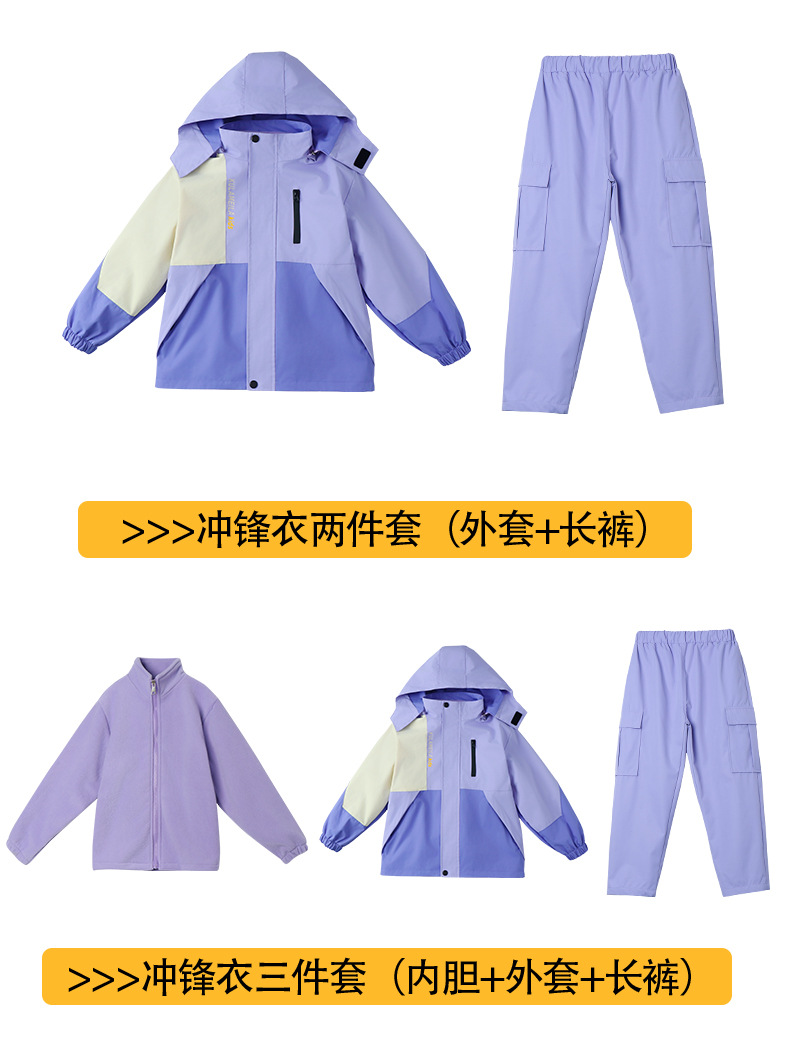 Фиолетовый набор из трех предметов; Фиолетовая подкладка куртки; Фиолетовые брюки-пальто; Фиолетовая одинарная куртка; Зеленый набор из трех предметов; Подкладка зеленой куртки; зеленые пальто брюки; Зеленая одинарная куртка; Фиолетовый вкладыш; Зеленый вкладыш; фиолетовые брюки; зеленые брюки