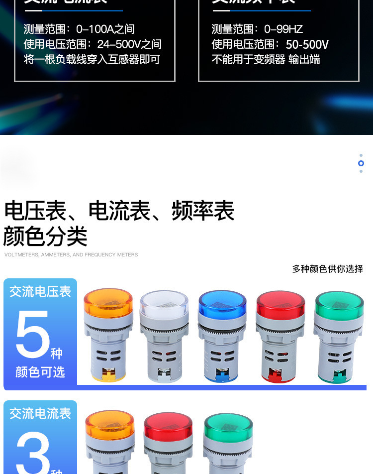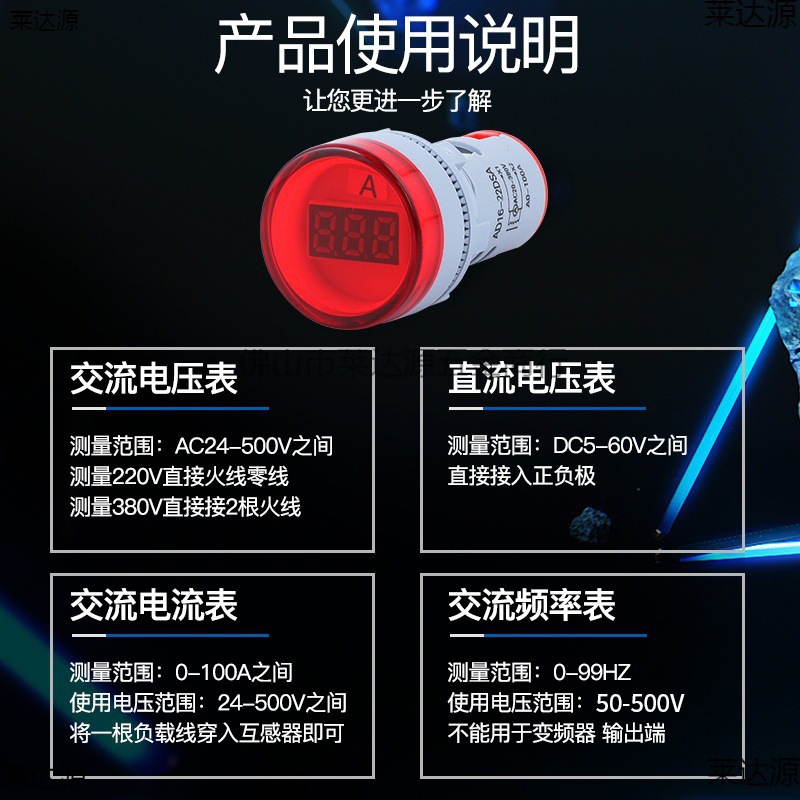 Вольтметр переменного тока 60-500 В; Амперметр переменного тока 0-100А; Часы Hertz 0-75 Гц; Двойной цифровой дисплей, отображение напряжения + отображение тока; термометр; Текущее напряжение Герцовый измеритель с тремя дисплеями; Модернизированный вольтметр 60-500 В; Модернизированный амперметр 0-100А