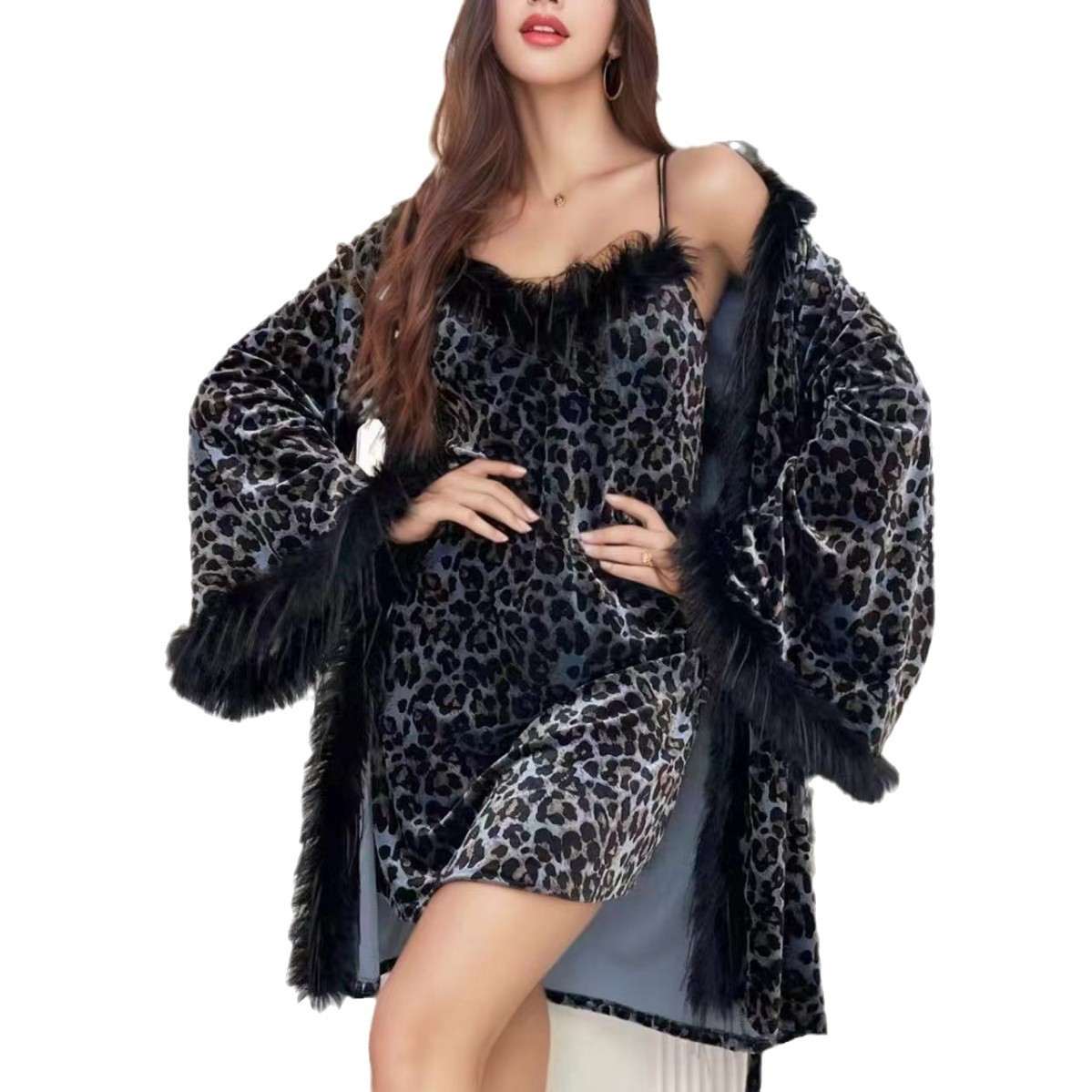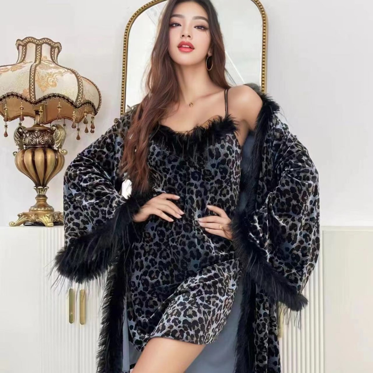 [По индивидуальному заказу] Домашняя одежда, трансграничная европейская и американская ночная рубашка с леопардовым принтом и ночная рубашка, комплект из двух предметов, золотые бархатные сексуальные пижамы на подтяжках для женщин