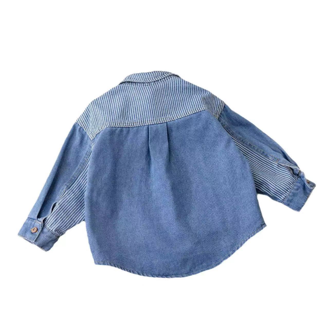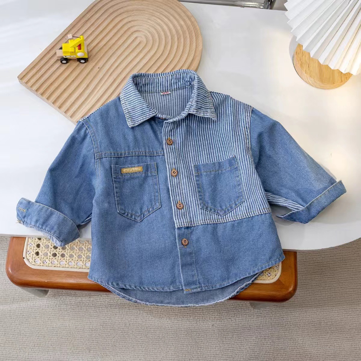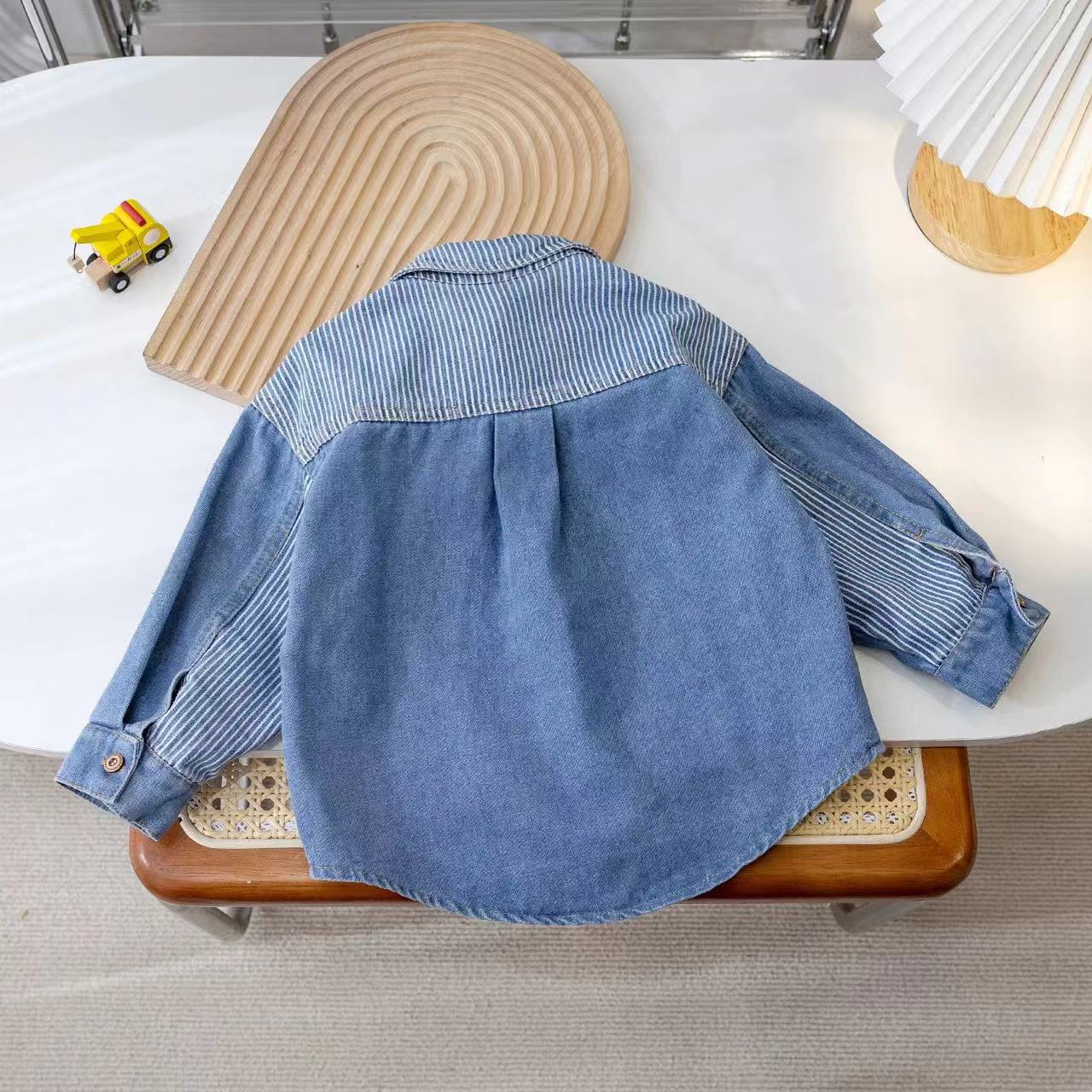 Новая коллекция 2025: Модная детская джинсовая рубашка-куртка для мальчиков в полоску и цветовых блоках, тонкая, на весну-осень