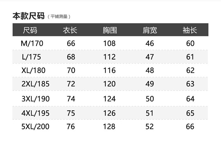 M/170; L/175; XL/180; 2XL/185; 3XL/190; 4XL/195; 5XL/200