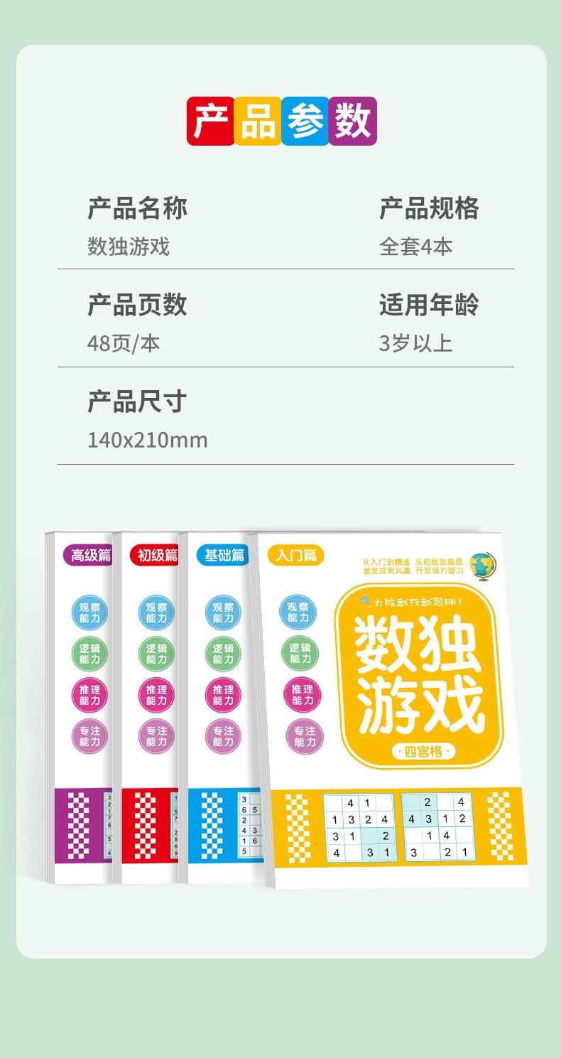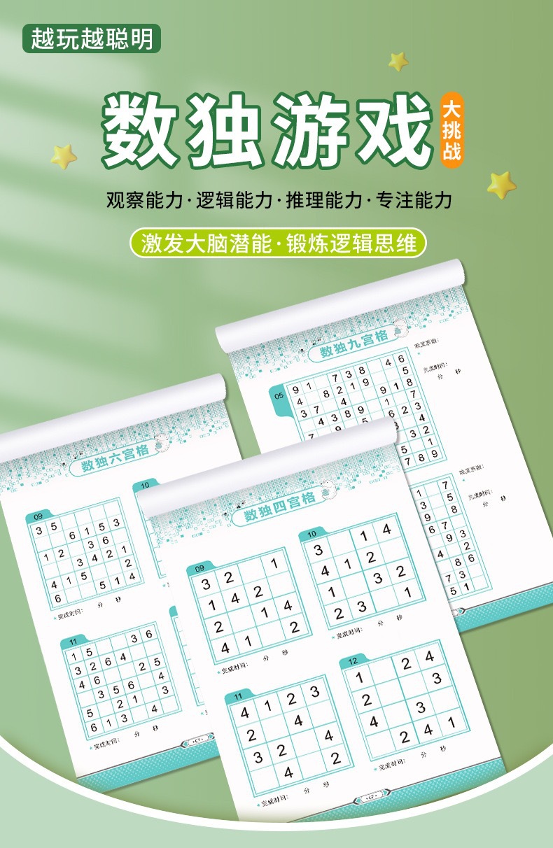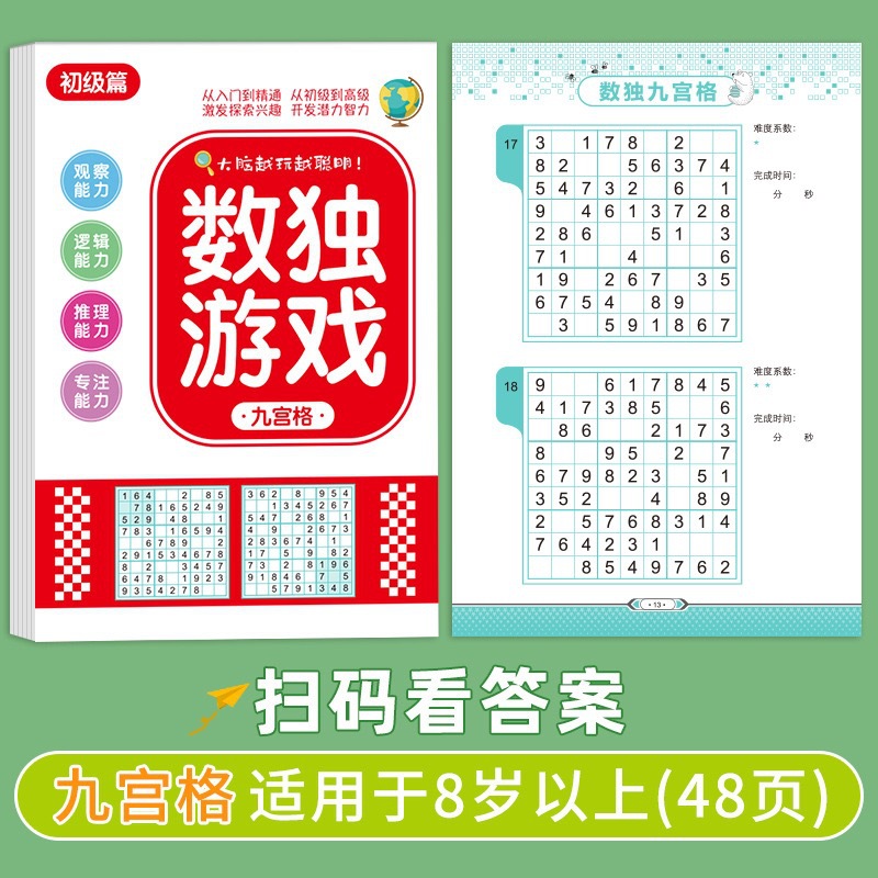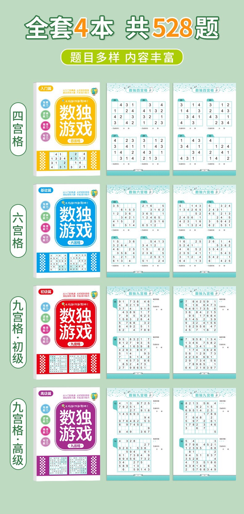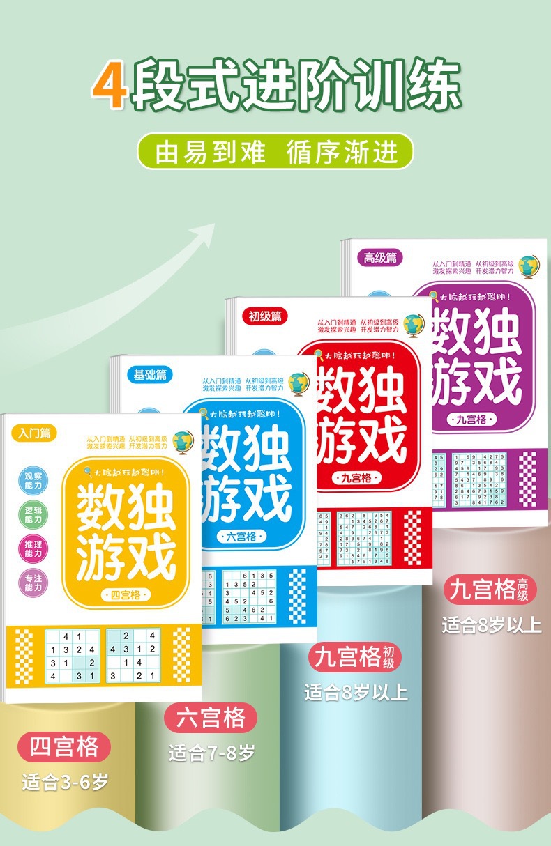 [Доход] Четырехквадратная сетка подходит для детей 3-6 лет (48 страниц).; [Основы] Шестиквадратная сетка подходит для детей 7-8 лет (48 страниц).; [Элементарная глава] Jiugongge подходит для детей от 8 лет (48 страниц).; [Усовершенствованная глава] Jiugongge подходит для детей от 8 лет (48 страниц).