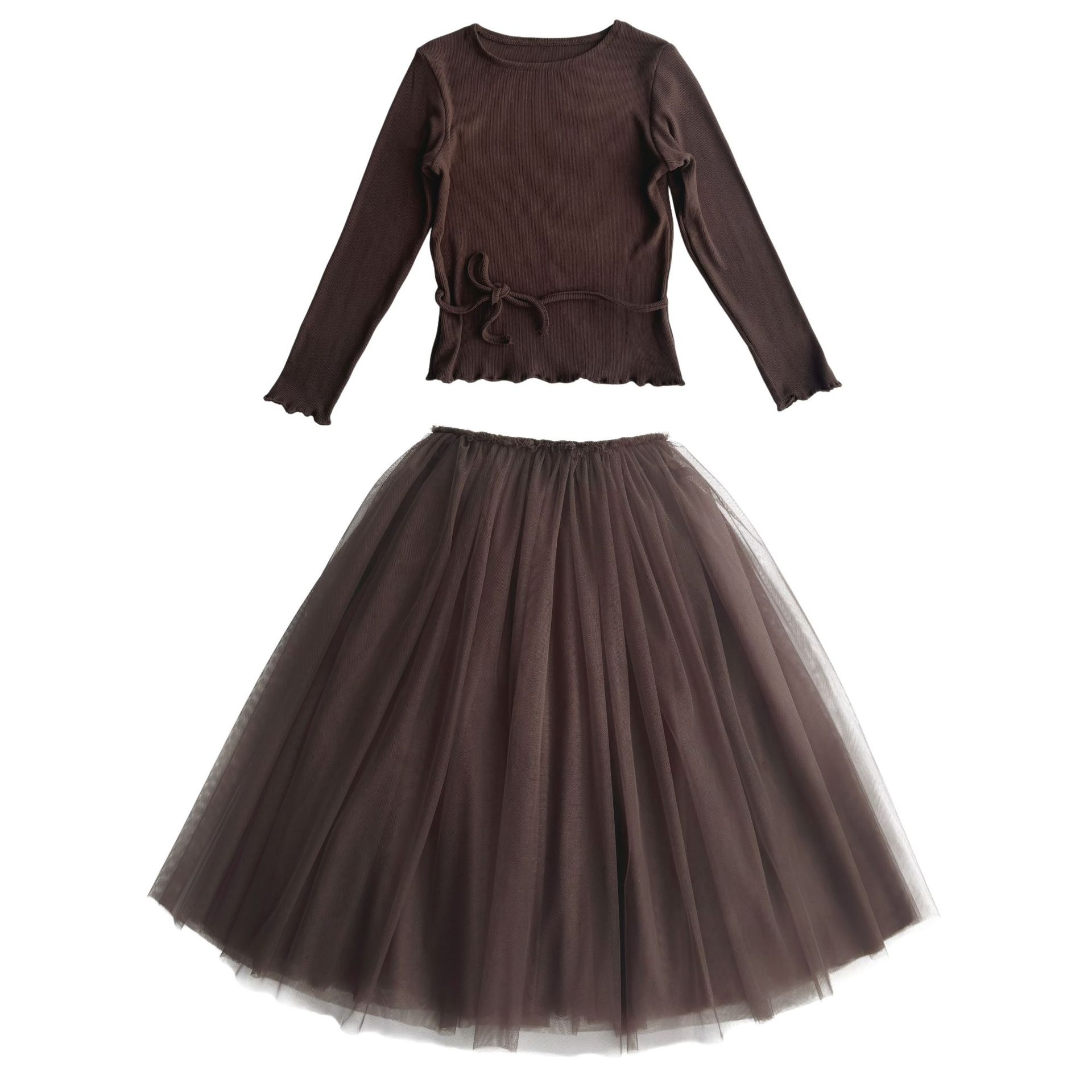 Кремово-белый топ; Светло-розовый топ; Топ цвета чая с молоком; Коричневый топ какао; Ангорский красный топ; темно-серый верх; Кремово-белая юбка; Светло-розовая юбка; Юбка цвета чая с молоком; Коричневая юбка какао; Юбка перламутрового серого цвета; Классическая черная юбка