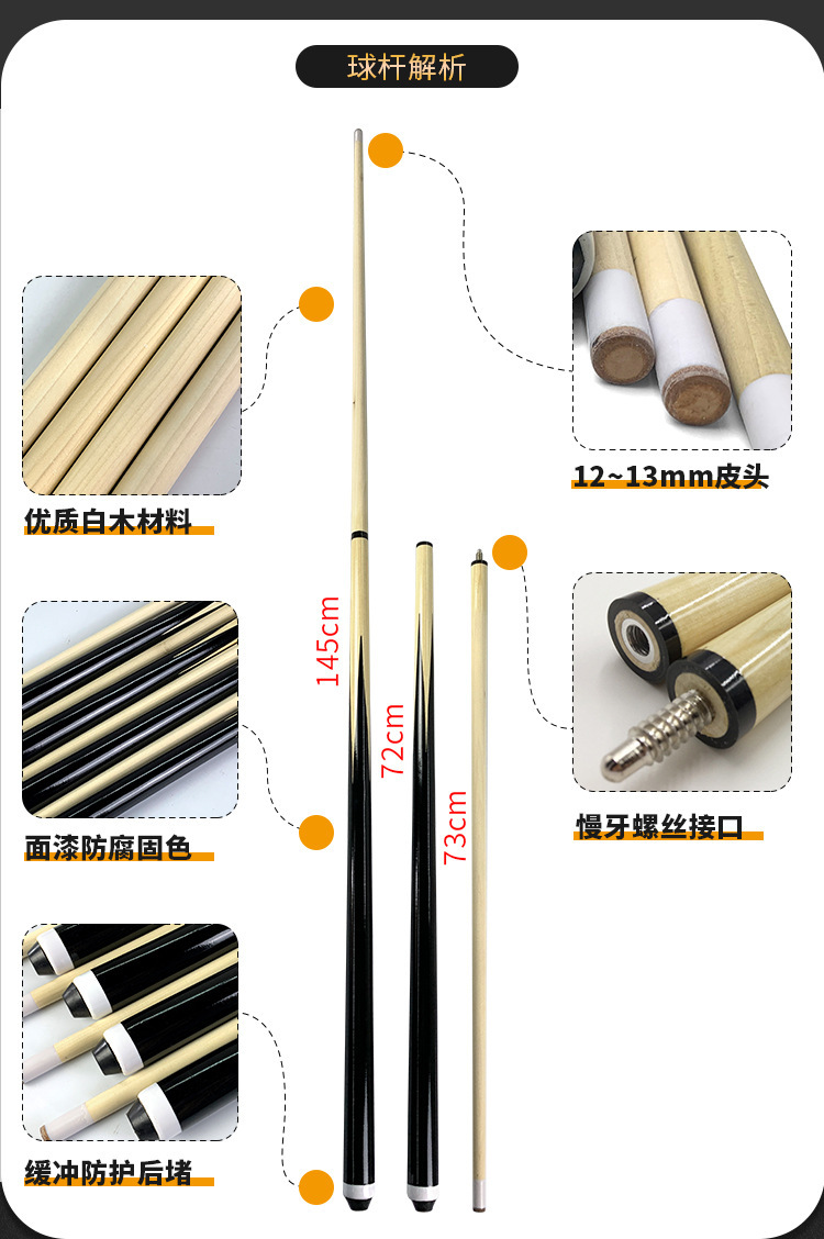 Бильярдный кий из двух частей, 120-145 см, с большим наконечником 12 мм, для взрослых и детей, для игры в 8-бол и 9-бол, черный, двухсекционный, 1/2.