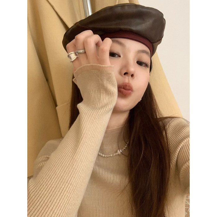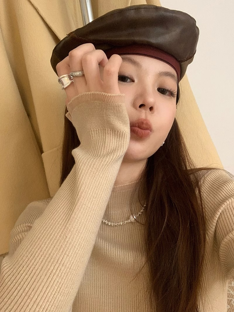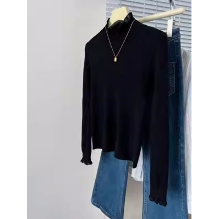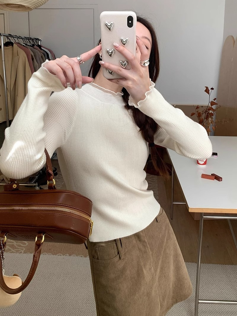 Белый деревянный ухо с полувысоким воротником с воротником внутри нижней рубашки женский осенний и зимний узкий свитер с длинными рукавами трикотажный топ