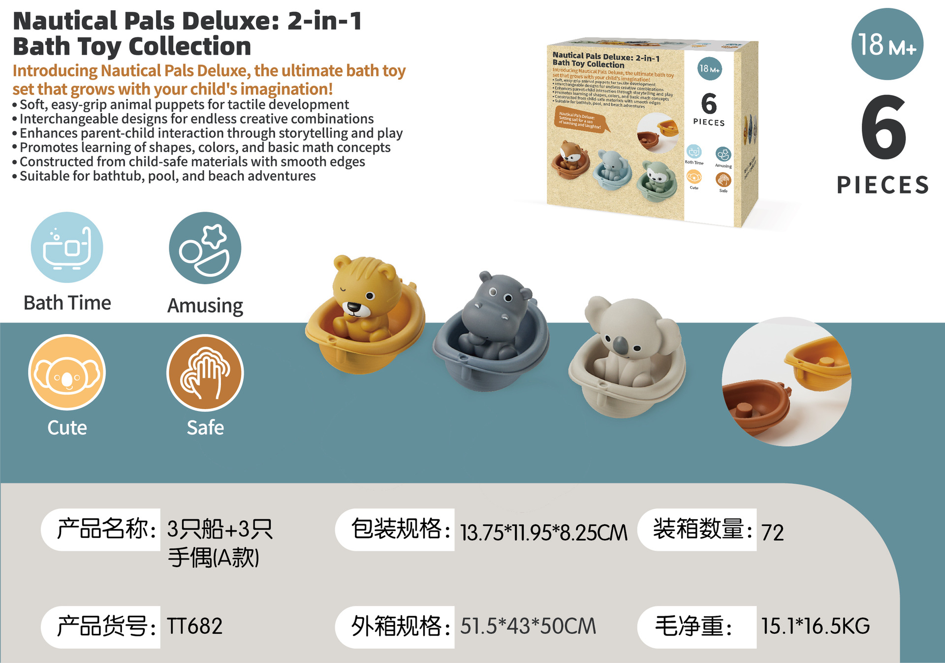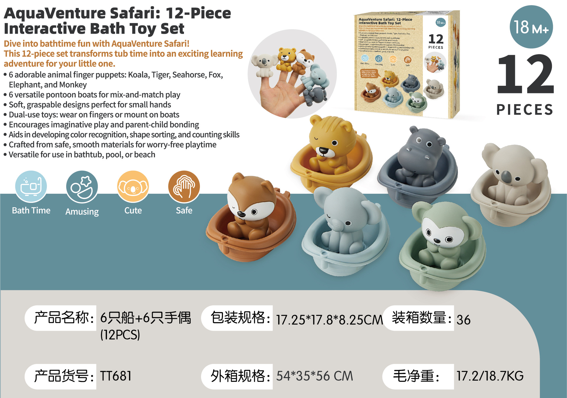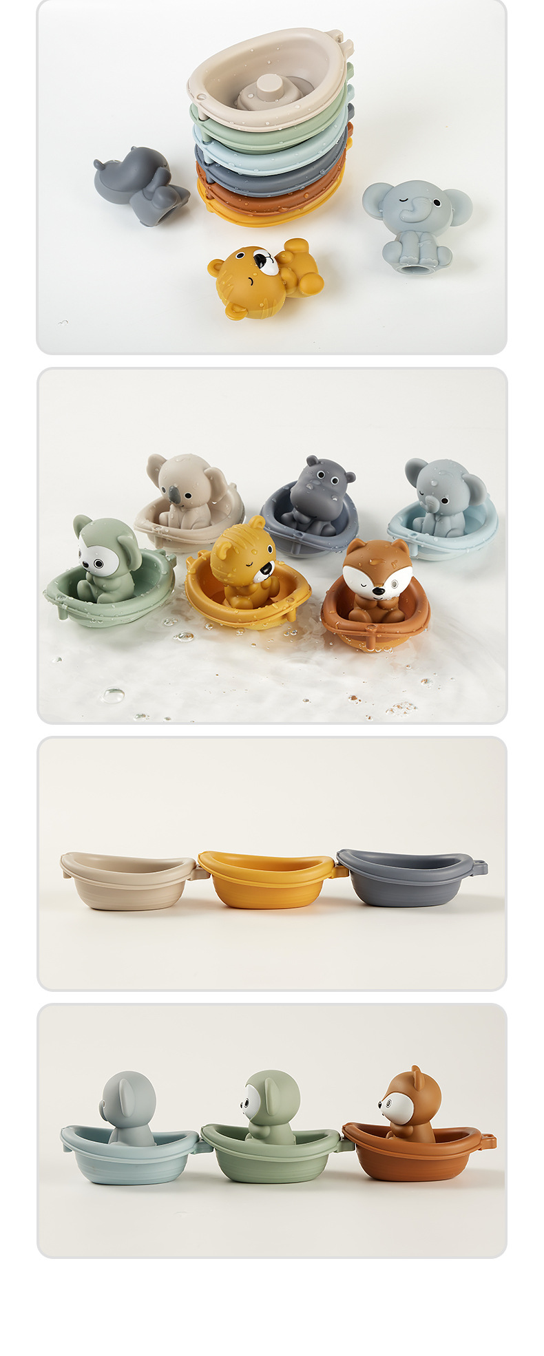 6 лодок (можно штабелировать и подключать); 6 щенков для рук животных; 3 лодки + 3 щенки для рук животных (слон + обезьяна + лиса); 3 лодки + 3 щенки для рук животных (коала + хиппоотamus + тигр); 6 лодок + 6 щенков с животными; Рекламная страница