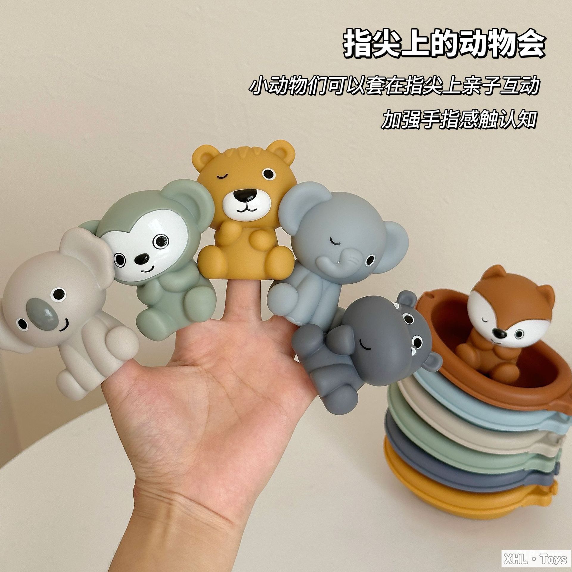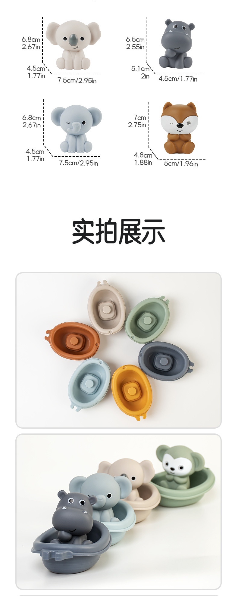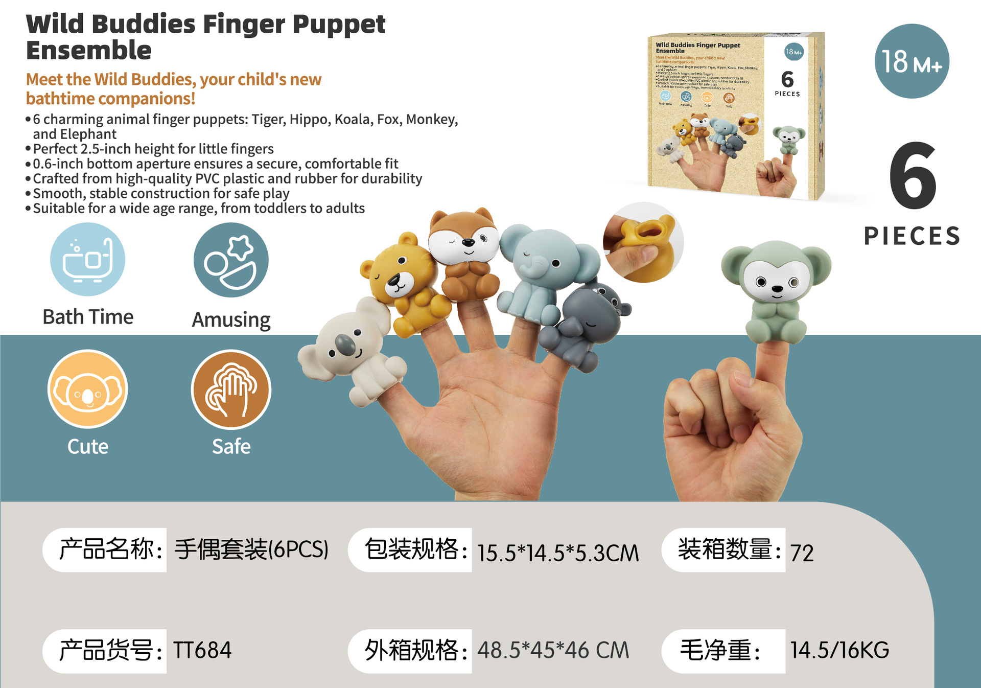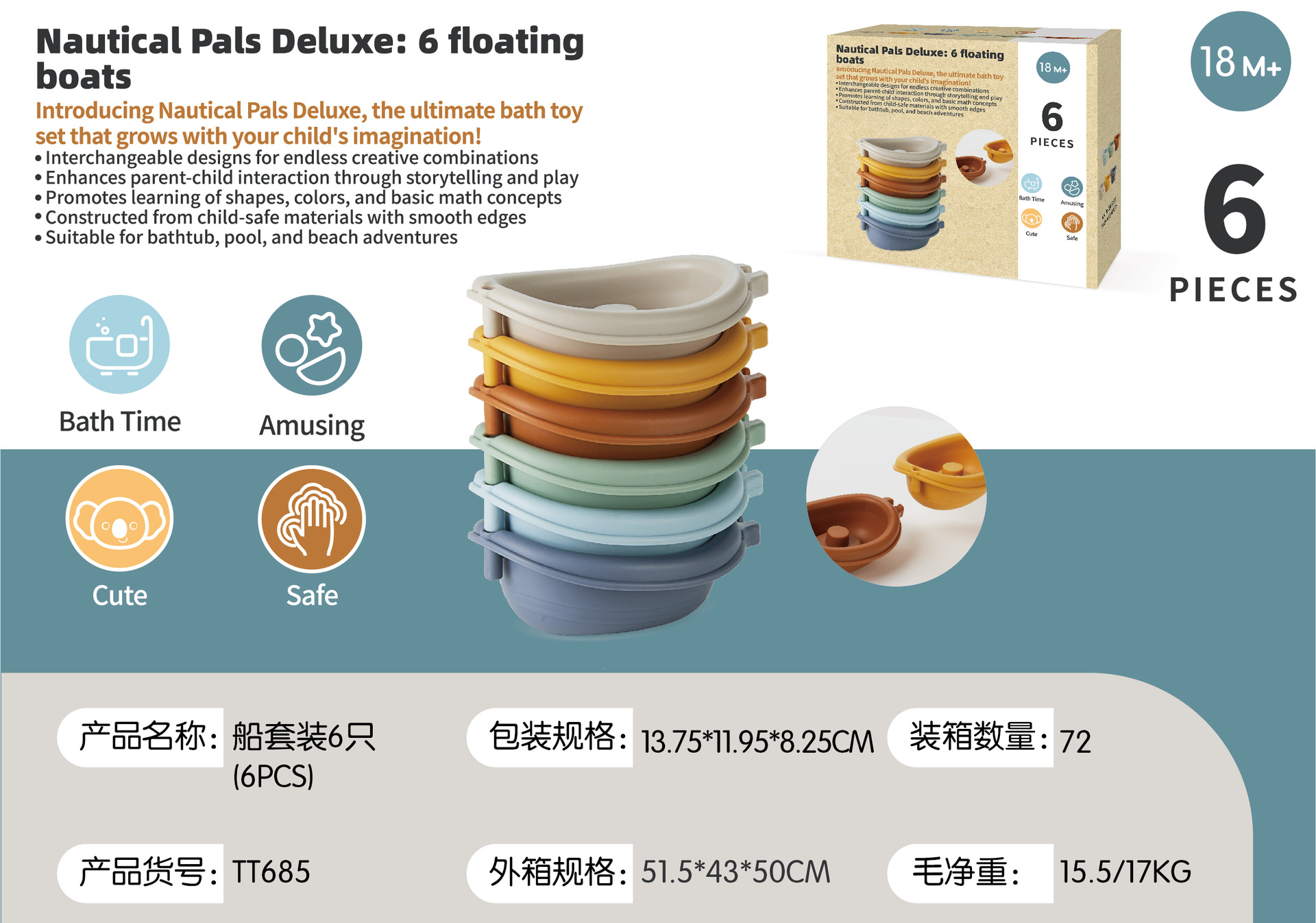 6 лодок (можно штабелировать и подключать); 6 щенков для рук животных; 3 лодки + 3 щенки для рук животных (слон + обезьяна + лиса); 3 лодки + 3 щенки для рук животных (коала + хиппоотamus + тигр); 6 лодок + 6 щенков с животными; Рекламная страница