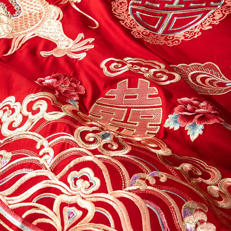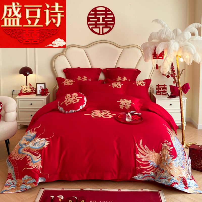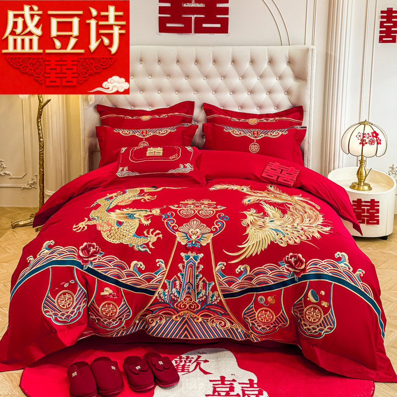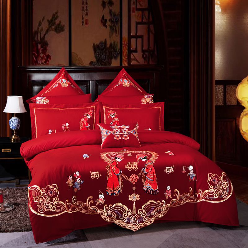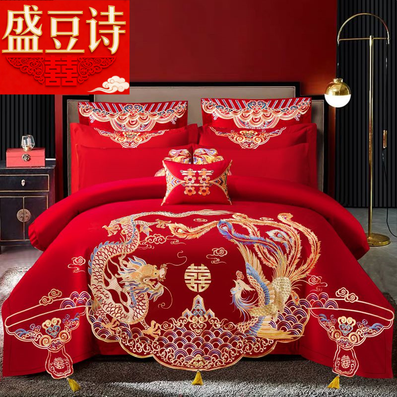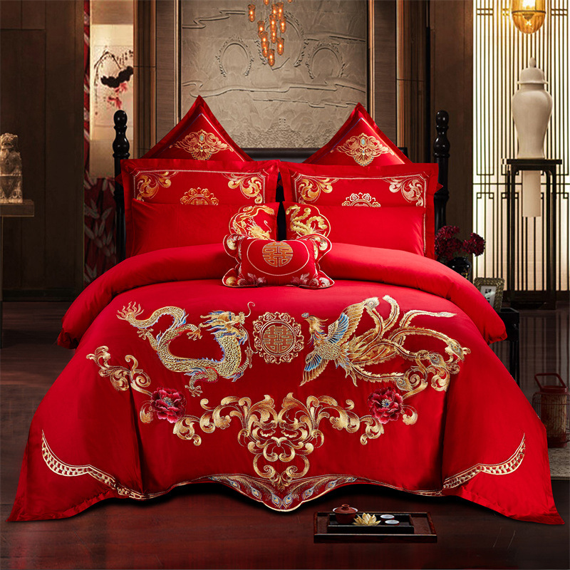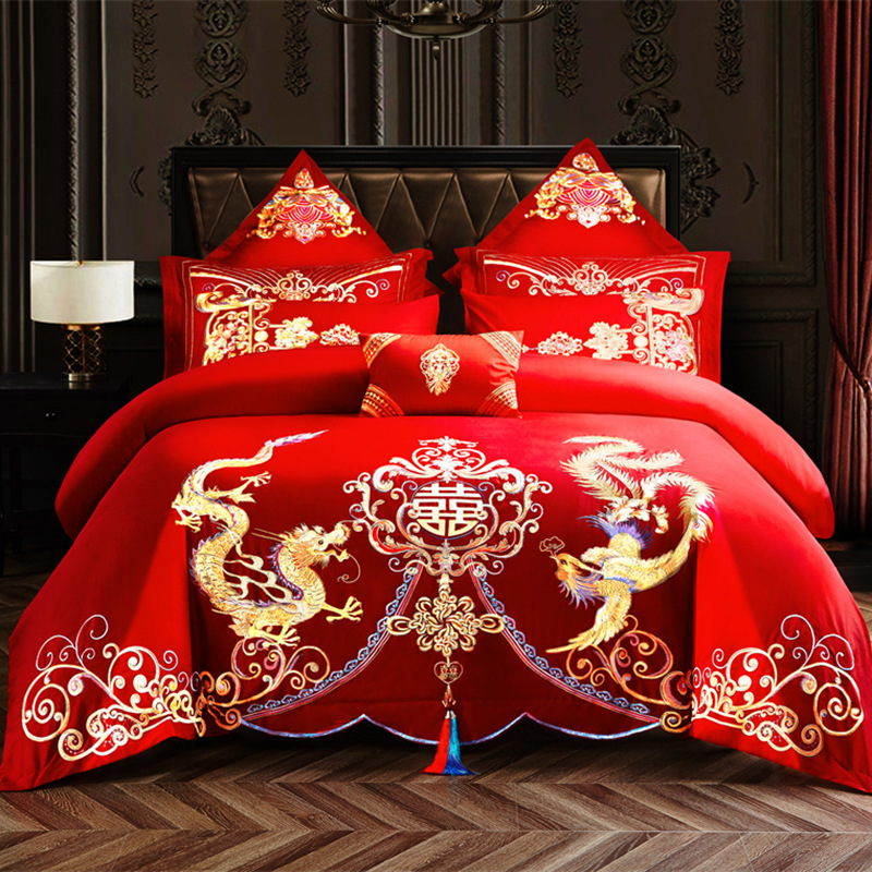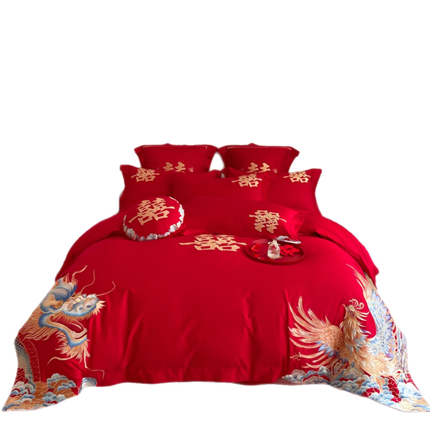 Китайский свадебный комплект из четырех предметов, красное вышитое свадебное одеяло для спальни, вышитый свадебный пододеяльник, комплект постельного белья из шести предметов