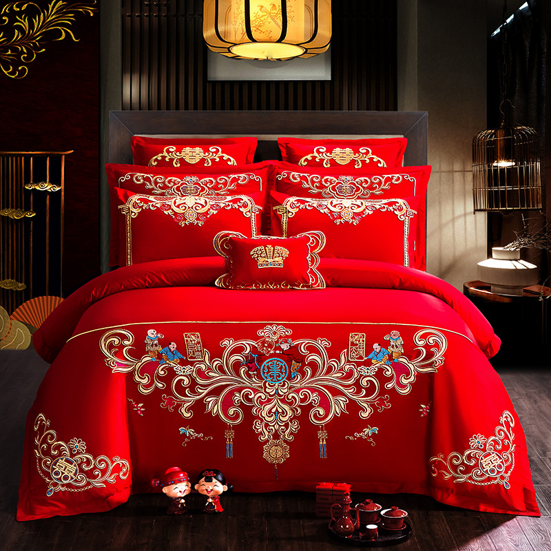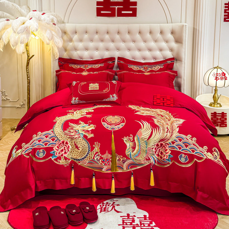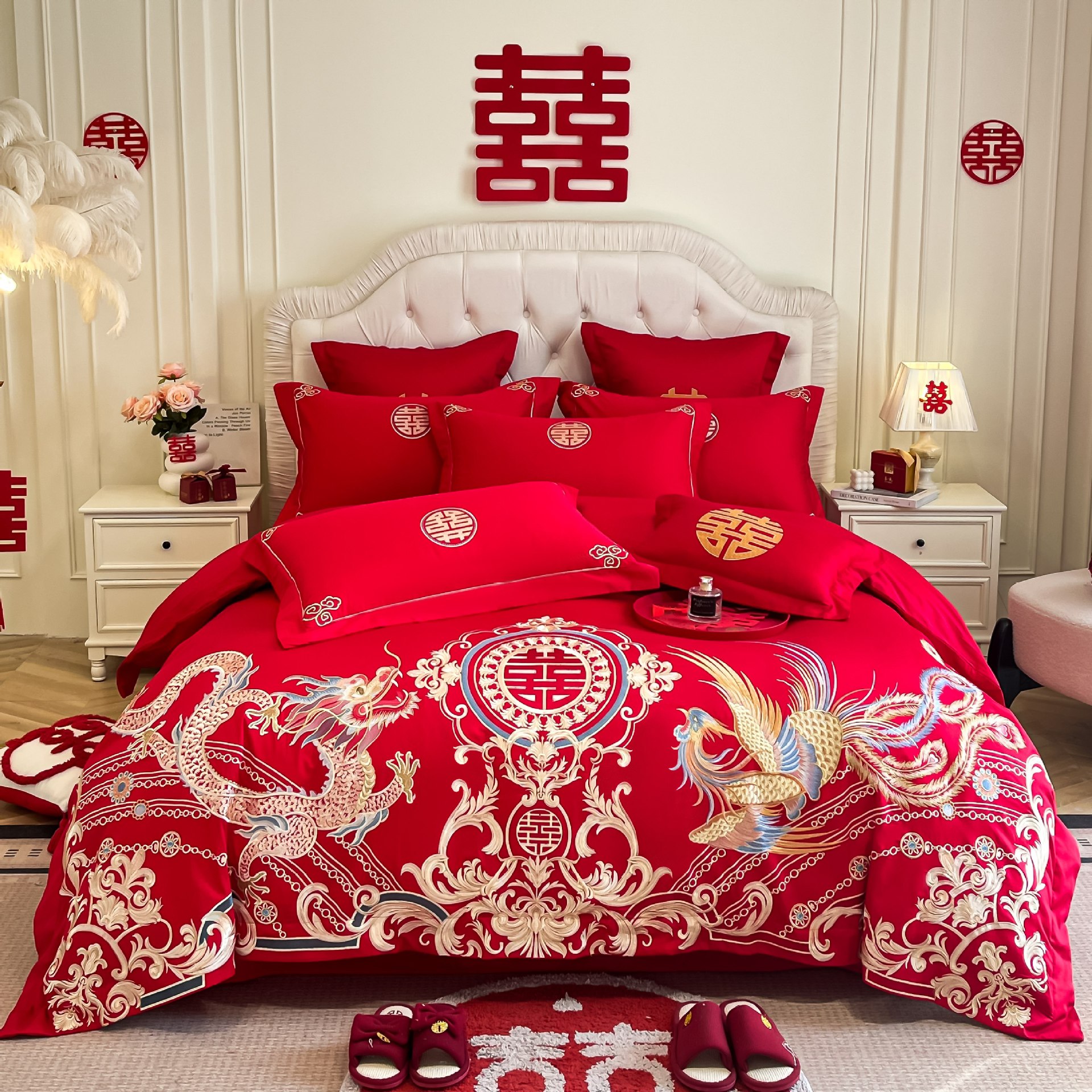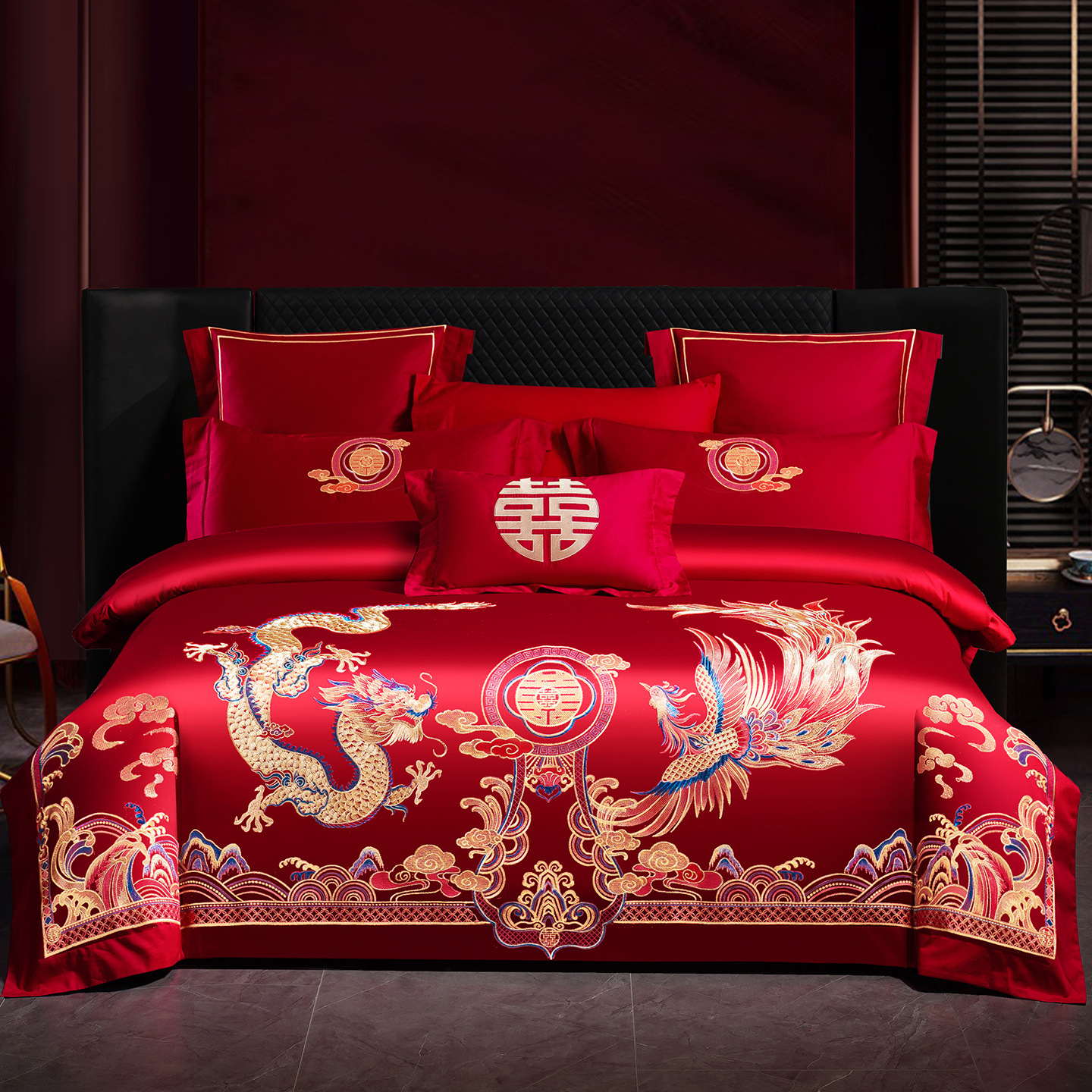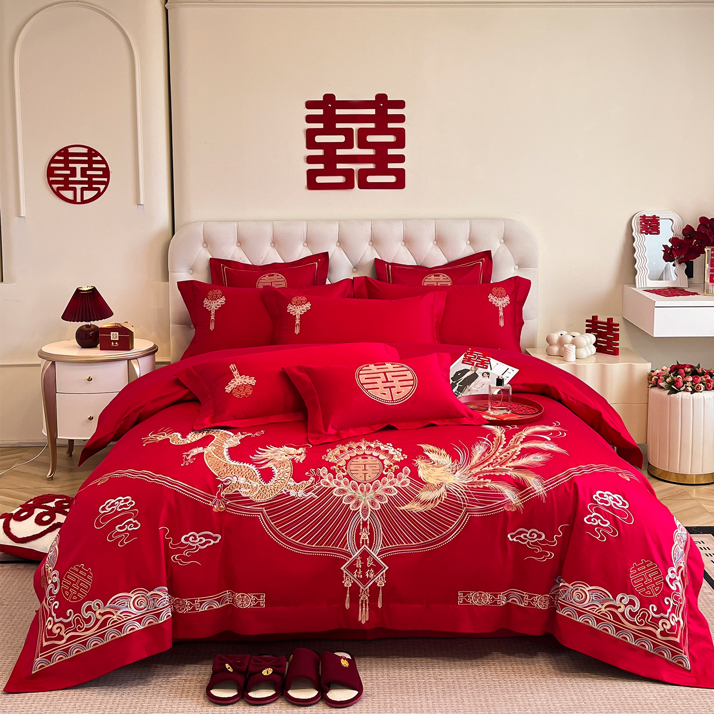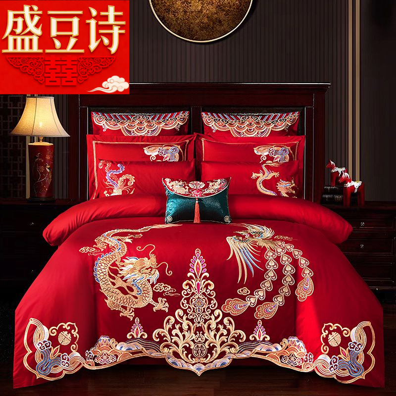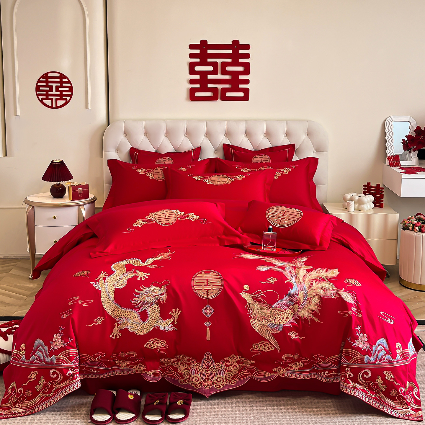 Китайский свадебный комплект из четырех предметов, красное вышитое свадебное одеяло для спальни, вышитый свадебный пододеяльник, комплект постельного белья из шести предметов