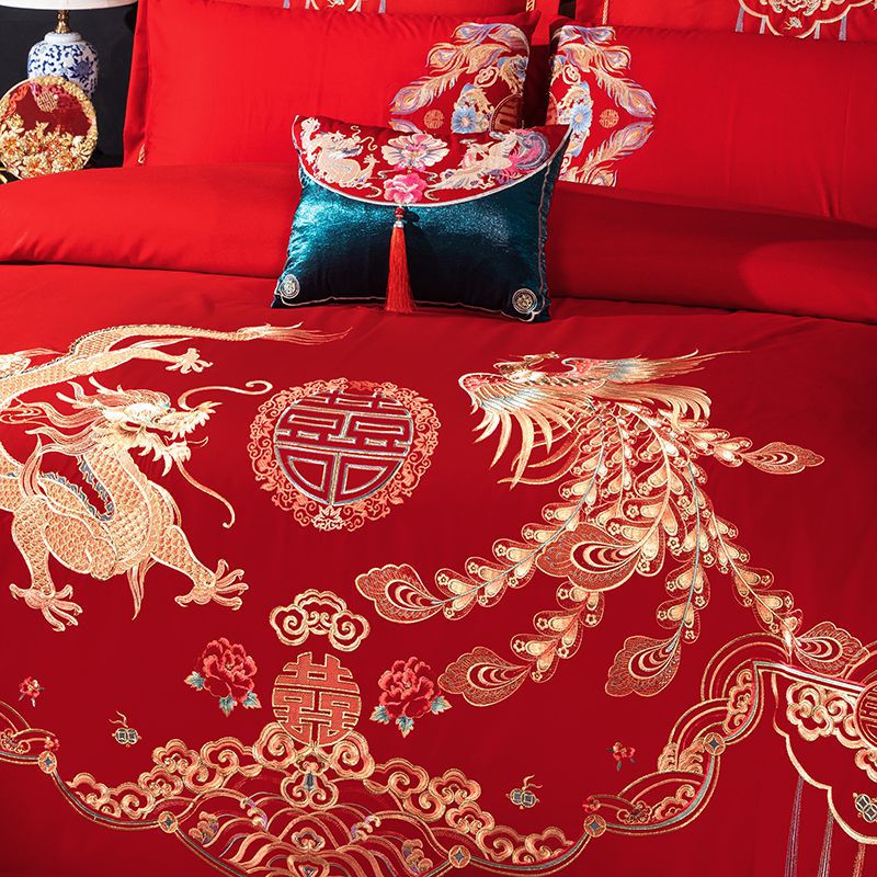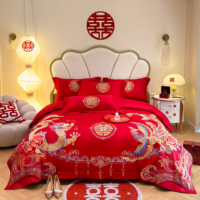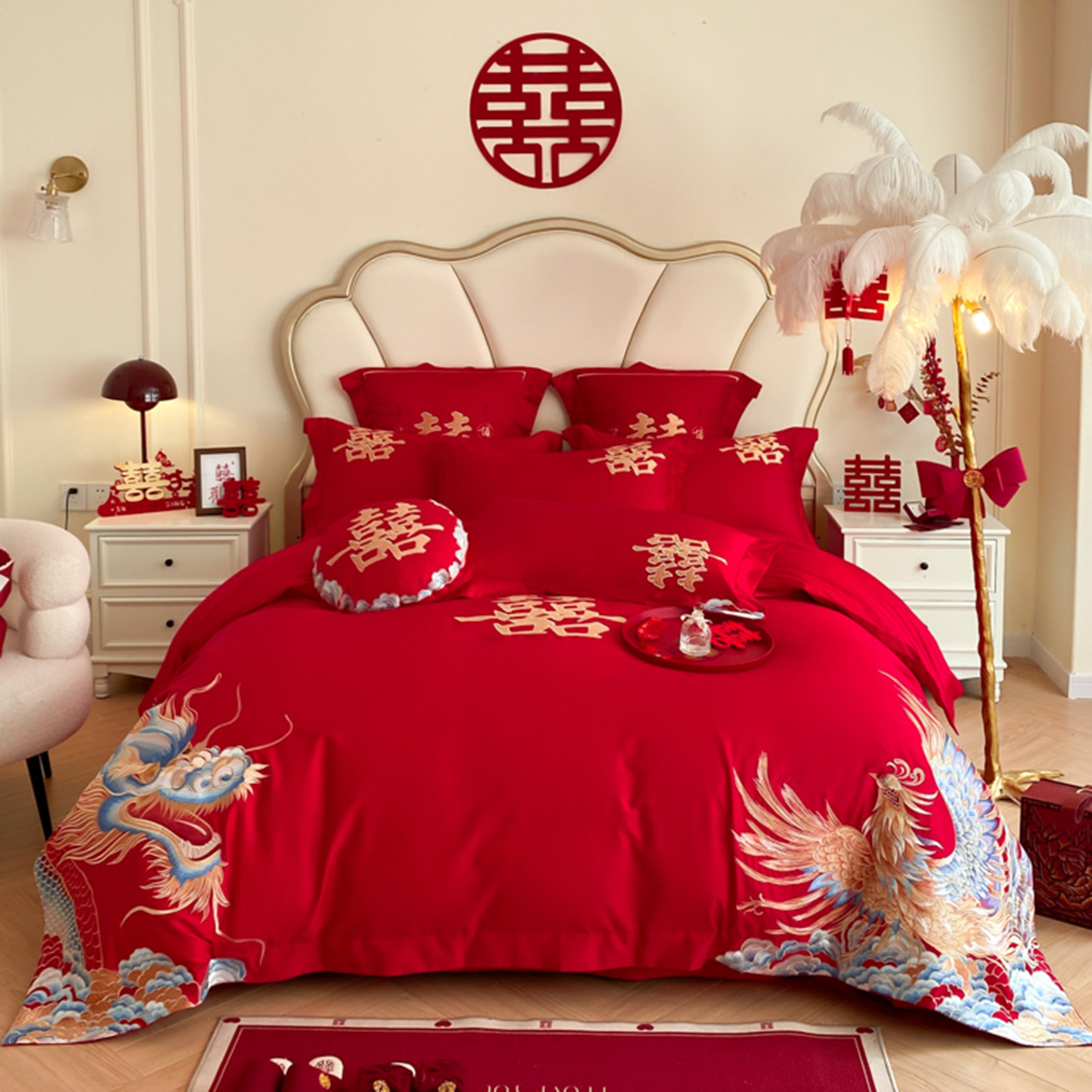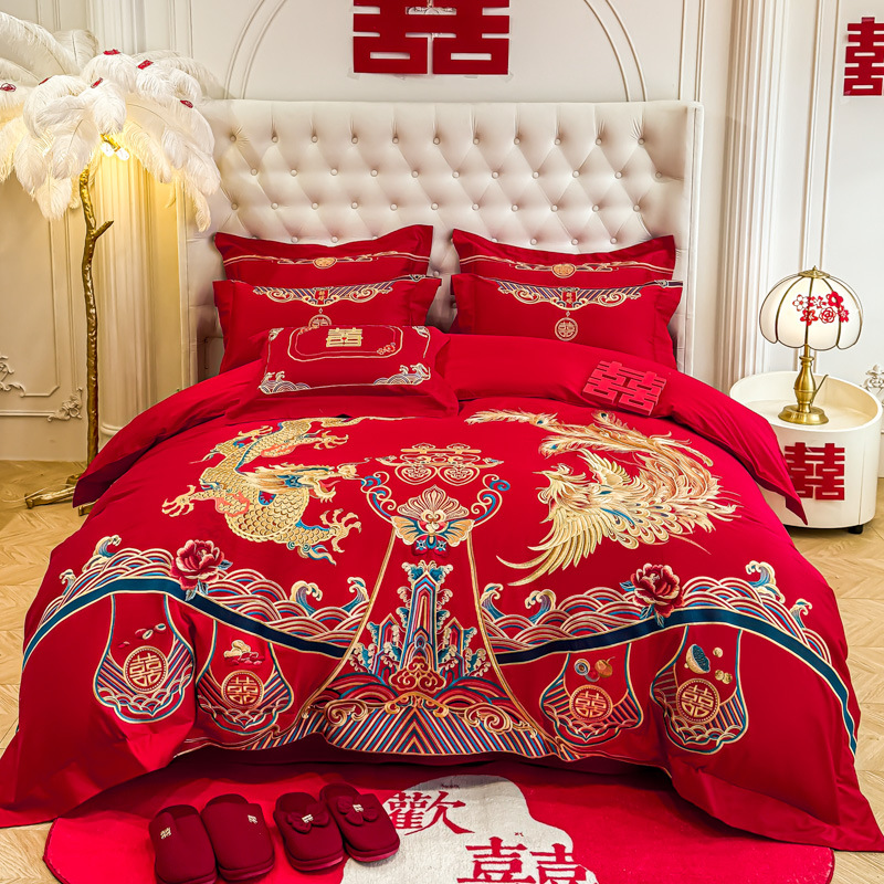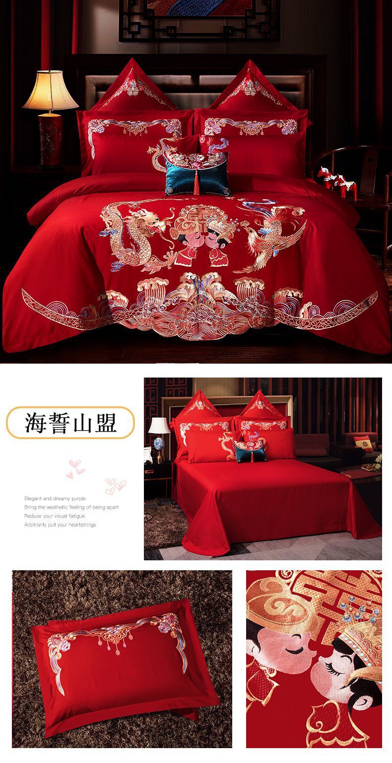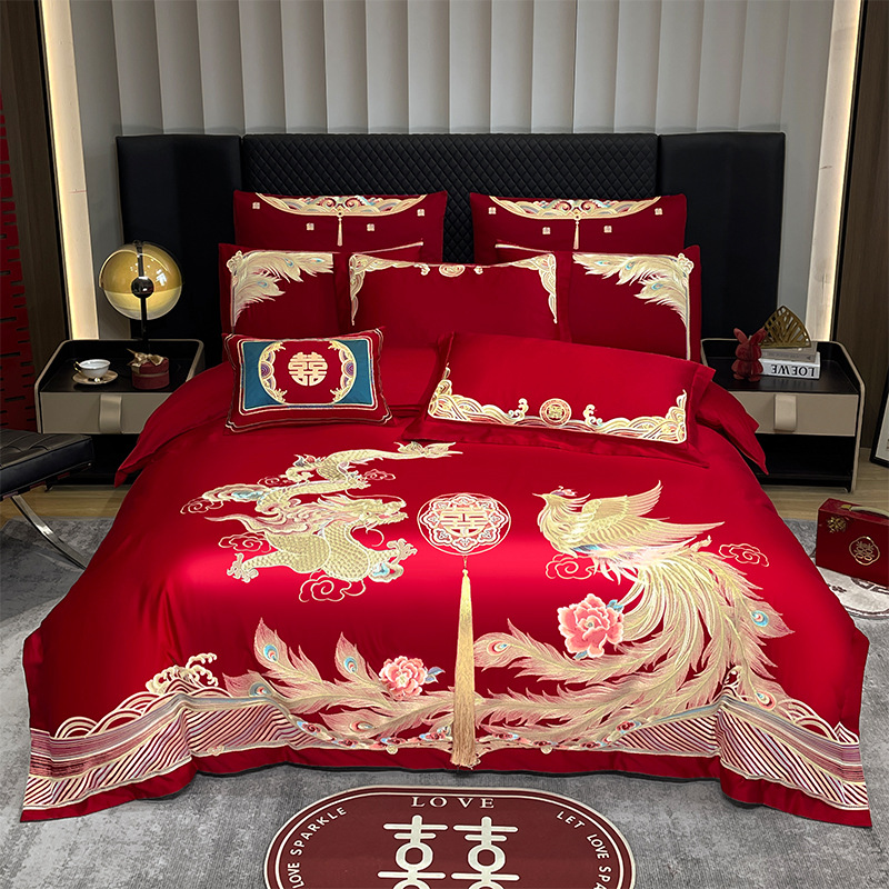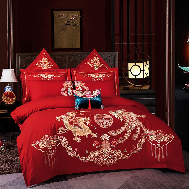 Китайский свадебный комплект из четырех предметов, красное вышитое свадебное одеяло для спальни, вышитый свадебный пододеяльник, комплект постельного белья из шести предметов