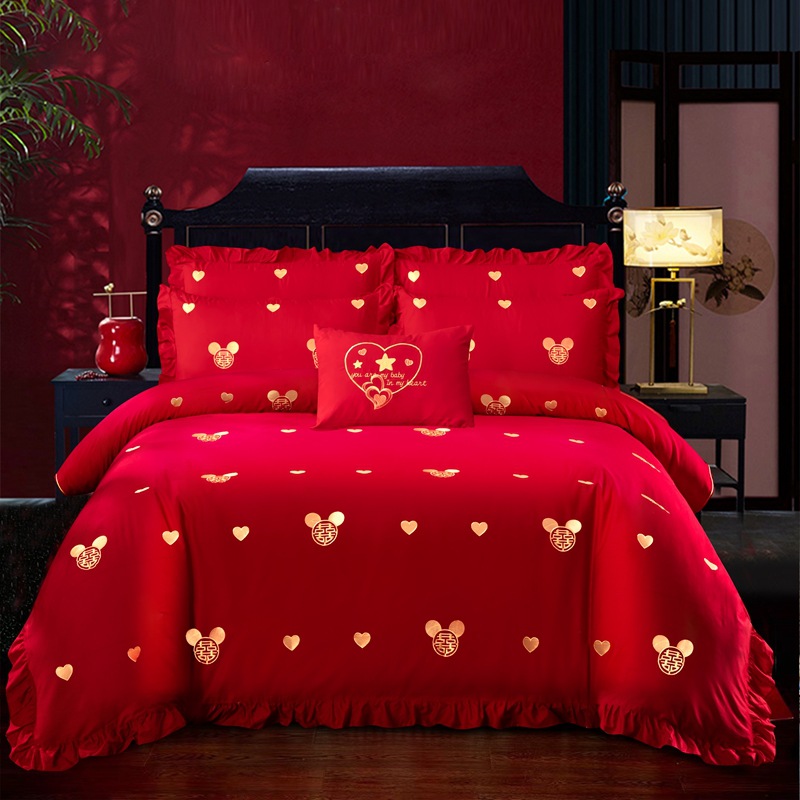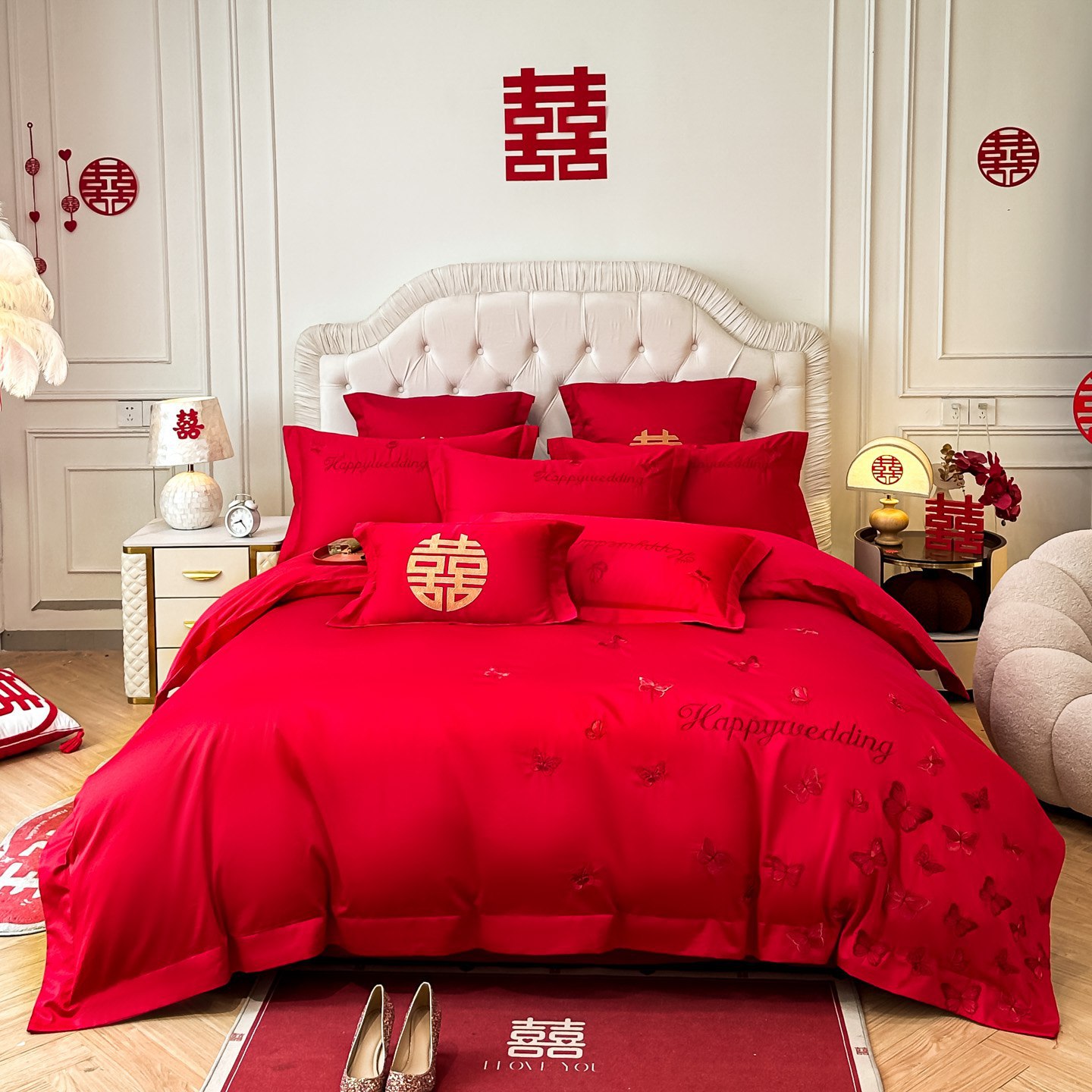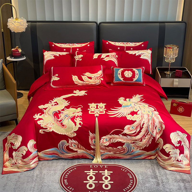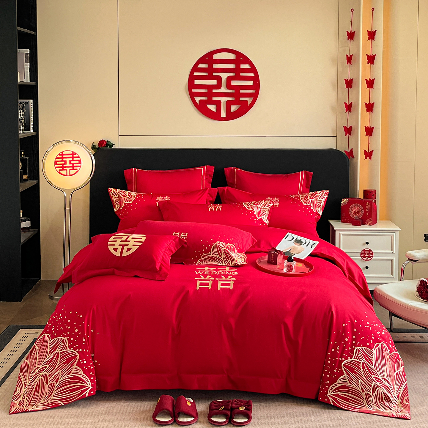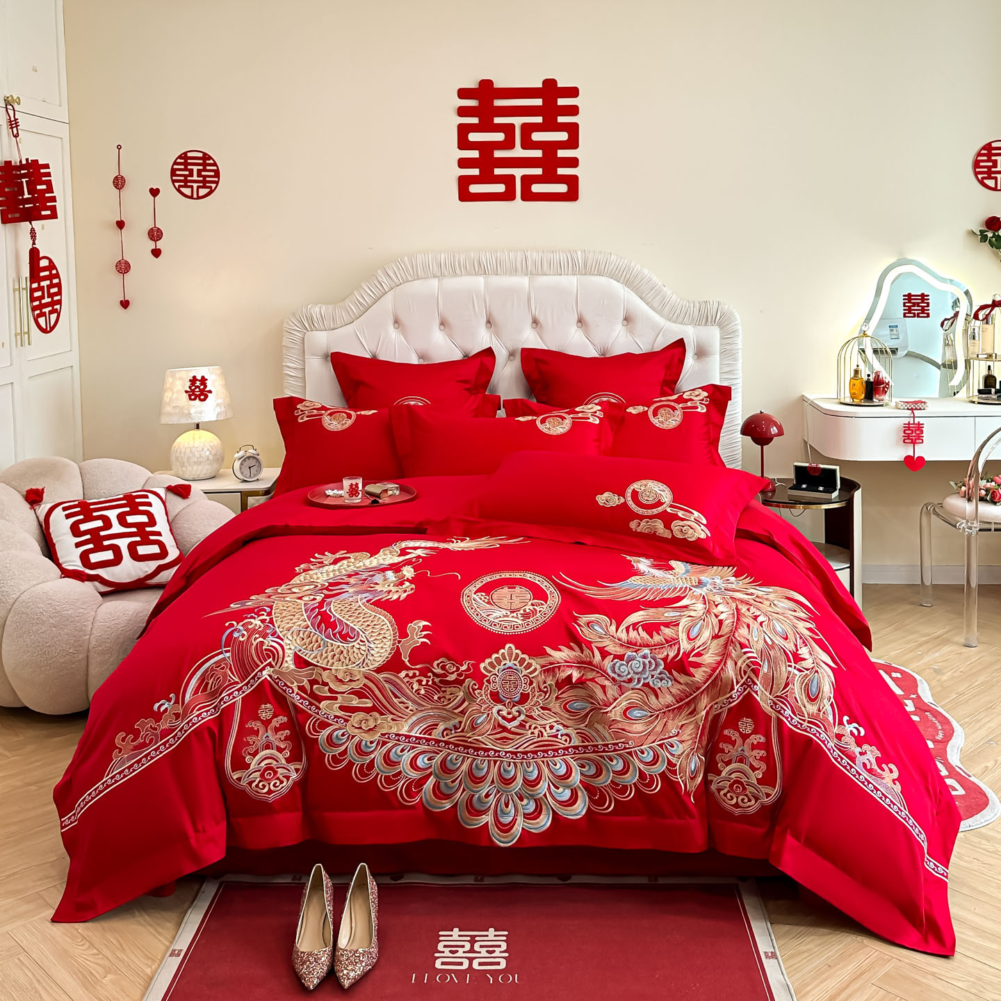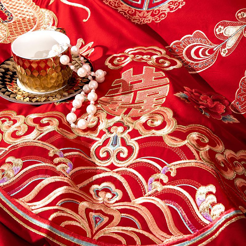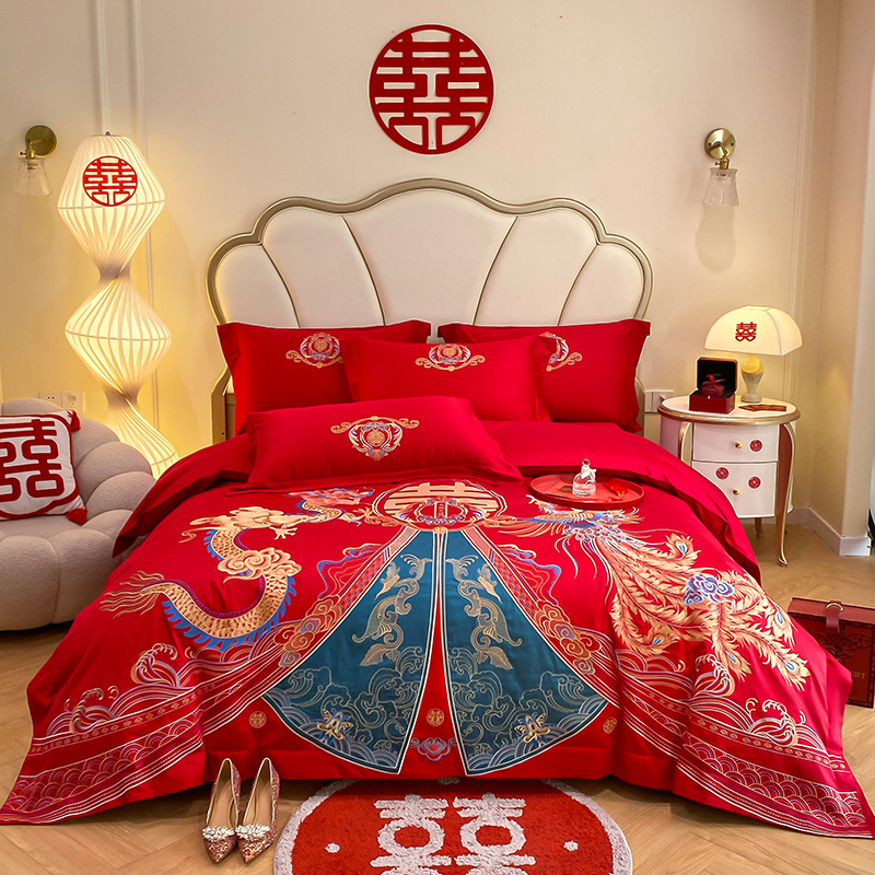 Китайский свадебный комплект из четырех предметов, красное вышитое свадебное одеяло для спальни, вышитый свадебный пододеяльник, комплект постельного белья из шести предметов