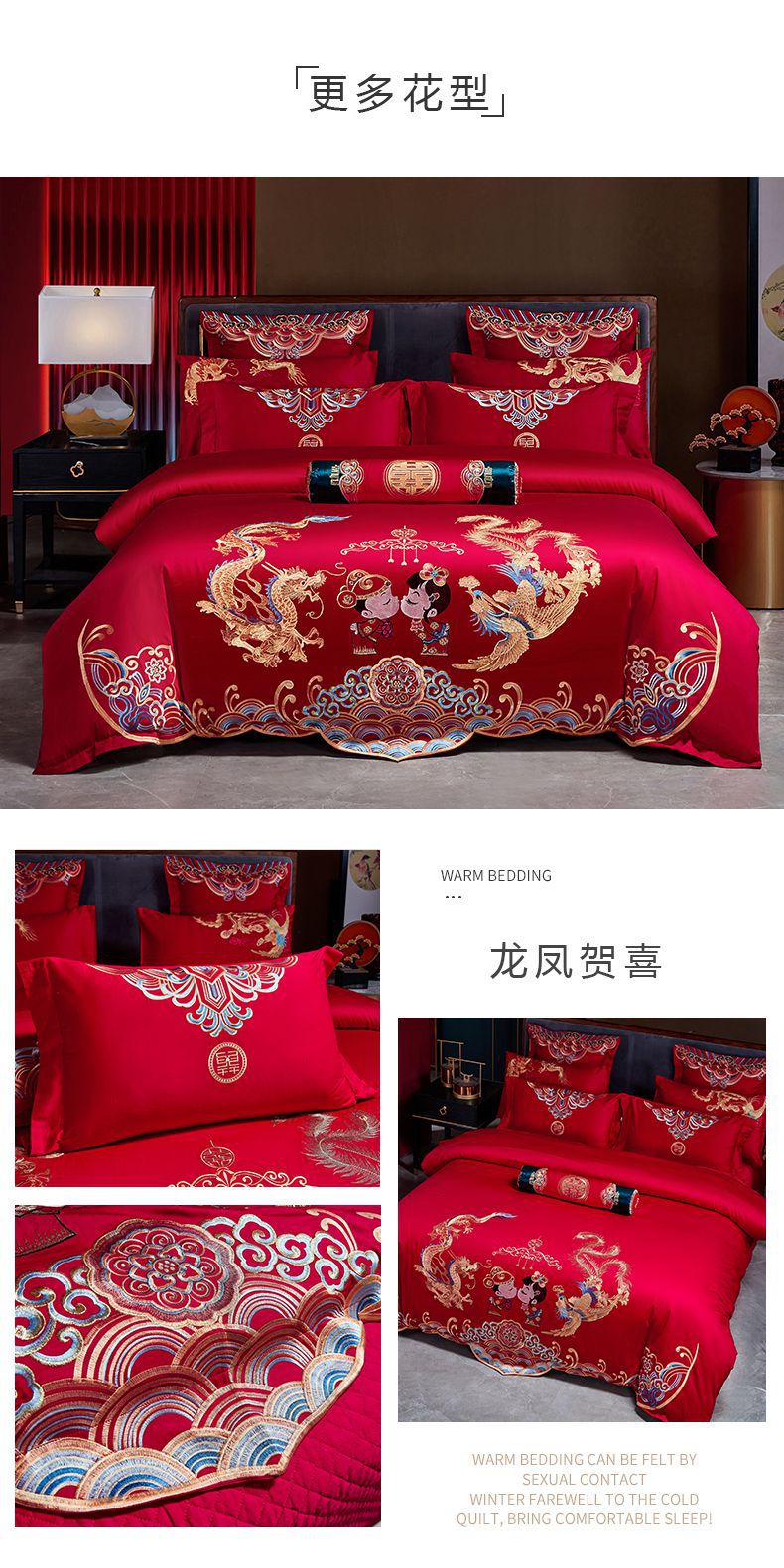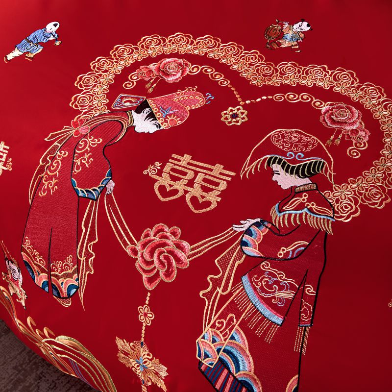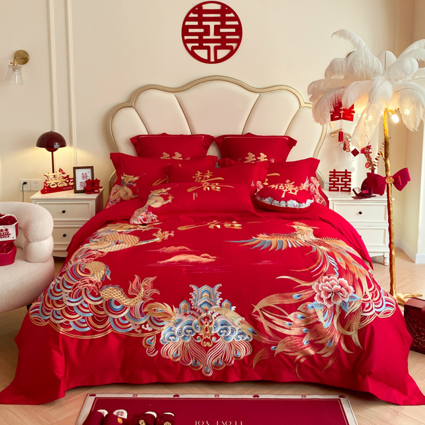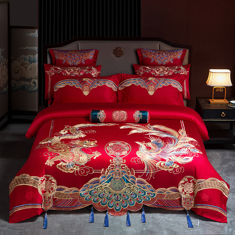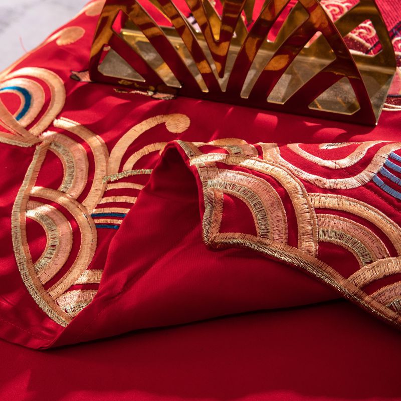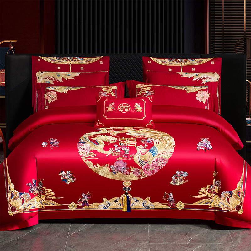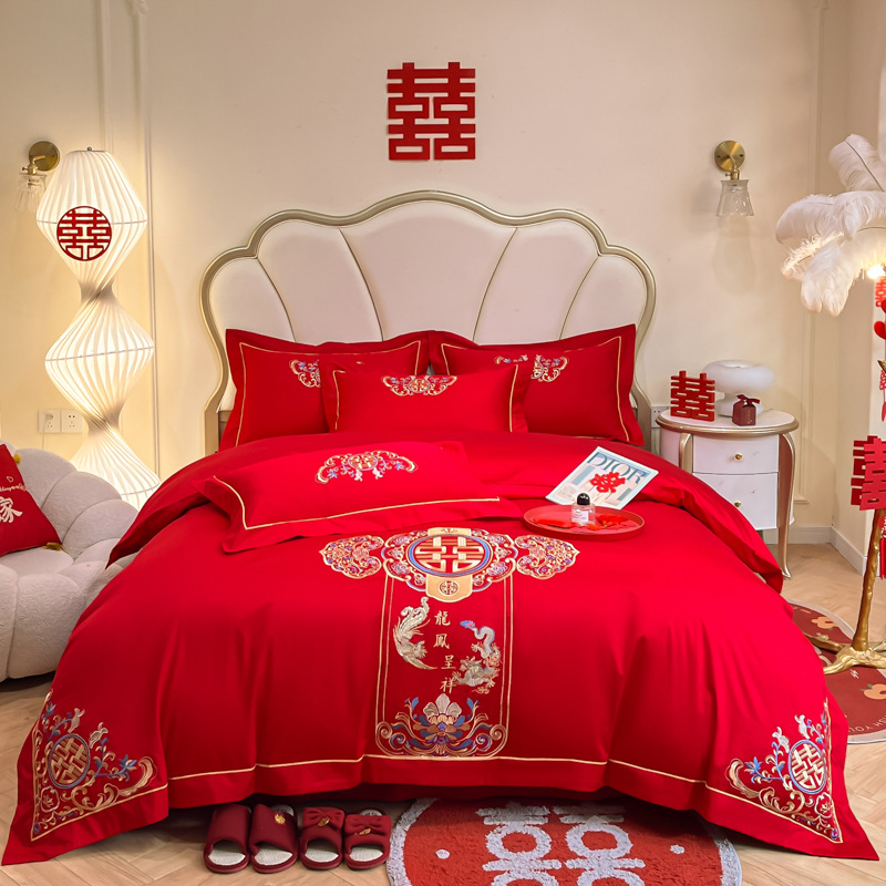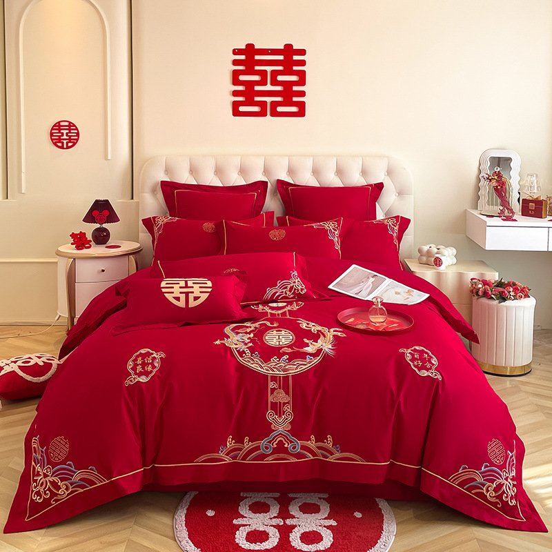 Китайский свадебный комплект из четырех предметов, красное вышитое свадебное одеяло для спальни, вышитый свадебный пододеяльник, комплект постельного белья из шести предметов